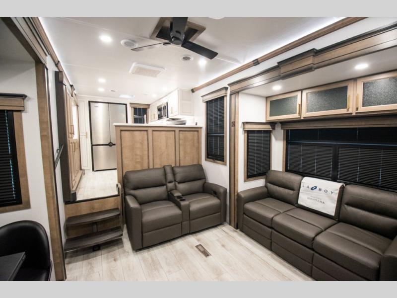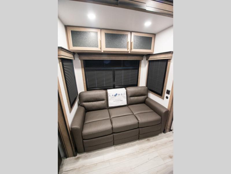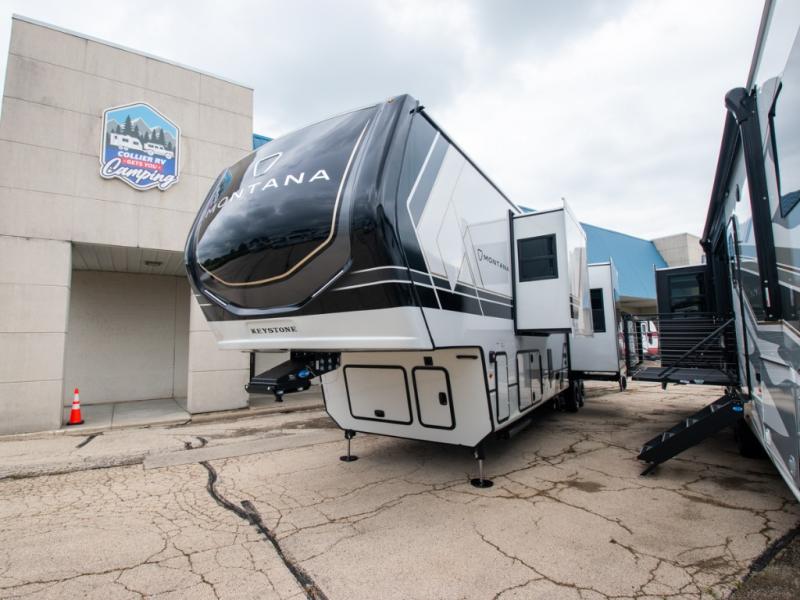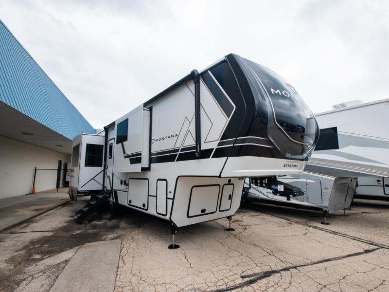 Enjoy luxury, innovation, and the outdoors in any one of Montana's finest fifth wheels. Each set the standard with exceptional features, and exciting factory installed options to provide you a great home on the road. Keystone's 12" I-beam chassis with z-frame technology provides a strong and durable foundation to your fifth wheel, and the four season living package will help extend your camping season. A few other construction features you will appreciate include a MORryde CRE3000 suspension, a fully walkable roof with an alpha seamless TPO membrane system, and 4k square frameless tinted safety glass windows. Each feature stylish interiors with two decor choices paired with beautiful hardwood cabinetry, Beauflor vinyl flooring throughout, central vacuum, plus a La-Z-Boy furniture package for all-around comfort!