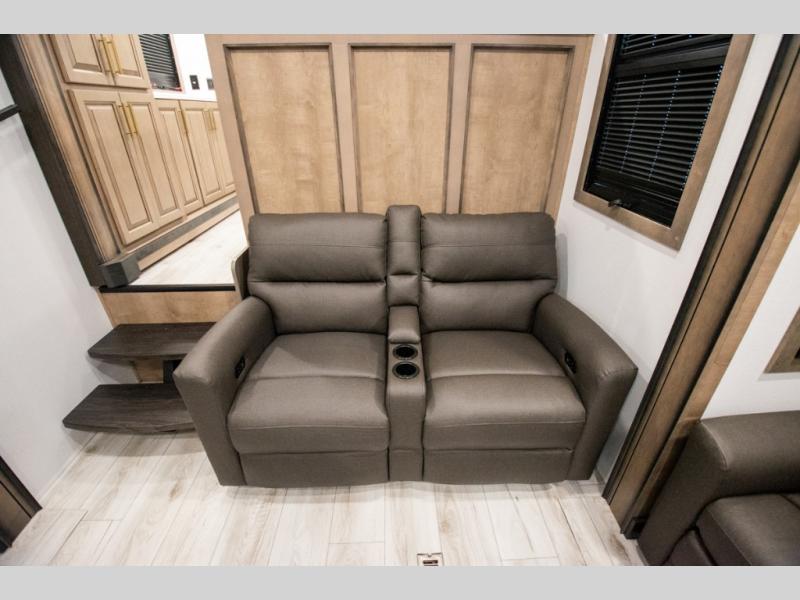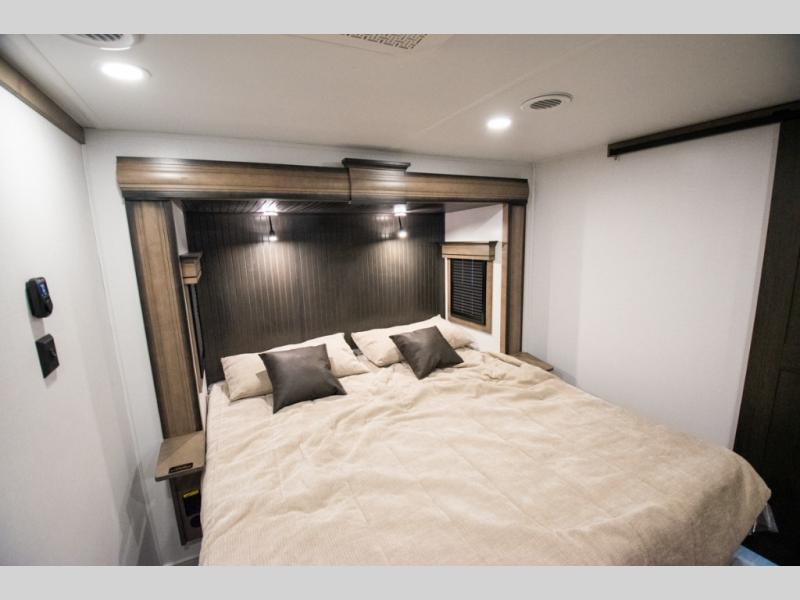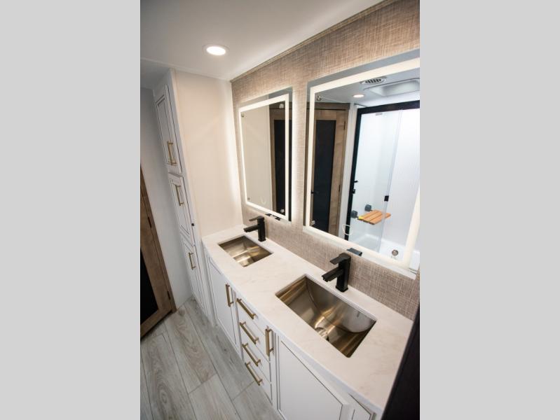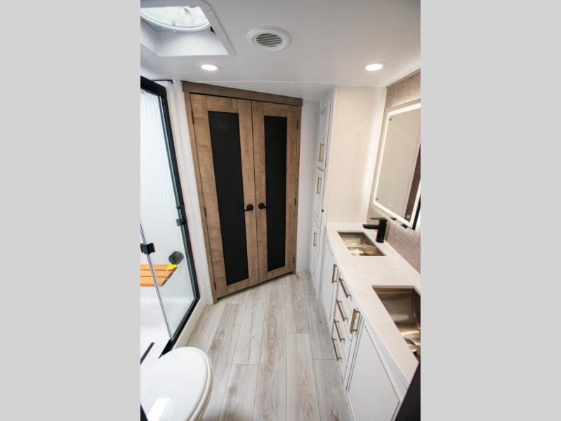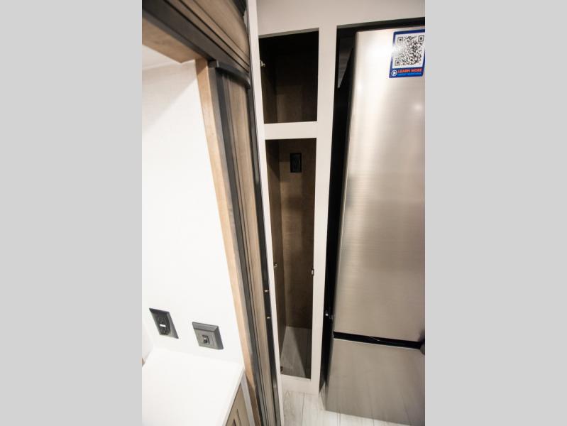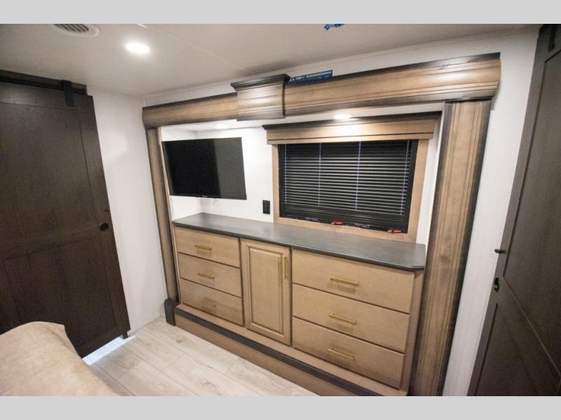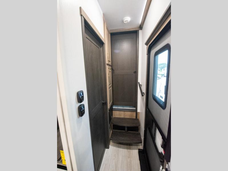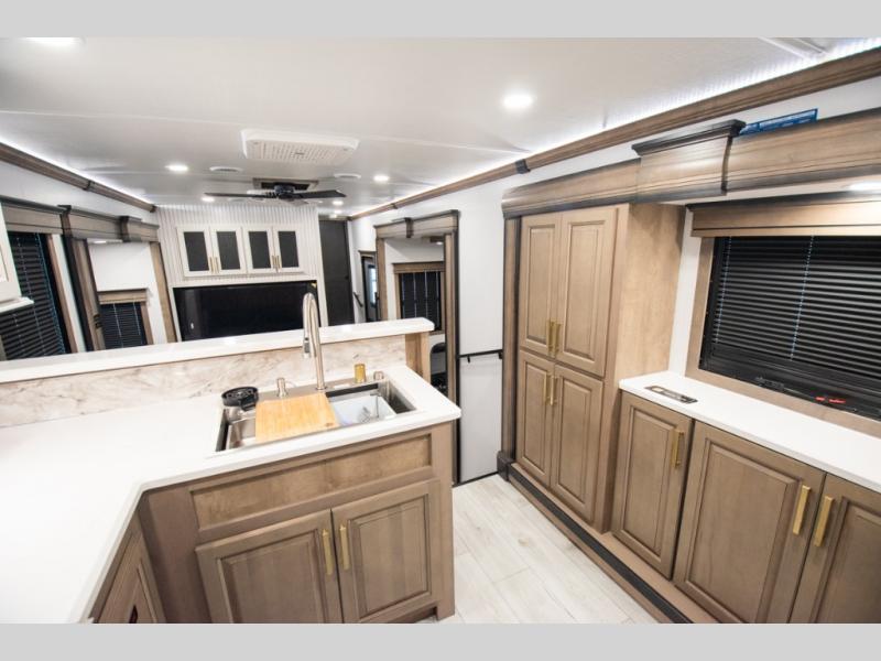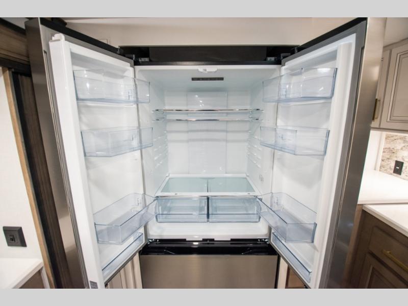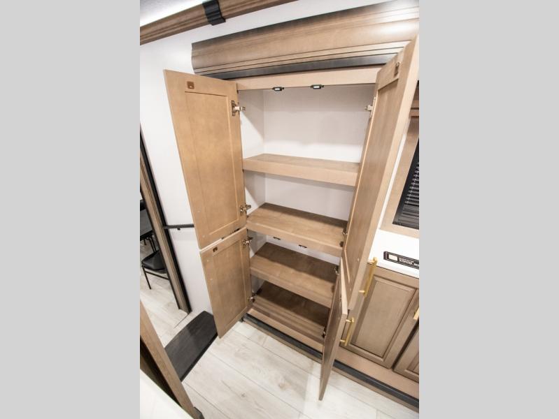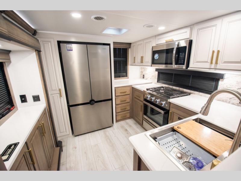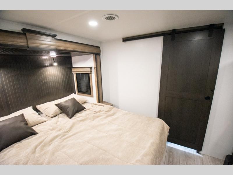 The perfect RV when you like to take "home"' with you when you travel! This Montana fifth wheel gives you the space you want and it feels like home with plenty of features to love and keep you comfortable when you are out enjoying your adventures. Five slides in total give each space plenty of room, the raised rear kitchen has everything you need to cook up meals and snacks just like at home. An 18 cu. ft. residential refrigerator with an ice maker, convection microwave oven and large sink, plus pantry space will make any chef happy. The mid-coach space just inside the door features a living room and half bath for convenience. There is also a pivot dinette within the roadside slide. Step up in front through a sliding barn door to a double slide space with a king bed and dresser. A second sliding door leads into the front spacious master bath featuring dual sinks, a 48" x 30" shower, and a large walk-in wardrobe with washer and dryer prep!