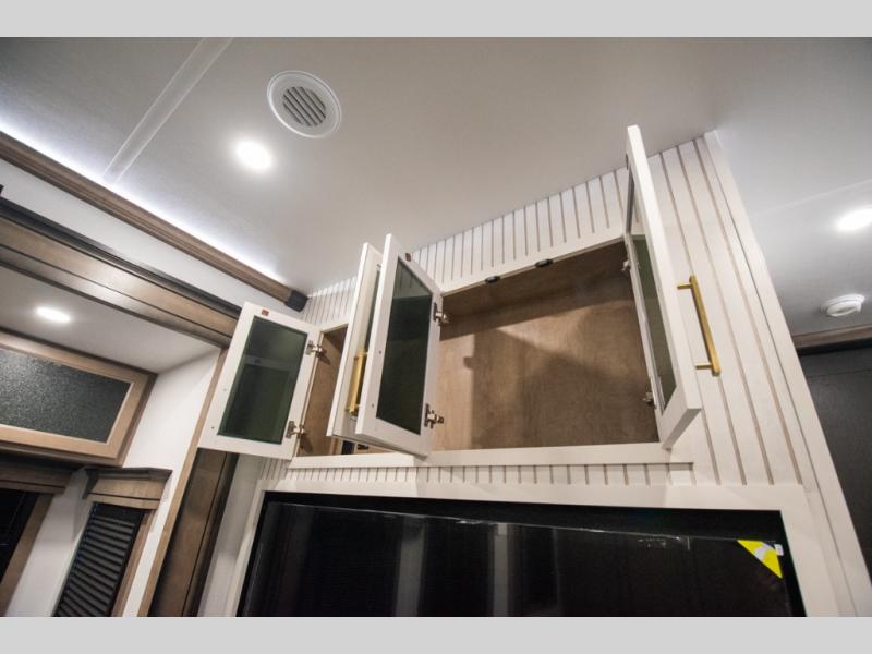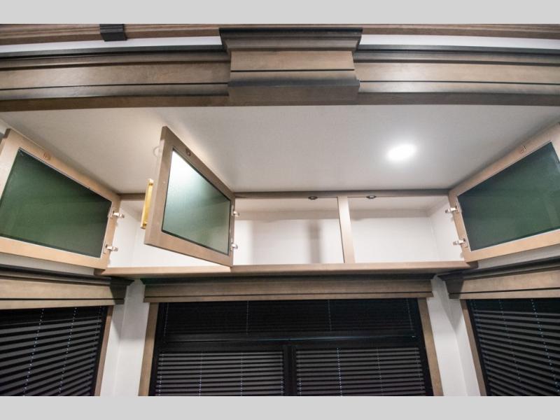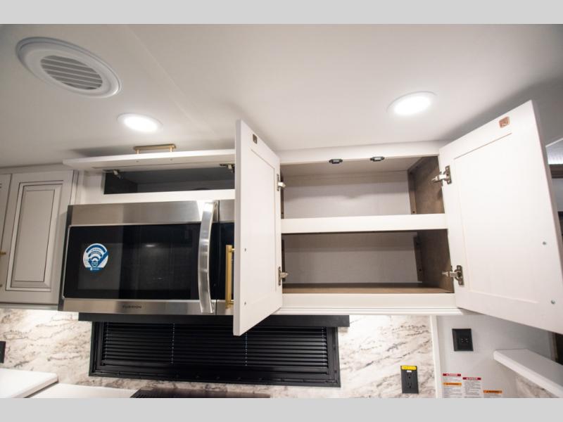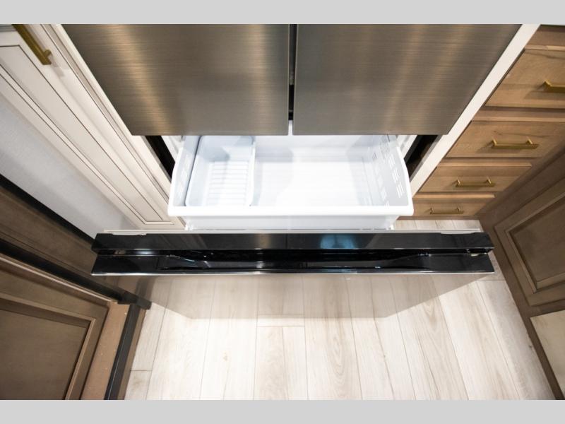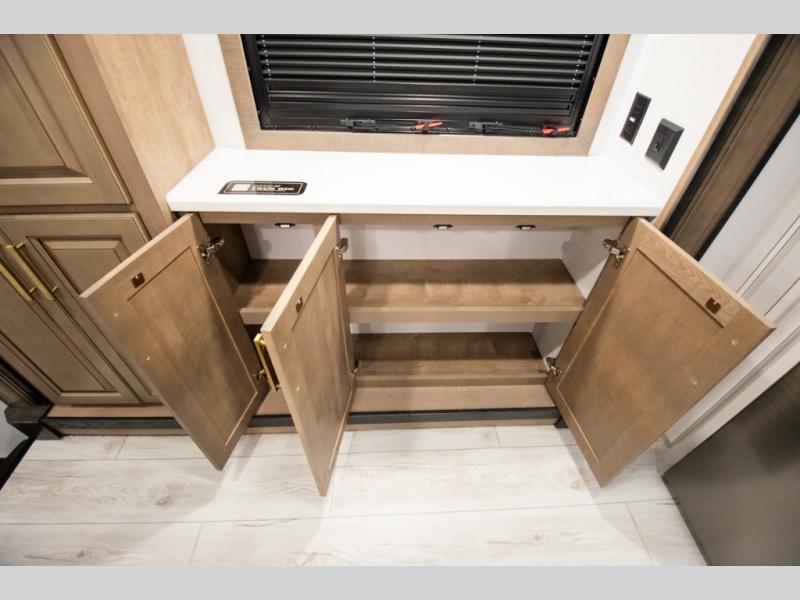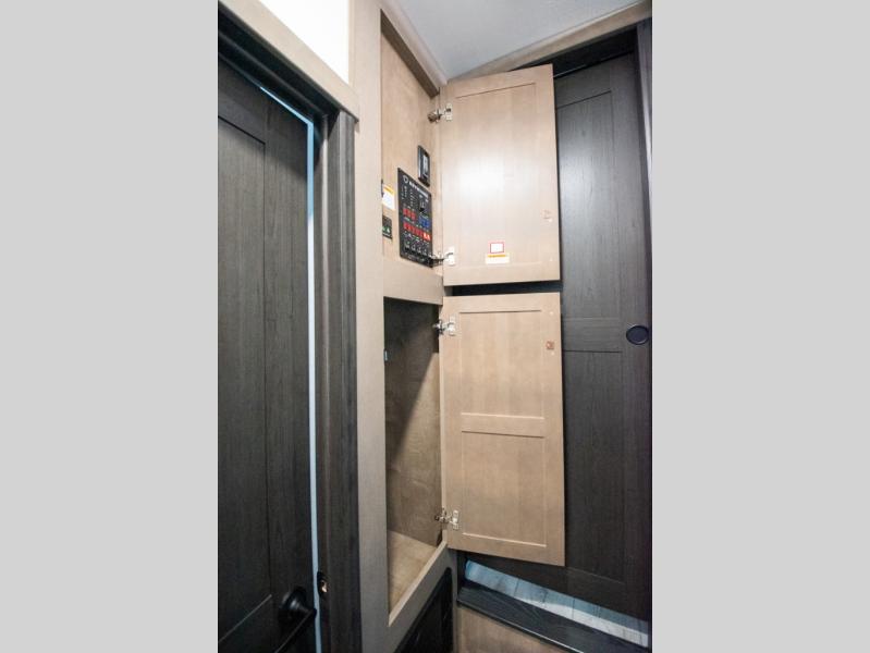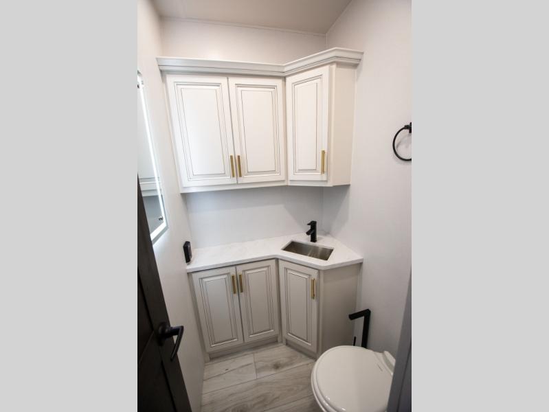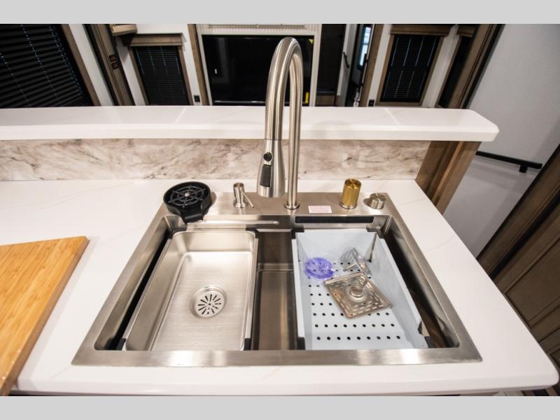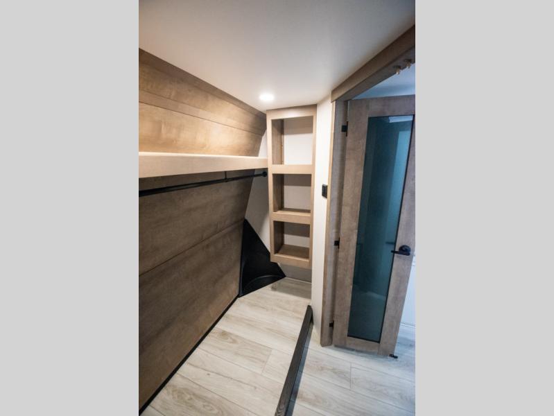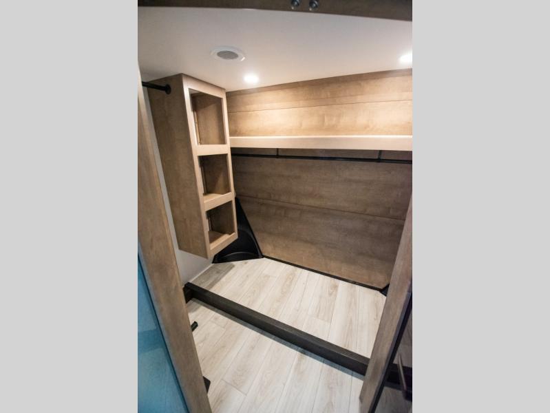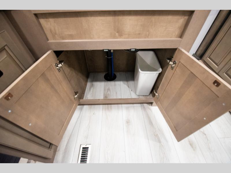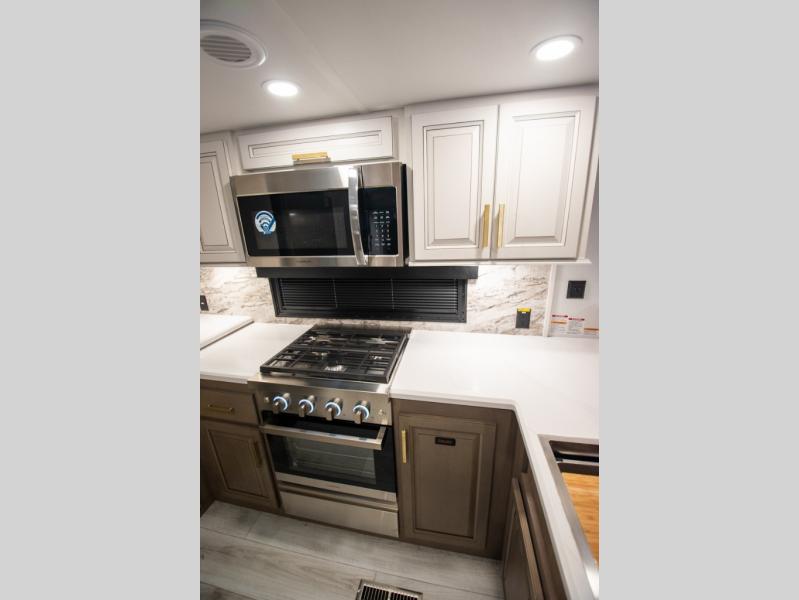 The perfect RV when you like to take "home"' with you when you travel! This Montana fifth wheel gives you the space you want and it feels like home with plenty of features to love and keep you comfortable when you are out enjoying your adventures. Five slides in total give each space plenty of room, the raised rear kitchen has everything you need to cook up meals and snacks just like at home. An 18 cu. ft. residential refrigerator with an ice maker, convection microwave oven and large sink, plus pantry space will make any chef happy. The mid-coach space just inside the door features a living room and half bath for convenience. There is also a pivot dinette within the roadside slide. Step up in front through a sliding barn door to a double slide space with a king bed and dresser. A second sliding door leads into the front spacious master bath featuring dual sinks, a 48" x 30" shower, and a large walk-in wardrobe with washer and dryer prep!