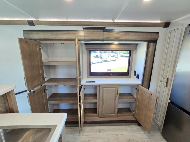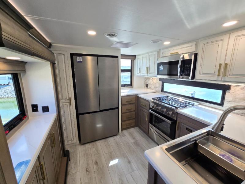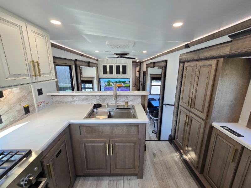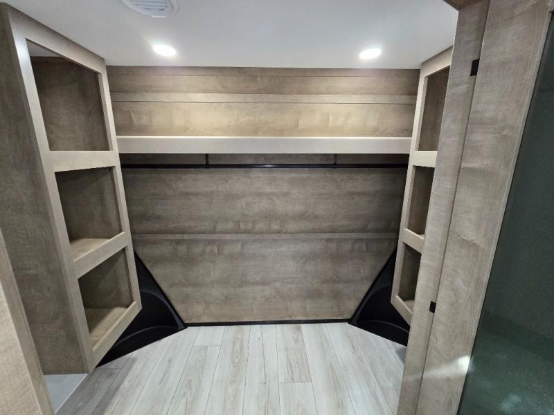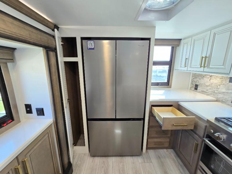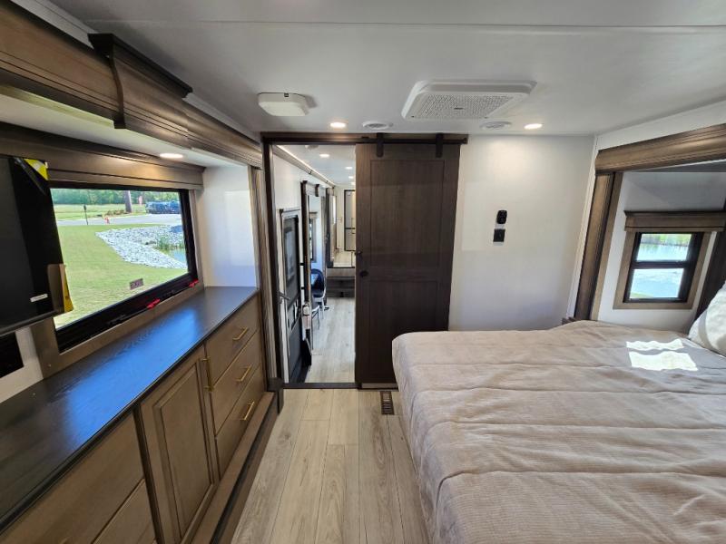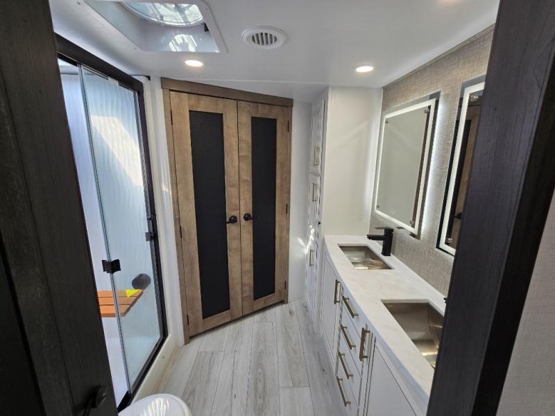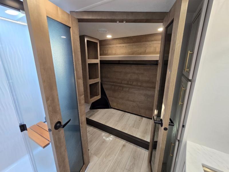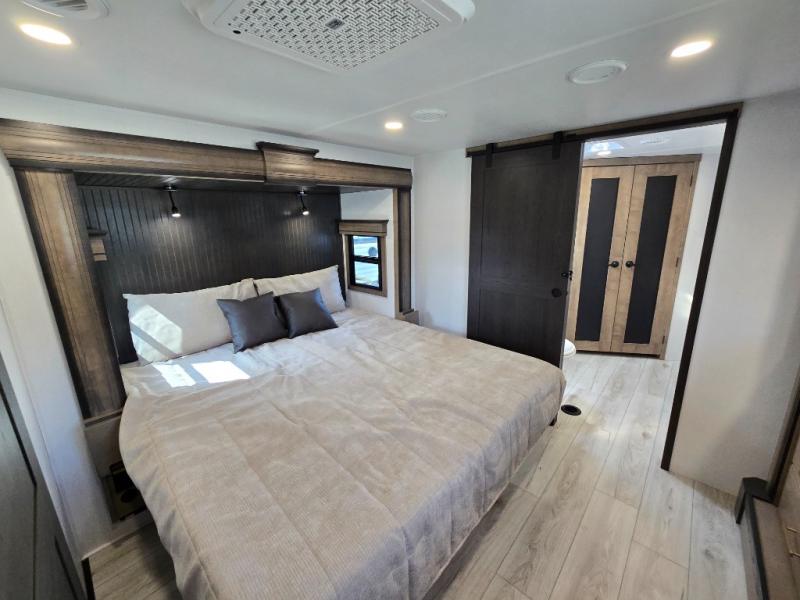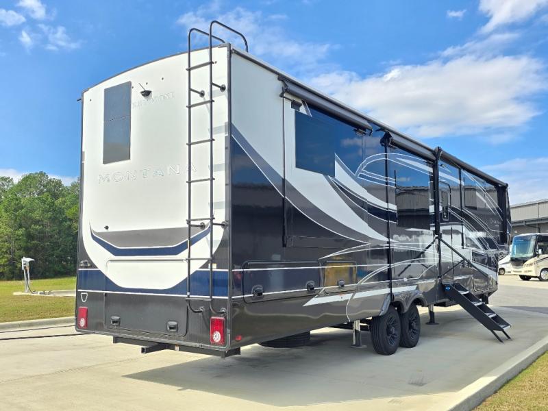 The perfect RV when you like to take "home"' with you when you travel! This Montana fifth wheel gives you the space you want and it feels like home with plenty of features to love and keep you comfortable when you are out enjoying your adventures. Five slides in total give each space plenty of room, the raised rear kitchen has everything you need to cook up meals and snacks just like at home. An 18 cu. ft. residential refrigerator with an ice maker, convection microwave oven and large sink, plus pantry space will make any chef happy. The mid-coach space just inside the door features a living room and half bath for convenience. There is also a pivot dinette within the roadside slide. Step up in front through a sliding barn door to a double slide space with a king bed and dresser. A second sliding door leads into the front spacious master bath featuring dual sinks, a 48" x 30" shower, and a large walk-in wardrobe with washer and dryer prep!