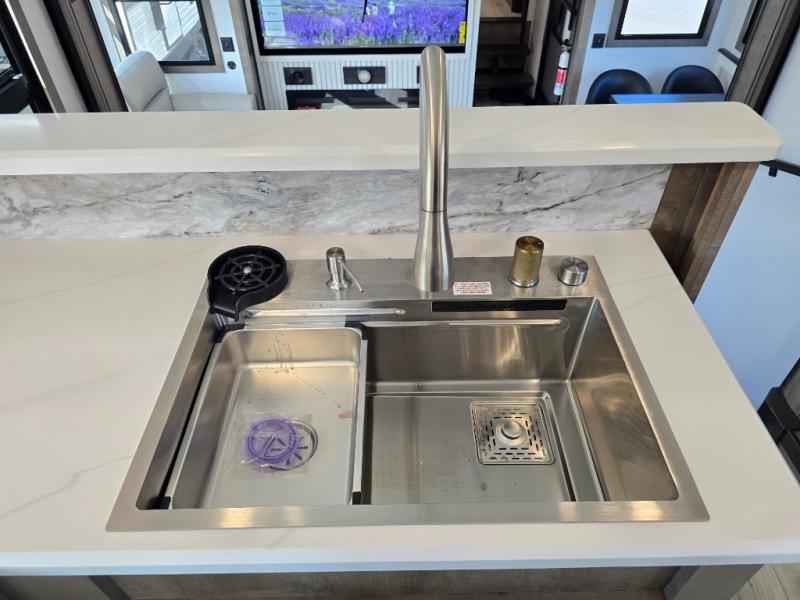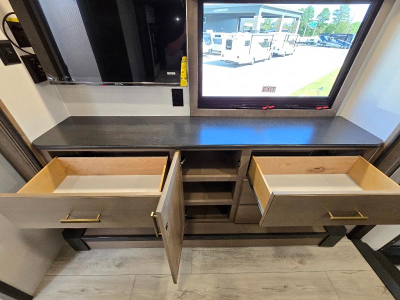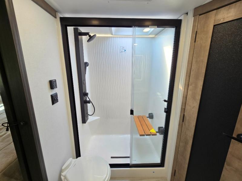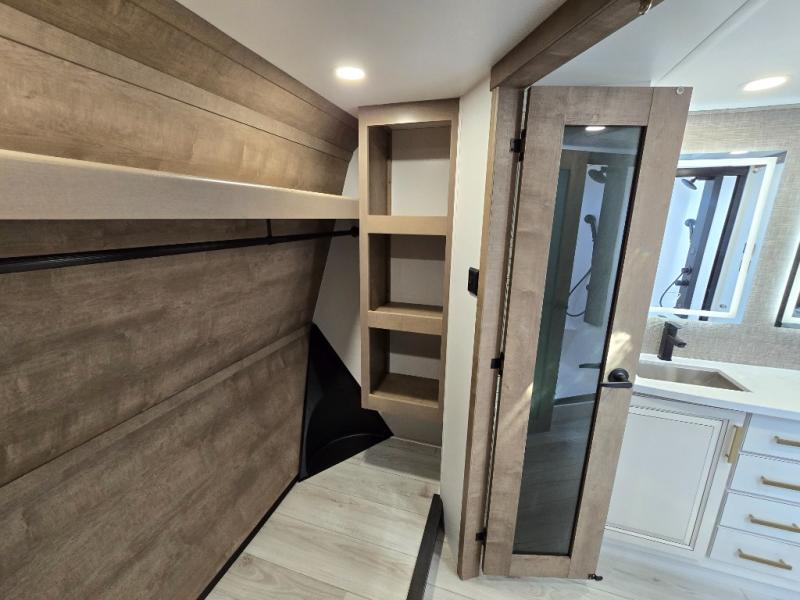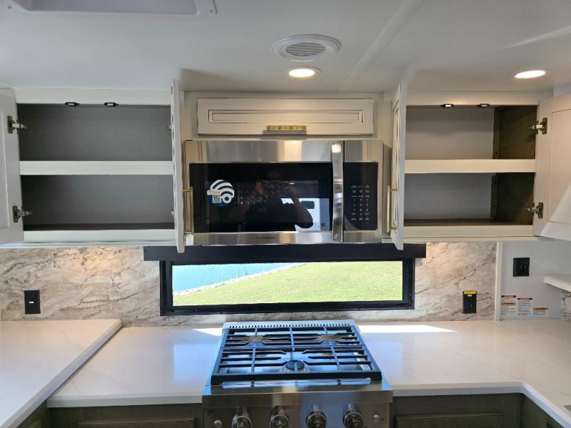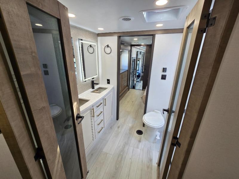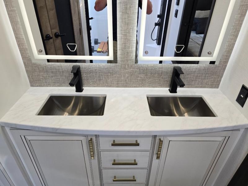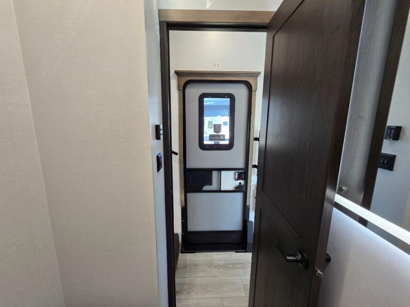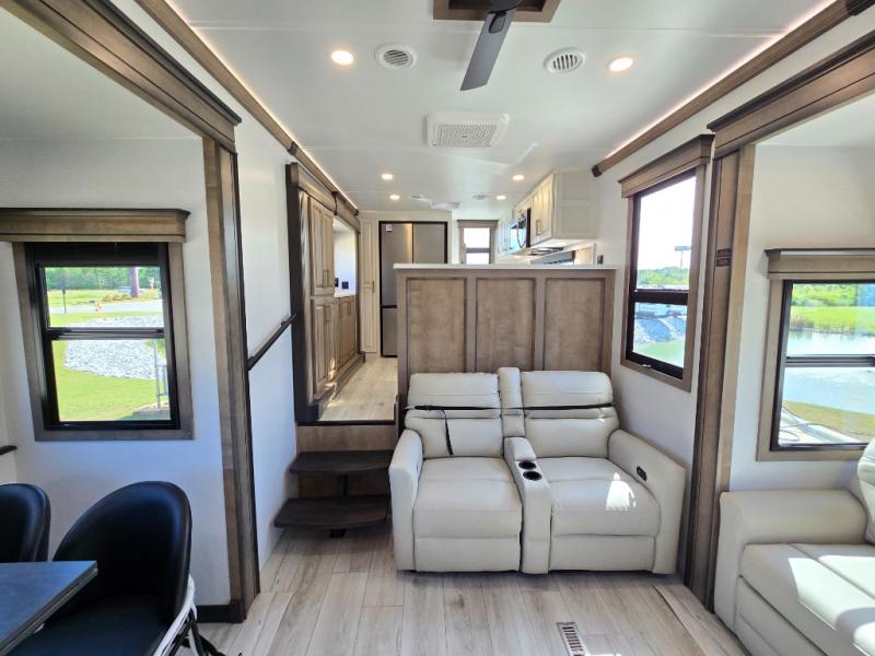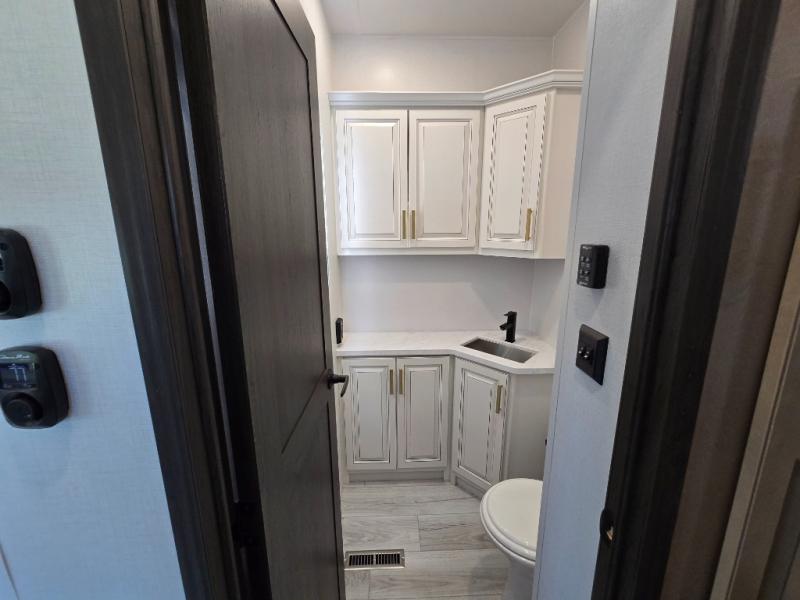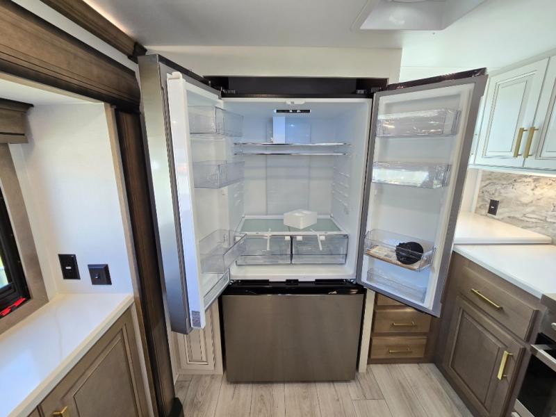The perfect RV when you like to take "home"' with you when you travel! This Montana fifth wheel gives you the space you want and it feels like home with plenty of features to love and keep you comfortable when you are out enjoying your adventures. Five slides in total give each space plenty of room, the raised rear kitchen has everything you need to cook up meals and snacks just like at home. An 18 cu. ft. residential refrigerator with an ice maker, convection microwave oven and large sink, plus pantry space will make any chef happy. The mid-coach space just inside the door features a living room and half bath for convenience. There is also a pivot dinette within the roadside slide. Step up in front through a sliding barn door to a double slide space with a king bed and dresser. A second sliding door leads into the front spacious master bath featuring dual sinks, a 48" x 30" shower, and a large walk-in wardrobe with washer and dryer prep!