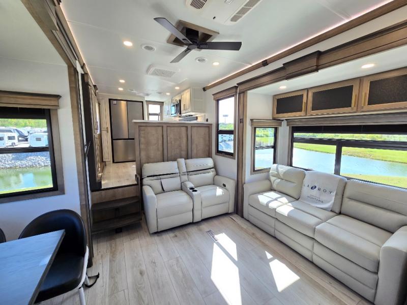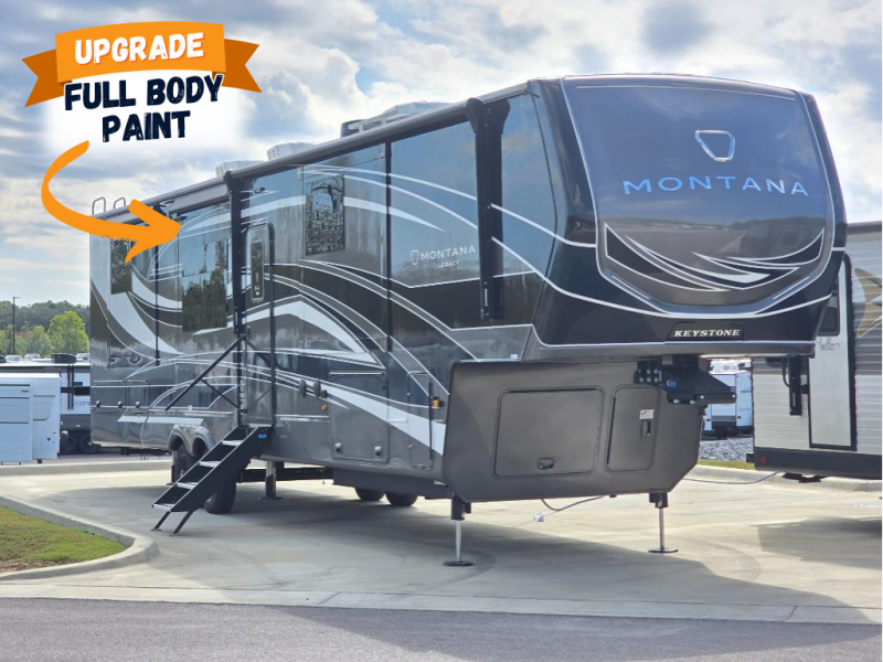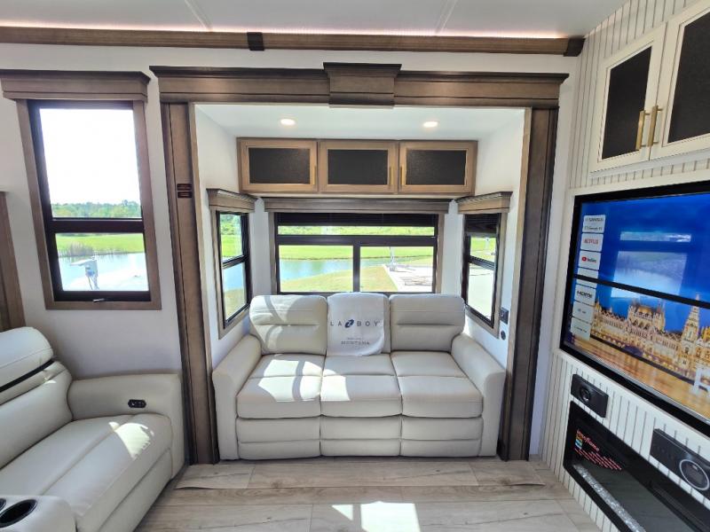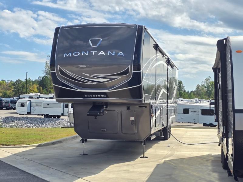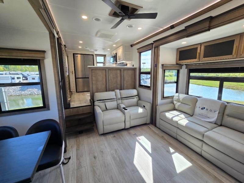 Enjoy luxury, innovation, and the outdoors in any one of Montana's finest fifth wheels. Each set the standard with exceptional features, and exciting factory installed options to provide you a great home on the road. Keystone's 12" I-beam chassis with z-frame technology provides a strong and durable foundation to your fifth wheel, and the four season living package will help extend your camping season. A few other construction features you will appreciate include a MORryde CRE3000 suspension, a fully walkable roof with an alpha seamless TPO membrane system, and 4k square frameless tinted safety glass windows. Each feature stylish interiors with two decor choices paired with beautiful hardwood cabinetry, Beauflor vinyl flooring throughout, central vacuum, plus a La-Z-Boy furniture package for all-around comfort!