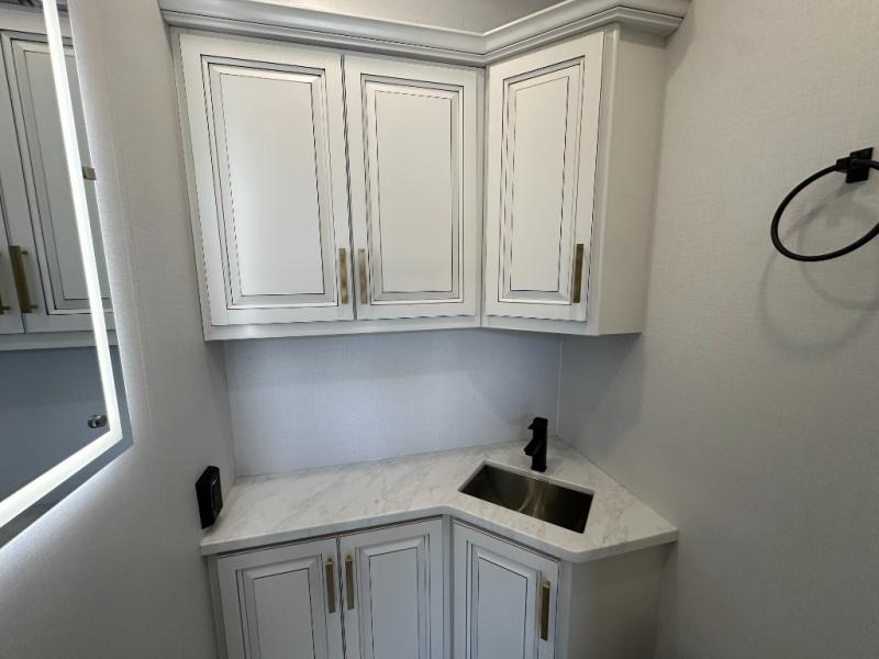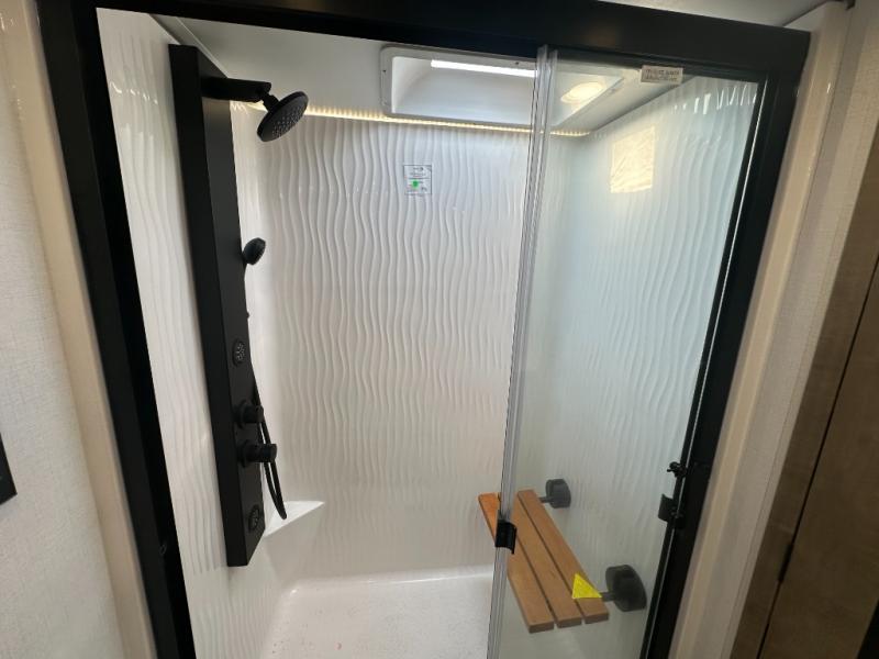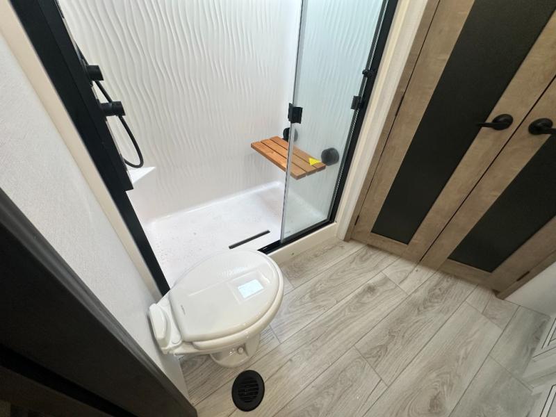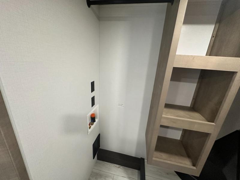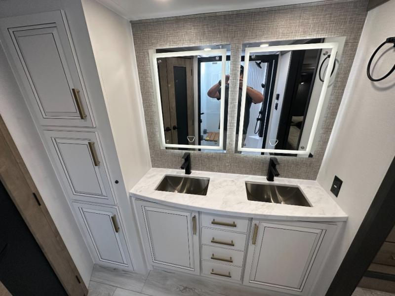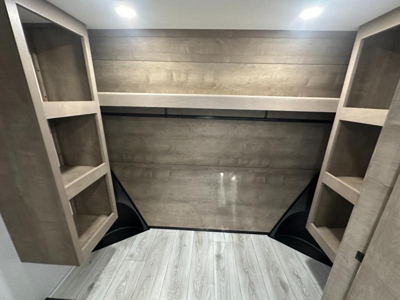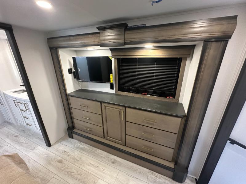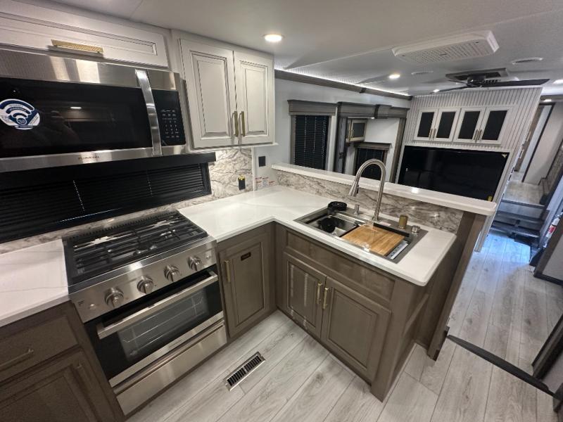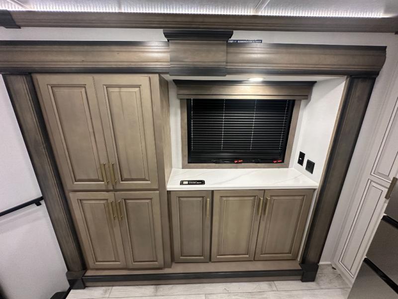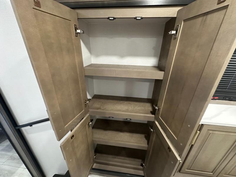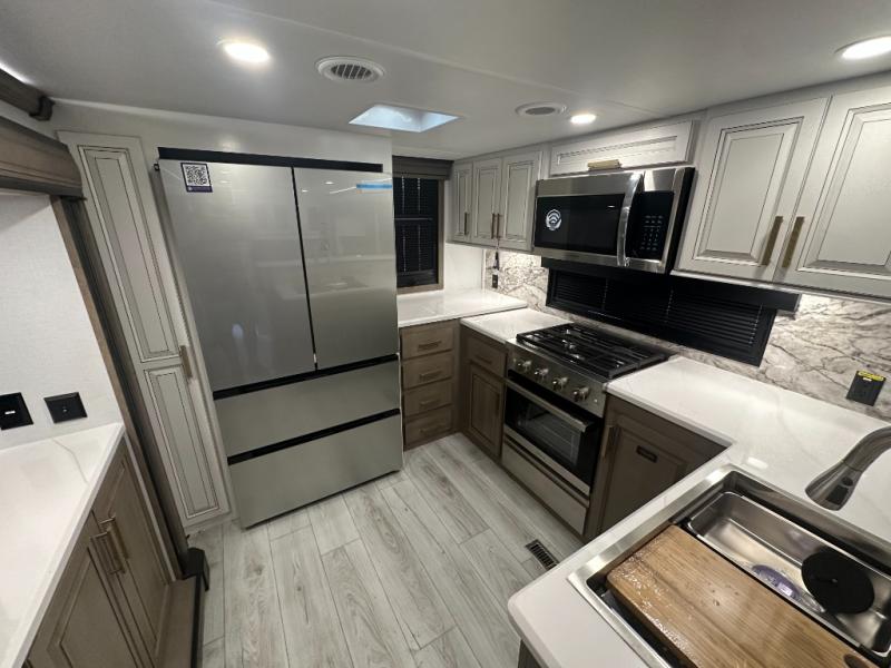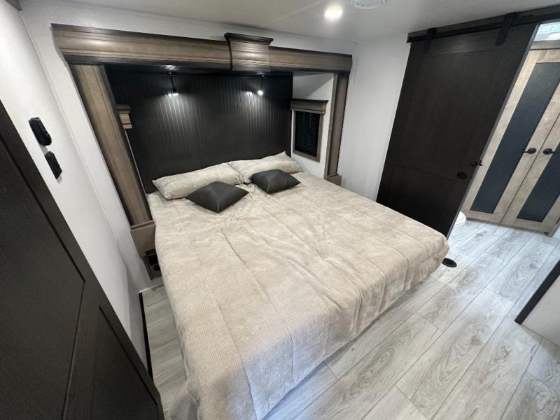 The perfect RV when you like to take "home"' with you when you travel! This Montana fifth wheel gives you the space you want and it feels like home with plenty of features to love and keep you comfortable when you are out enjoying your adventures. Five slides in total give each space plenty of room, the raised rear kitchen has everything you need to cook up meals and snacks just like at home. An 18 cu. ft. residential refrigerator with an ice maker, convection microwave oven and large sink, plus pantry space will make any chef happy. The mid-coach space just inside the door features a living room and half bath for convenience. There is also a pivot dinette within the roadside slide. Step up in front through a sliding barn door to a double slide space with a king bed and dresser. A second sliding door leads into the front spacious master bath featuring dual sinks, a 48" x 30" shower, and a large walk-in wardrobe with washer and dryer prep!