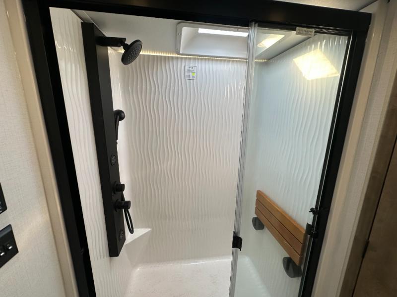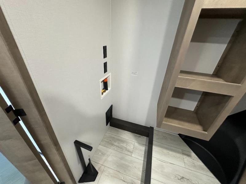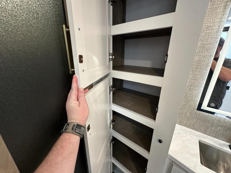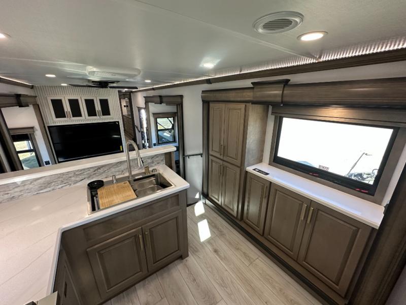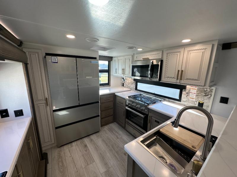 The perfect RV when you like to take "home"' with you when you travel! This Montana fifth wheel gives you the space you want and it feels like home with plenty of features to love and keep you comfortable when you are out enjoying your adventures. Five slides in total give each space plenty of room, the raised rear kitchen has everything you need to cook up meals and snacks just like at home. An 18 cu. ft. residential refrigerator with an ice maker, convection microwave oven and large sink, plus pantry space will make any chef happy. The mid-coach space just inside the door features a living room and half bath for convenience. There is also a pivot dinette within the roadside slide. Step up in front through a sliding barn door to a double slide space with a king bed and dresser. A second sliding door leads into the front spacious master bath featuring dual sinks, a 48" x 30" shower, and a large walk-in wardrobe with washer and dryer prep!