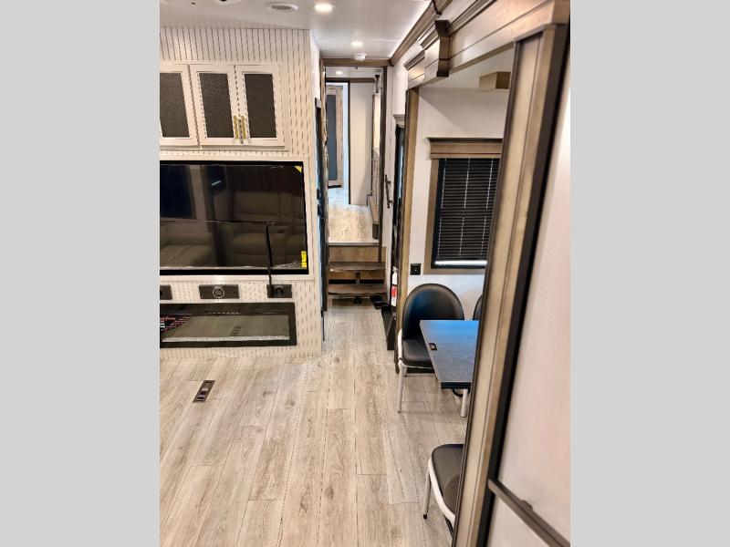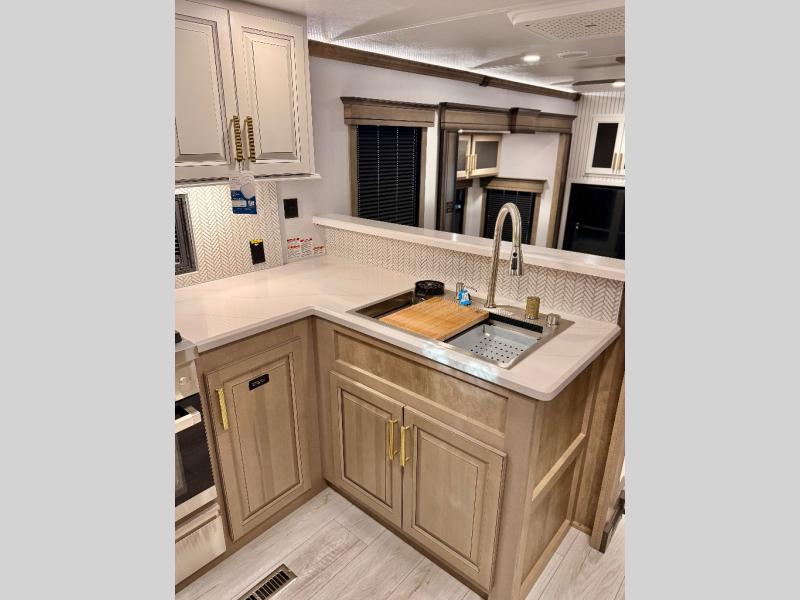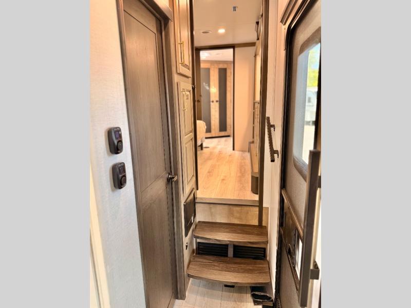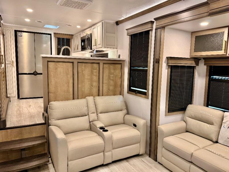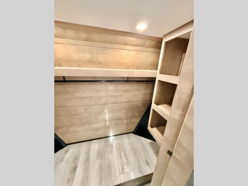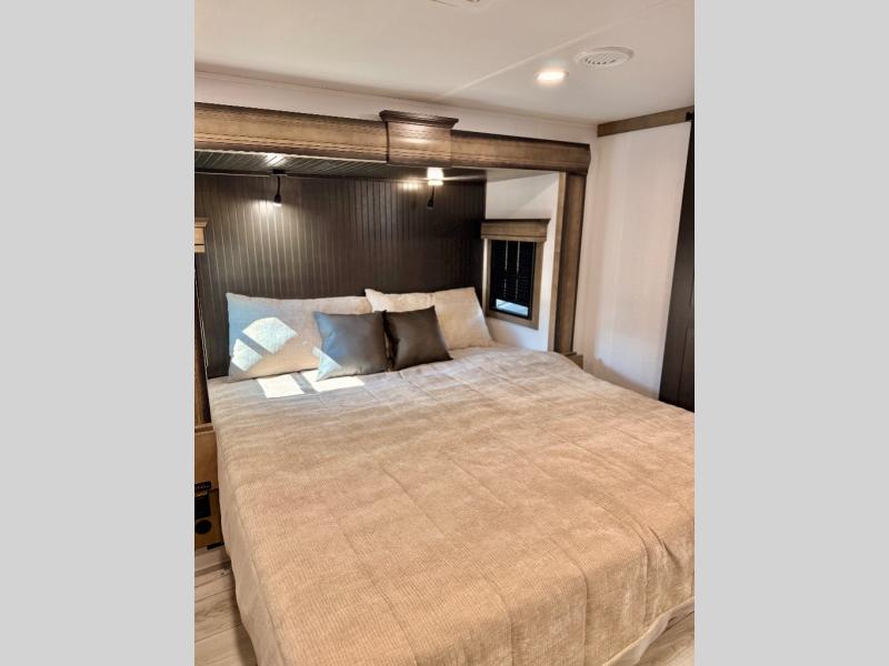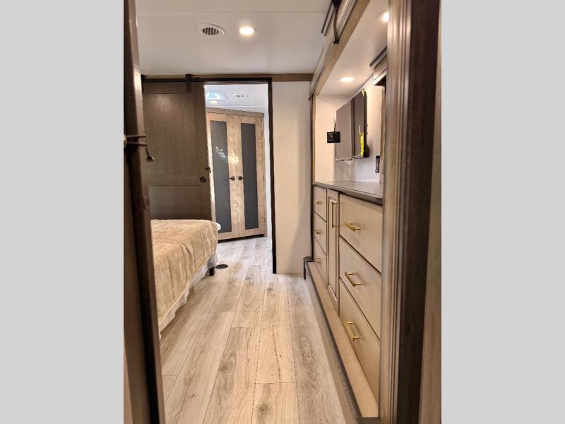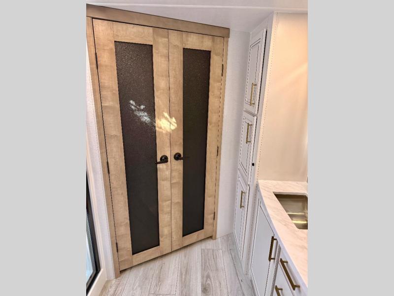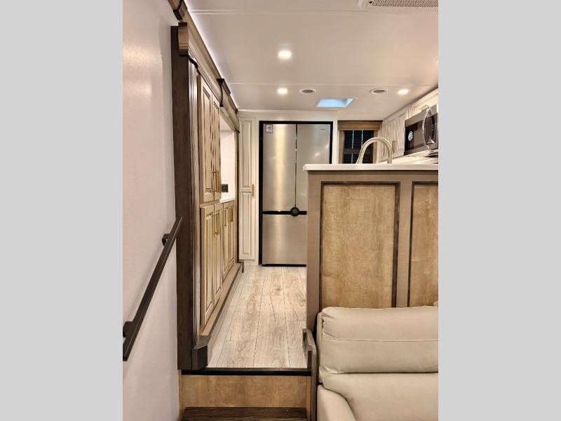 The perfect RV when you like to take "home"' with you when you travel! This Montana fifth wheel gives you the space you want and it feels like home with plenty of features to love and keep you comfortable when you are out enjoying your adventures. Five slides in total give each space plenty of room, the raised rear kitchen has everything you need to cook up meals and snacks just like at home. An 18 cu. ft. residential refrigerator with an ice maker, convection microwave oven and large sink, plus pantry space will make any chef happy. The mid-coach space just inside the door features a living room and half bath for convenience. There is also a pivot dinette within the roadside slide. Step up in front through a sliding barn door to a double slide space with a king bed and dresser. A second sliding door leads into the front spacious master bath featuring dual sinks, a 48" x 30" shower, and a large walk-in wardrobe with washer and dryer prep!