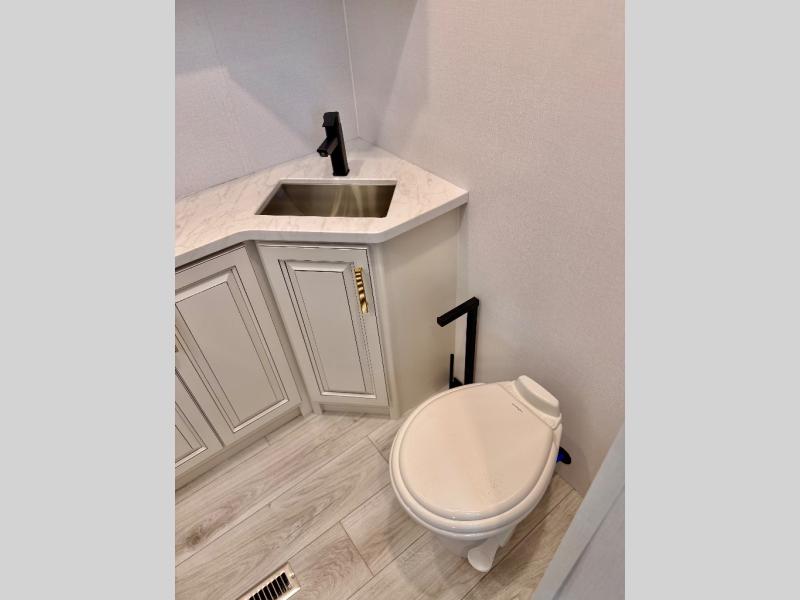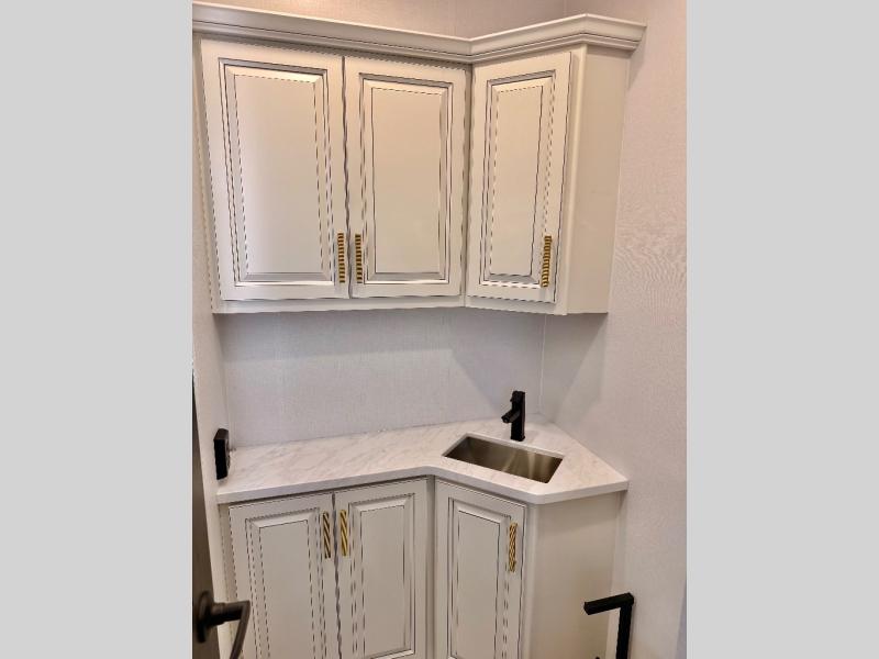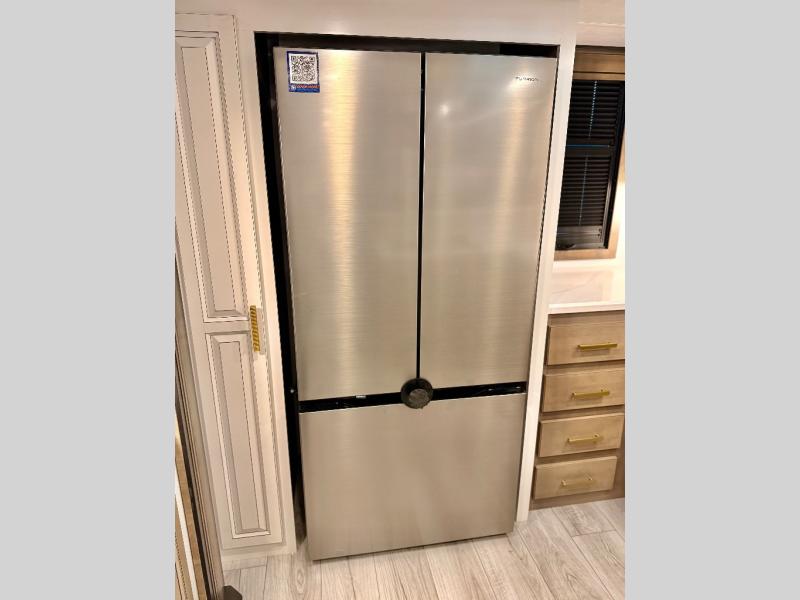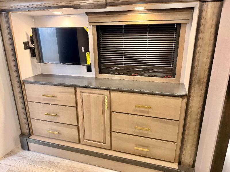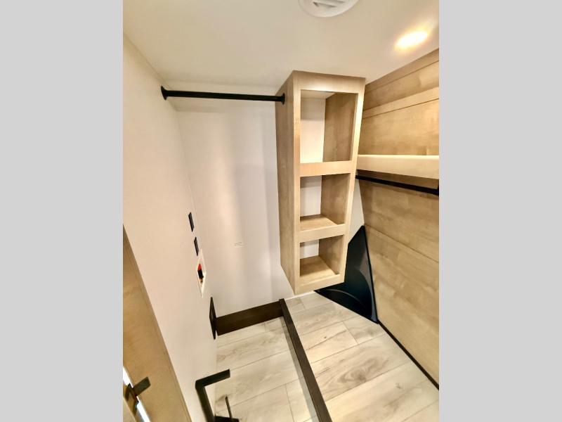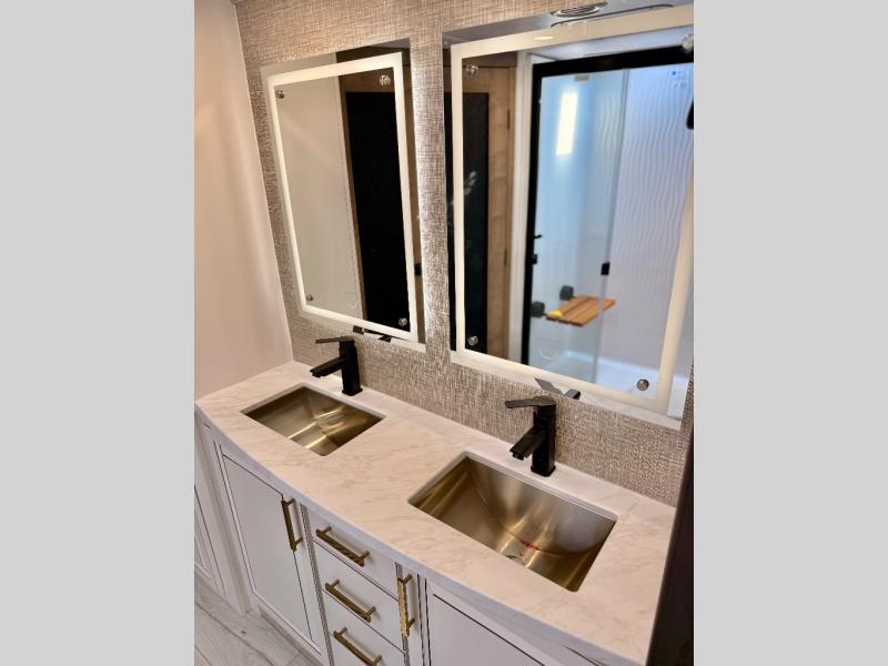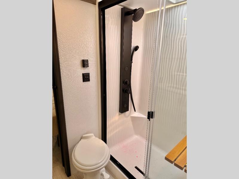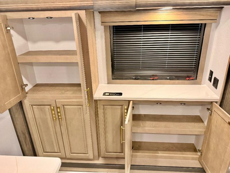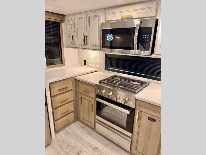 The perfect RV when you like to take "home"' with you when you travel! This Montana fifth wheel gives you the space you want and it feels like home with plenty of features to love and keep you comfortable when you are out enjoying your adventures. Five slides in total give each space plenty of room, the raised rear kitchen has everything you need to cook up meals and snacks just like at home. An 18 cu. ft. residential refrigerator with an ice maker, convection microwave oven and large sink, plus pantry space will make any chef happy. The mid-coach space just inside the door features a living room and half bath for convenience. There is also a pivot dinette within the roadside slide. Step up in front through a sliding barn door to a double slide space with a king bed and dresser. A second sliding door leads into the front spacious master bath featuring dual sinks, a 48" x 30" shower, and a large walk-in wardrobe with washer and dryer prep!