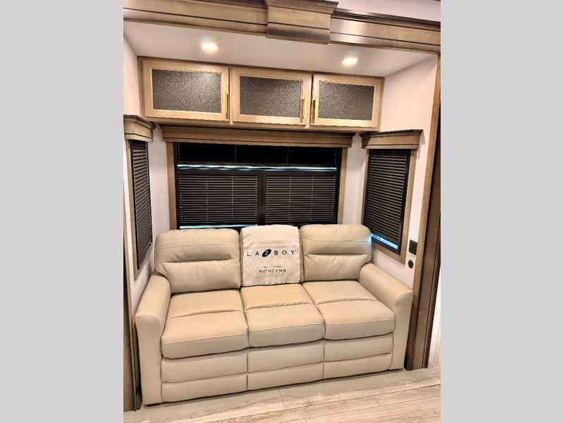 Enjoy luxury, innovation, and the outdoors in any one of Montana's finest fifth wheels. Each set the standard with exceptional features, and exciting factory installed options to provide you a great home on the road. Keystone's 12" I-beam chassis with z-frame technology provides a strong and durable foundation to your fifth wheel, and the four season living package will help extend your camping season. A few other construction features you will appreciate include a MORryde CRE3000 suspension, a fully walkable roof with an alpha seamless TPO membrane system, and 4k square frameless tinted safety glass windows. Each feature stylish interiors with two decor choices paired with beautiful hardwood cabinetry, Beauflor vinyl flooring throughout, central vacuum, plus a La-Z-Boy furniture package for all-around comfort!