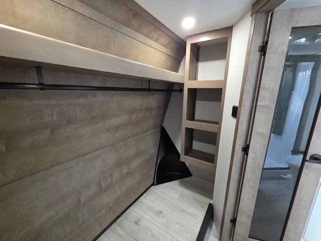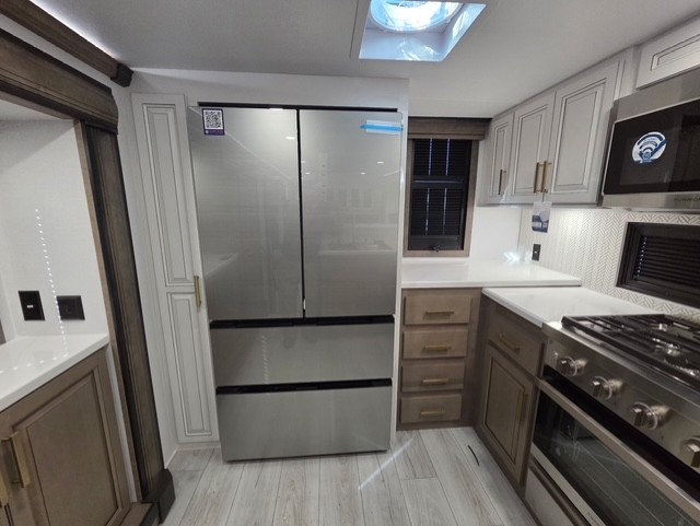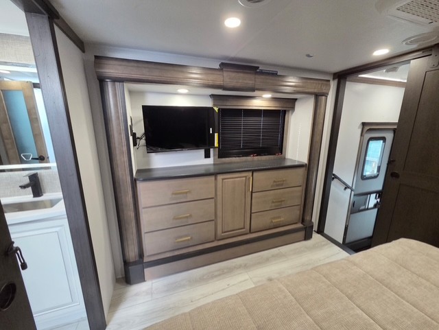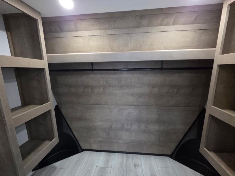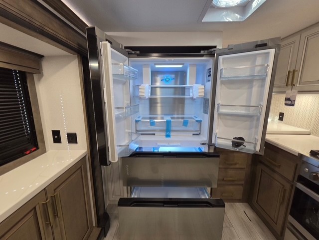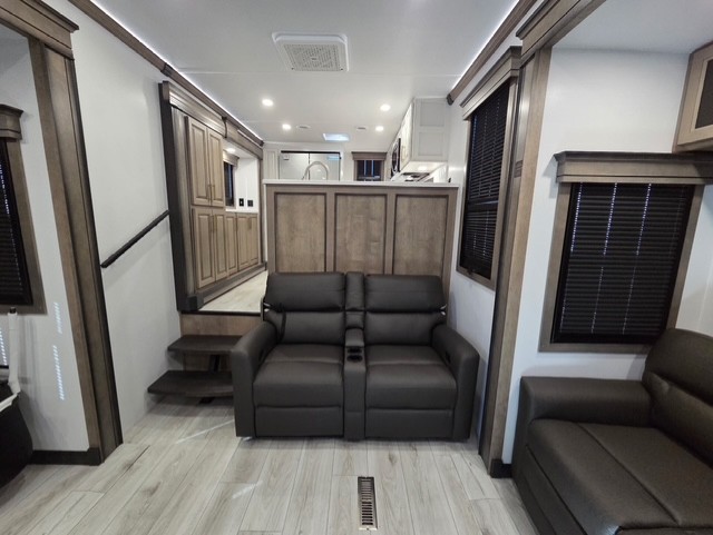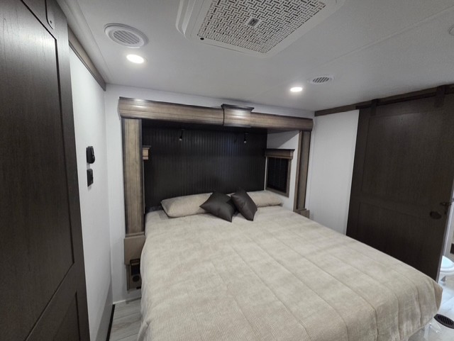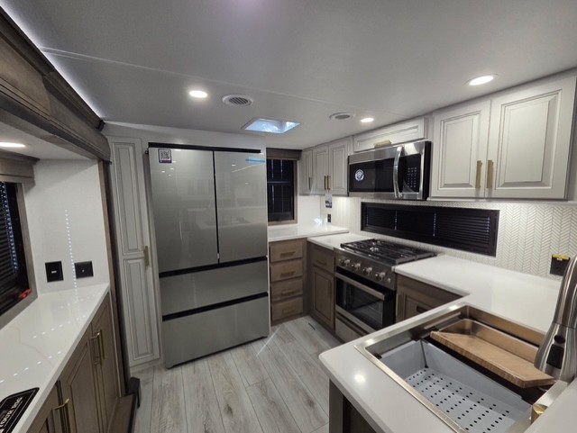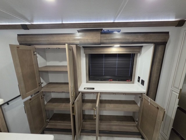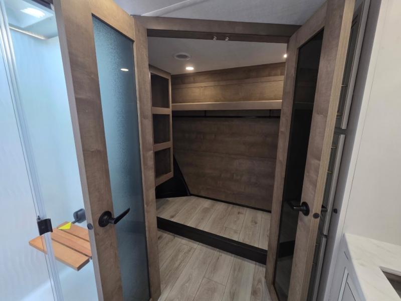 The perfect RV when you like to take "home"' with you when you travel! This Montana fifth wheel gives you the space you want and it feels like home with plenty of features to love and keep you comfortable when you are out enjoying your adventures. Five slides in total give each space plenty of room, the raised rear kitchen has everything you need to cook up meals and snacks just like at home. An 18 cu. ft. residential refrigerator with an ice maker, convection microwave oven and large sink, plus pantry space will make any chef happy. The mid-coach space just inside the door features a living room and half bath for convenience. There is also a pivot dinette within the roadside slide. Step up in front through a sliding barn door to a double slide space with a king bed and dresser. A second sliding door leads into the front spacious master bath featuring dual sinks, a 48" x 30" shower, and a large walk-in wardrobe with washer and dryer prep!