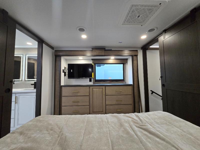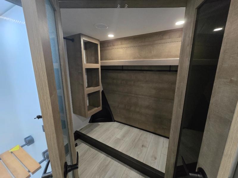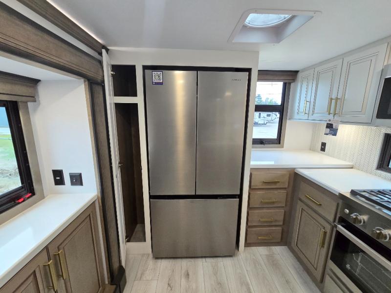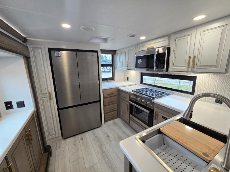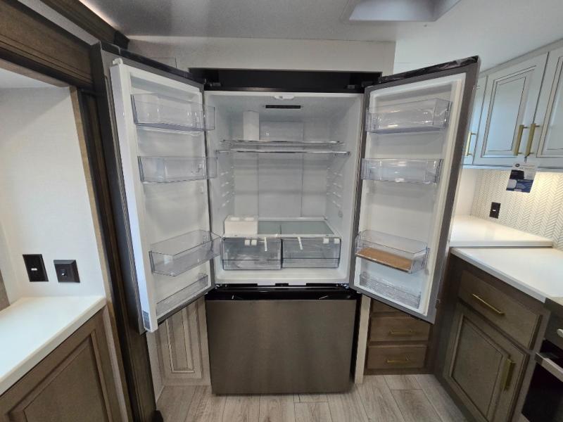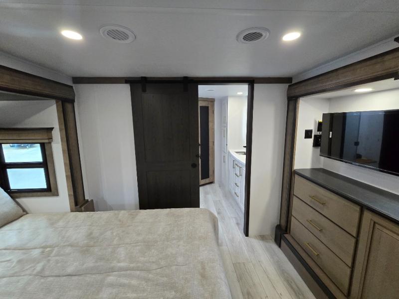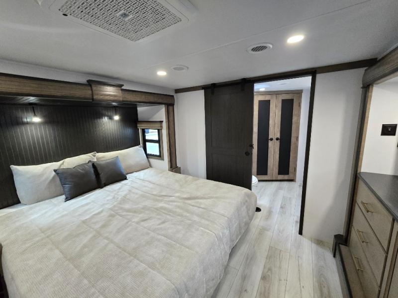 The perfect RV when you like to take "home"' with you when you travel! This Montana fifth wheel gives you the space you want and it feels like home with plenty of features to love and keep you comfortable when you are out enjoying your adventures. Five slides in total give each space plenty of room, the raised rear kitchen has everything you need to cook up meals and snacks just like at home. An 18 cu. ft. residential refrigerator with an ice maker, convection microwave oven and large sink, plus pantry space will make any chef happy. The mid-coach space just inside the door features a living room and half bath for convenience. There is also a pivot dinette within the roadside slide. Step up in front through a sliding barn door to a double slide space with a king bed and dresser. A second sliding door leads into the front spacious master bath featuring dual sinks, a 48" x 30" shower, and a large walk-in wardrobe with washer and dryer prep!