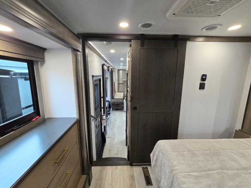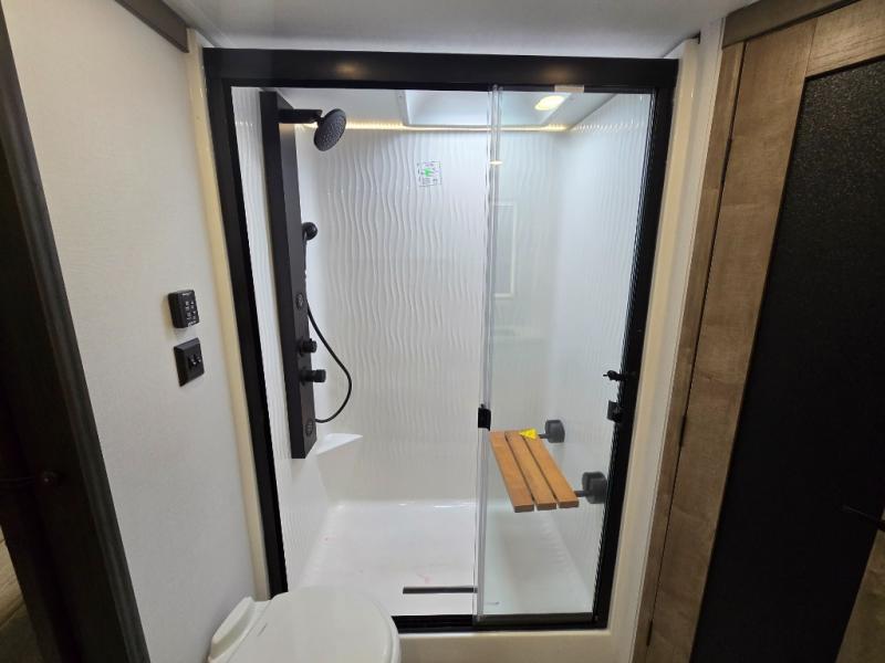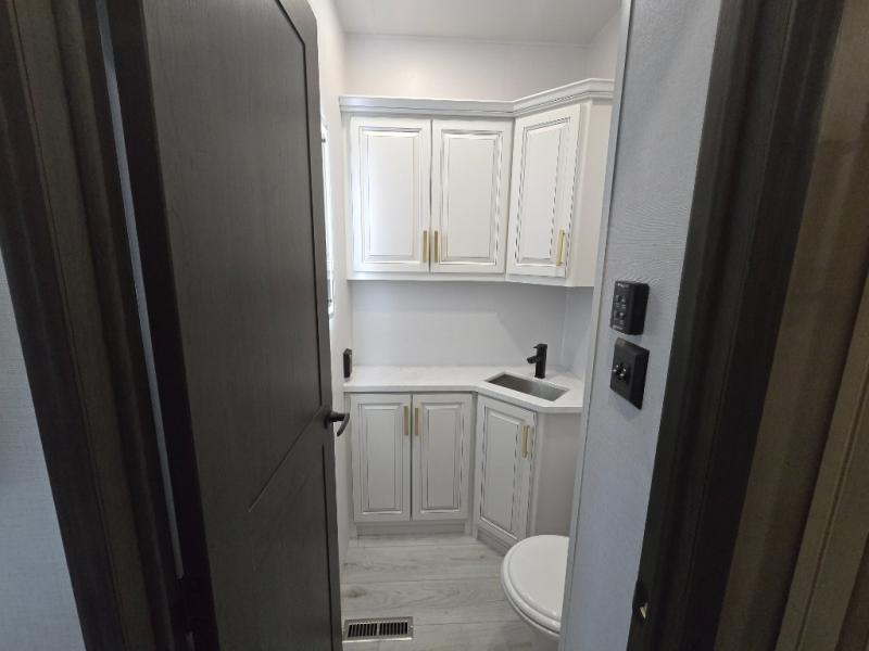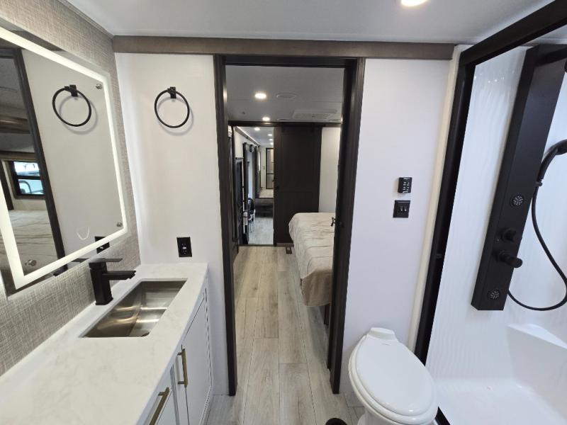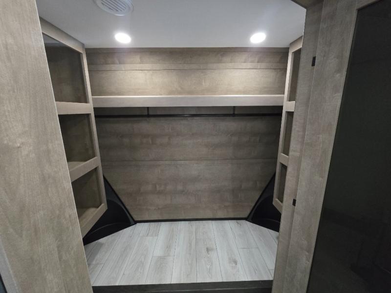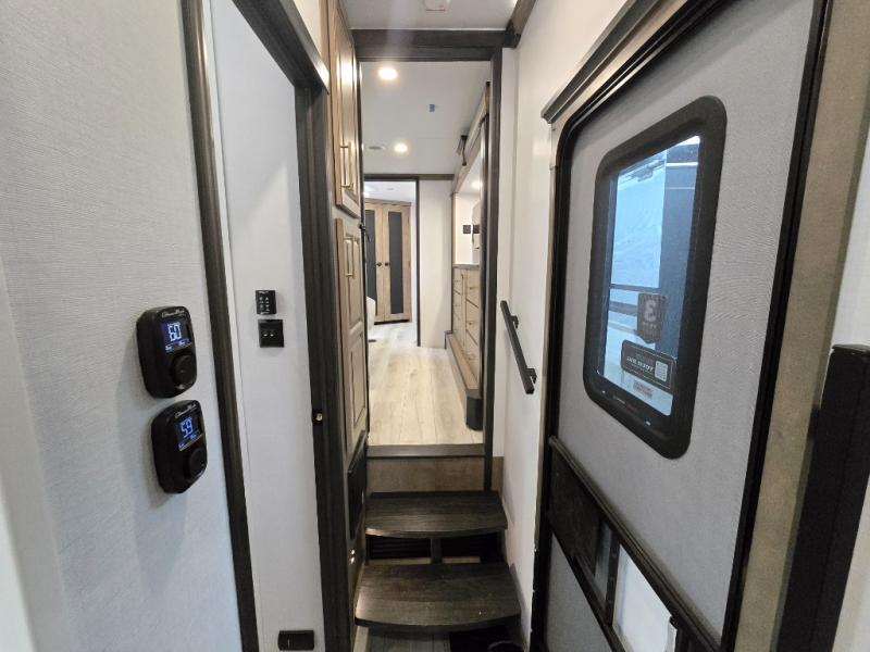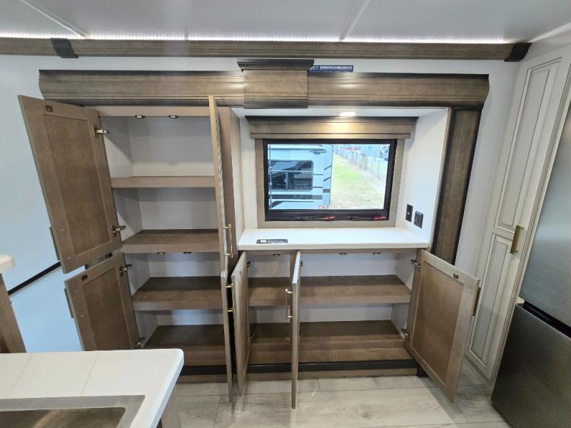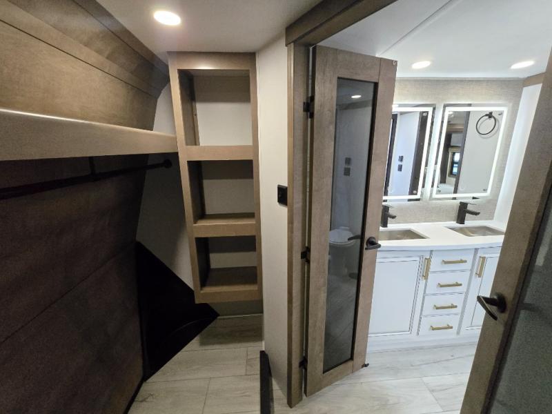 The perfect RV when you like to take "home"' with you when you travel! This Montana fifth wheel gives you the space you want and it feels like home with plenty of features to love and keep you comfortable when you are out enjoying your adventures. Five slides in total give each space plenty of room, the raised rear kitchen has everything you need to cook up meals and snacks just like at home. An 18 cu. ft. residential refrigerator with an ice maker, convection microwave oven and large sink, plus pantry space will make any chef happy. The mid-coach space just inside the door features a living room and half bath for convenience. There is also a pivot dinette within the roadside slide. Step up in front through a sliding barn door to a double slide space with a king bed and dresser. A second sliding door leads into the front spacious master bath featuring dual sinks, a 48" x 30" shower, and a large walk-in wardrobe with washer and dryer prep!