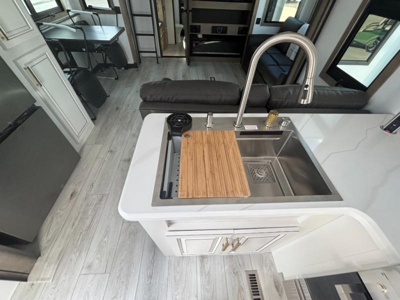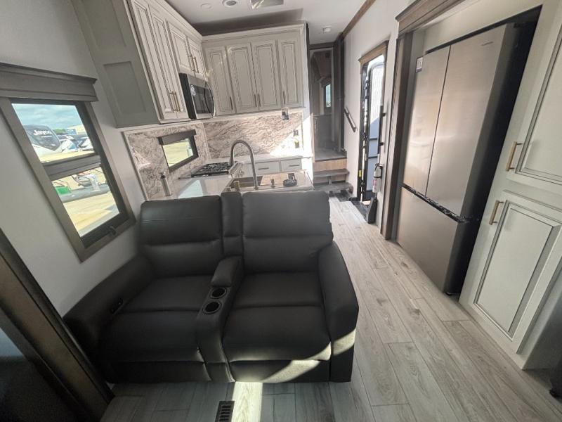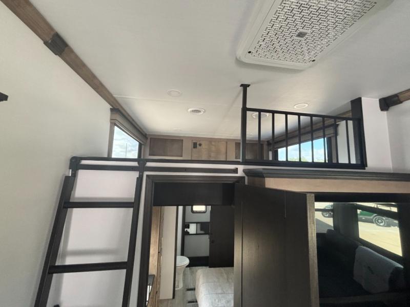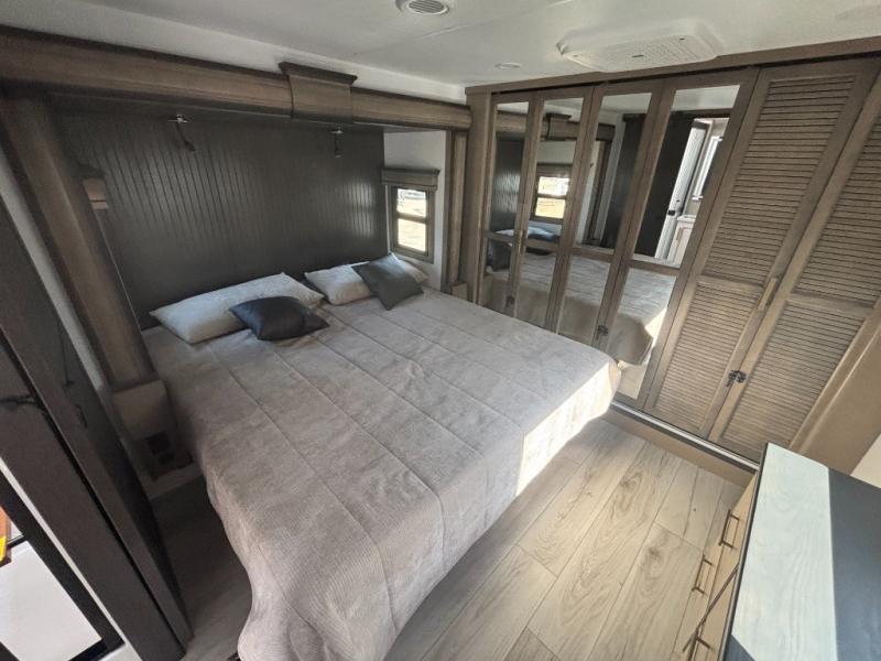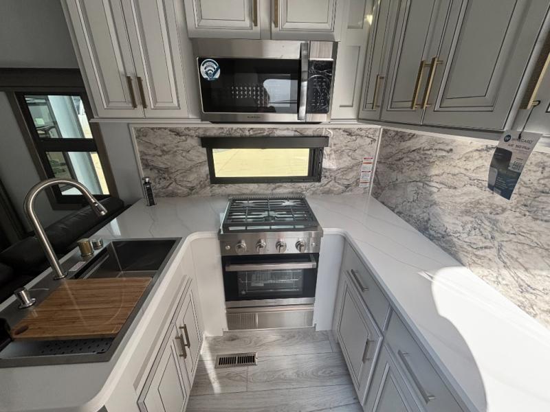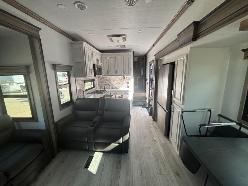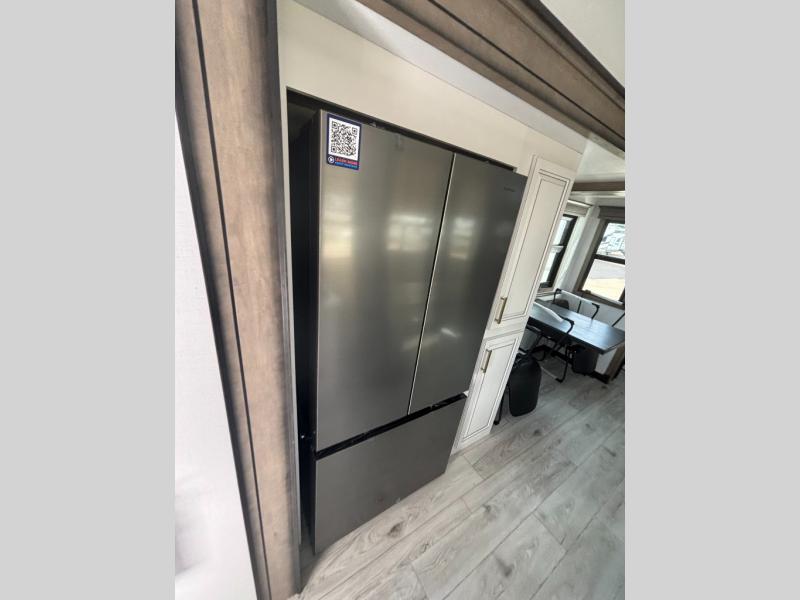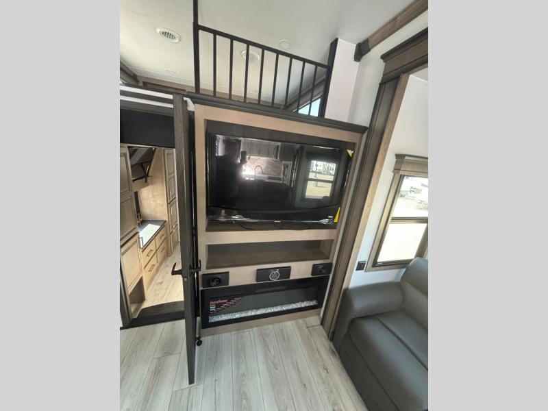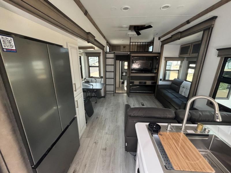 Traveling with friends and family is easier than ever with this fifth wheel in tow! There are two master suites; one for you and one for guests! The front master suite includes a king bed slide out, two closets plus additional storage, plus stackable washer/dryer prep if you want the option to make wash day easier. There is also convenient underbed storage, a dresser with a Smart HD TV, plus a private entrance into the dual entry bath. Head to the rear master suite to find just as much comfort with a queen bed slide out, dual closets and a dresser, plus a full rear bath where the second entry door is located. There is also a loft area above this room with three bunk mats for more campers! The middle kitchen and living area includes many comforts, like the power theater seating across from the 50" Smart TV and hide-a-bed sofa, plus the U-shaped kitchen with ample counter space and a 24" range. You'll also find food storage in the pantry and 18 cu. ft. residential refrigerator with an ice maker, or you can choose the slightly larger optional 20 cu. ft. refrigerator!