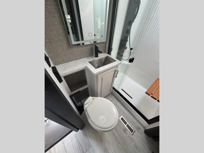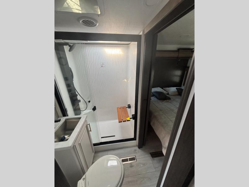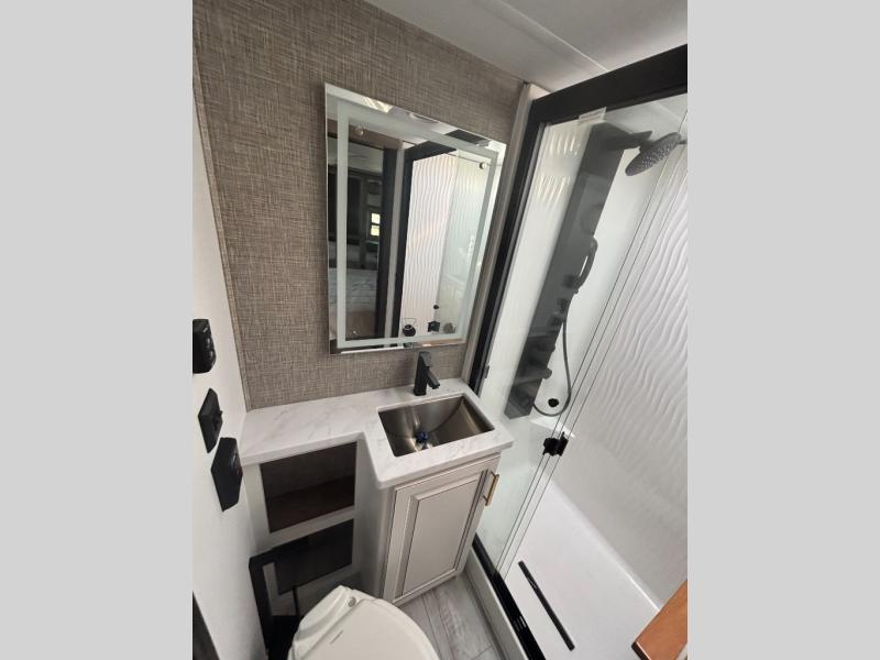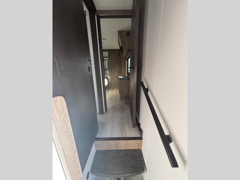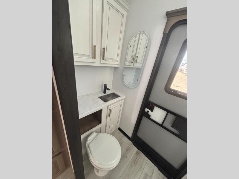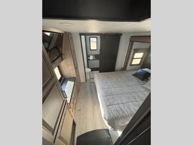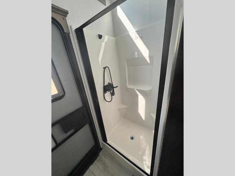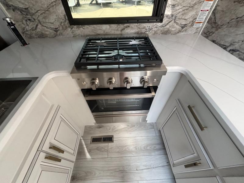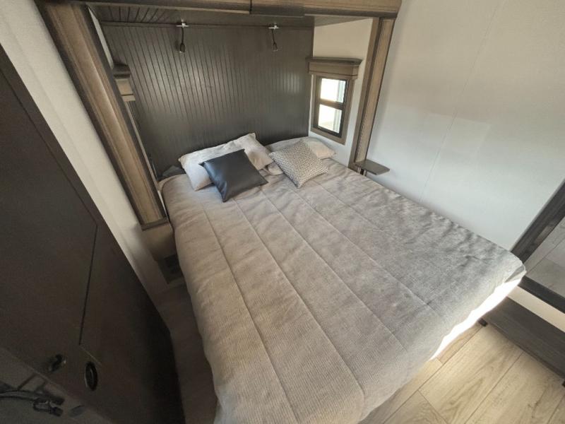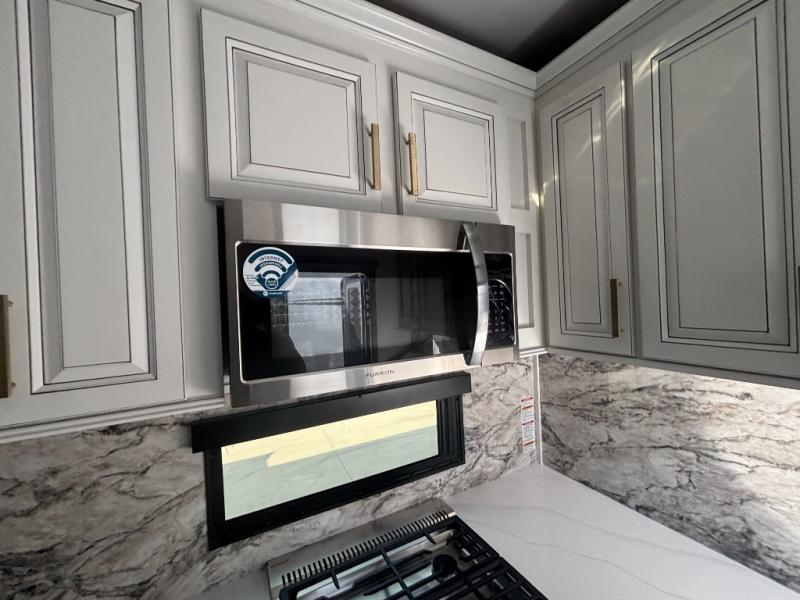 Traveling with friends and family is easier than ever with this fifth wheel in tow! There are two master suites; one for you and one for guests! The front master suite includes a king bed slide out, two closets plus additional storage, plus stackable washer/dryer prep if you want the option to make wash day easier. There is also convenient underbed storage, a dresser with a Smart HD TV, plus a private entrance into the dual entry bath. Head to the rear master suite to find just as much comfort with a queen bed slide out, dual closets and a dresser, plus a full rear bath where the second entry door is located. There is also a loft area above this room with three bunk mats for more campers! The middle kitchen and living area includes many comforts, like the power theater seating across from the 50" Smart TV and hide-a-bed sofa, plus the U-shaped kitchen with ample counter space and a 24" range. You'll also find food storage in the pantry and 18 cu. ft. residential refrigerator with an ice maker, or you can choose the slightly larger optional 20 cu. ft. refrigerator!