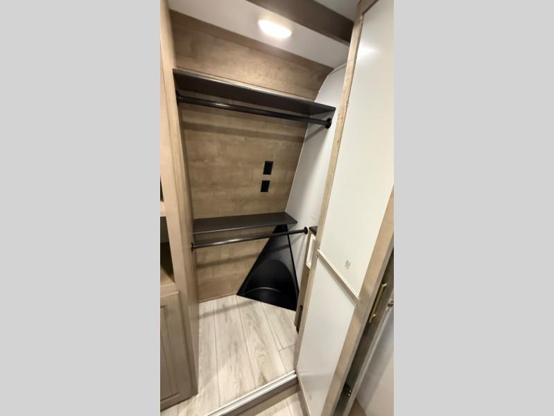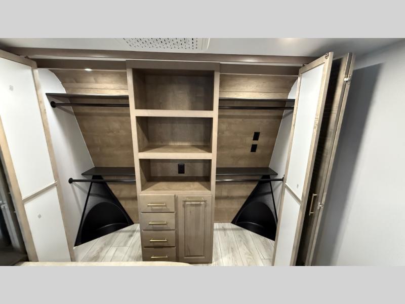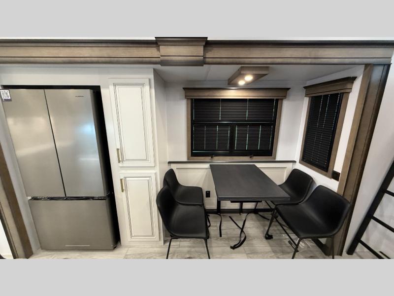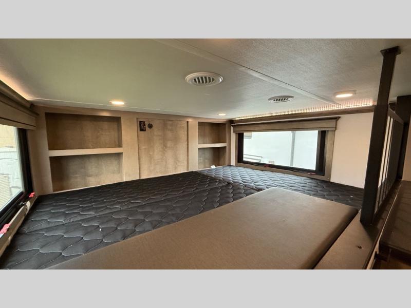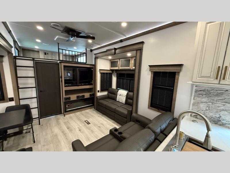 Traveling with friends and family is easier than ever with this fifth wheel in tow! There are two master suites; one for you and one for guests! The front master suite includes a king bed slide out, two closets plus additional storage, plus stackable washer/dryer prep if you want the option to make wash day easier. There is also convenient underbed storage, a dresser with a Smart HD TV, plus a private entrance into the dual entry bath. Head to the rear master suite to find just as much comfort with a queen bed slide out, dual closets and a dresser, plus a full rear bath where the second entry door is located. There is also a loft area above this room with three bunk mats for more campers! The middle kitchen and living area includes many comforts, like the power theater seating across from the 50" Smart TV and hide-a-bed sofa, plus the U-shaped kitchen with ample counter space and a 24" range. You'll also find food storage in the pantry and 18 cu. ft. residential refrigerator with an ice maker, or you can choose the slightly larger optional 20 cu. ft. refrigerator!