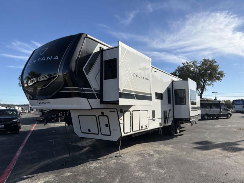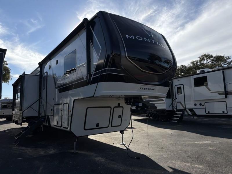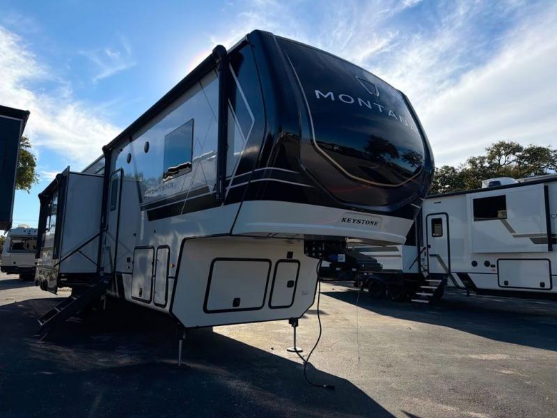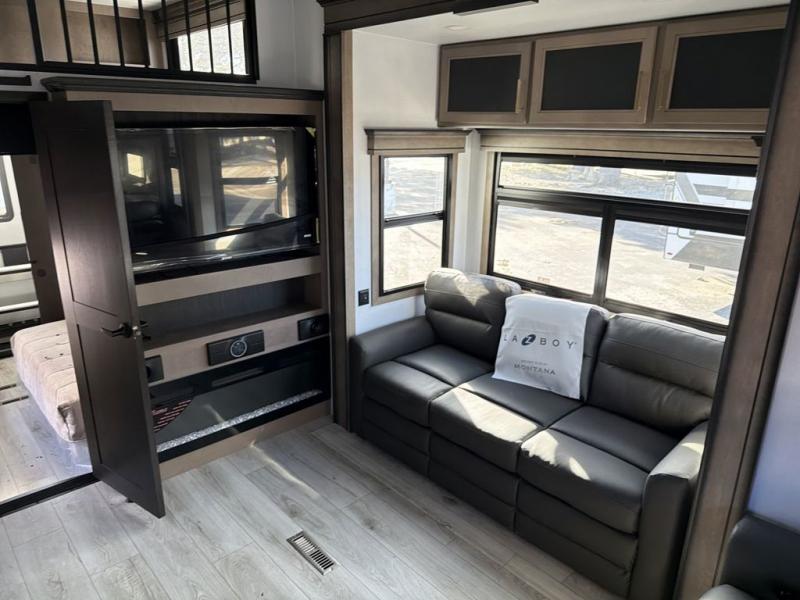 Enjoy luxury, innovation, and the outdoors in any one of Montana's finest fifth wheels. Each set the standard with exceptional features, and exciting factory installed options to provide you a great home on the road. Keystone's 12" I-beam chassis with z-frame technology provides a strong and durable foundation to your fifth wheel, and the four season living package will help extend your camping season. A few other construction features you will appreciate include a MORryde CRE3000 suspension, a fully walkable roof with an alpha seamless TPO membrane system, and 4k square frameless tinted safety glass windows. Each feature stylish interiors with two decor choices paired with beautiful hardwood cabinetry, Beauflor vinyl flooring throughout, central vacuum, plus a La-Z-Boy furniture package for all-around comfort!