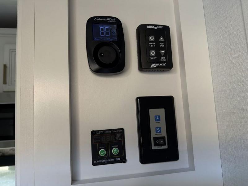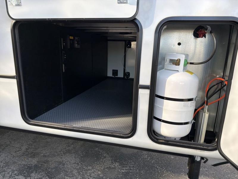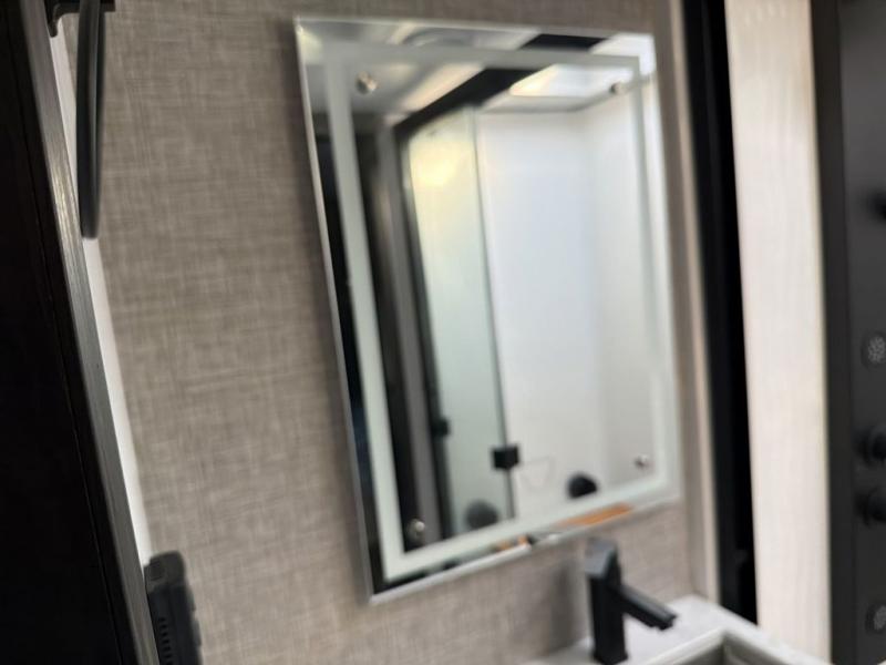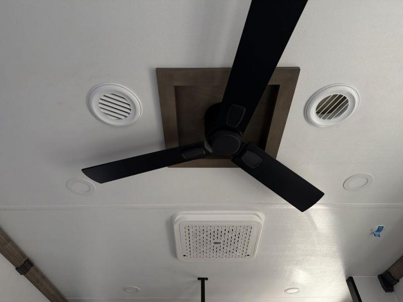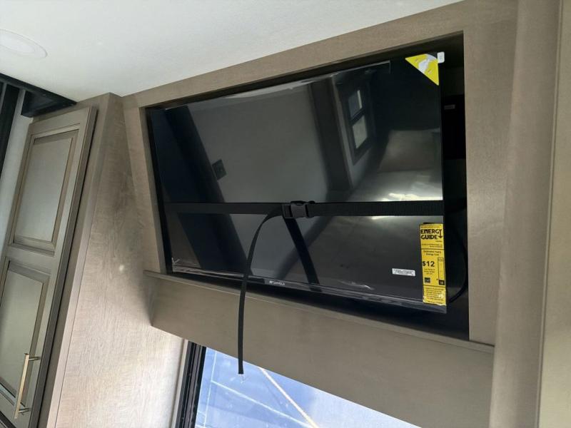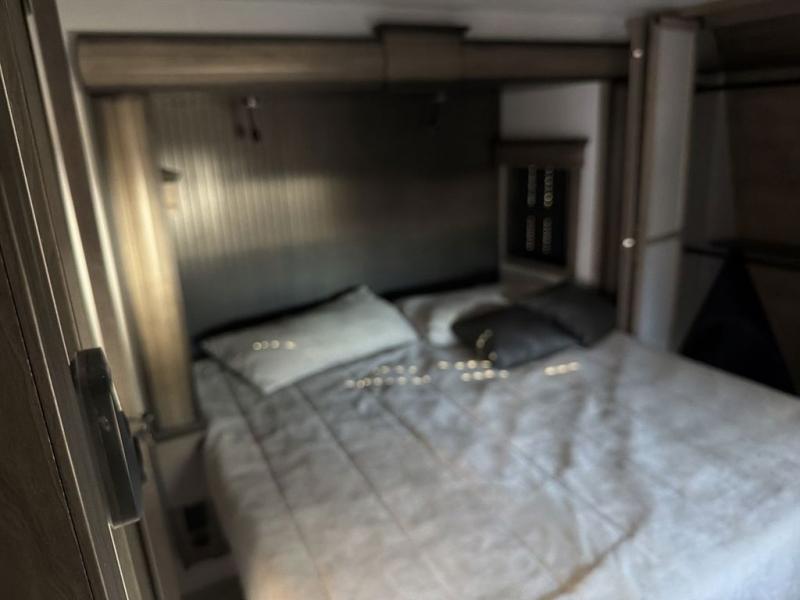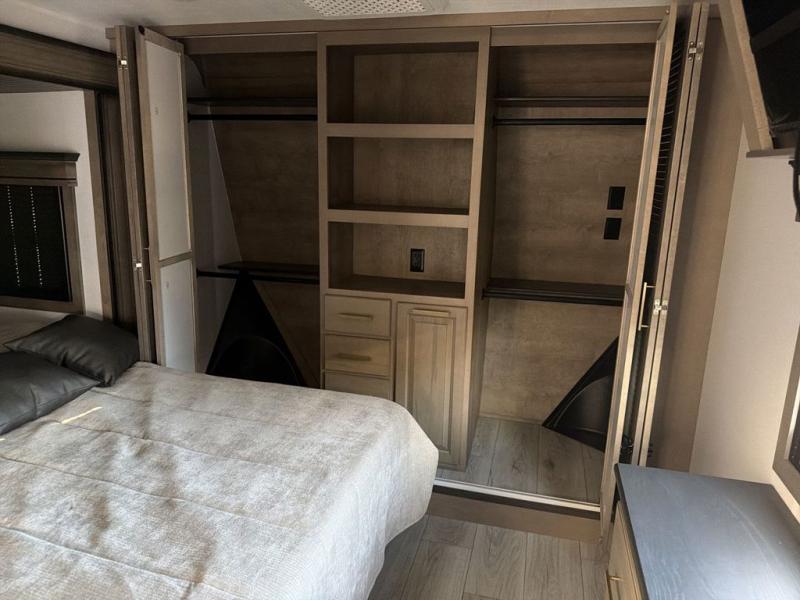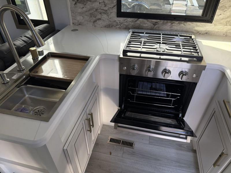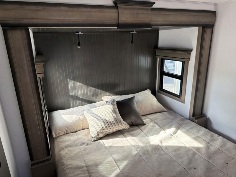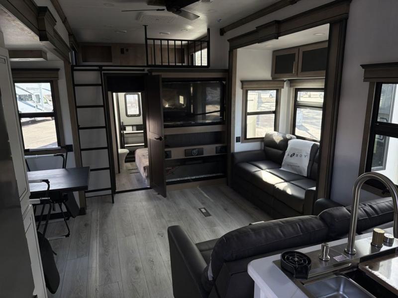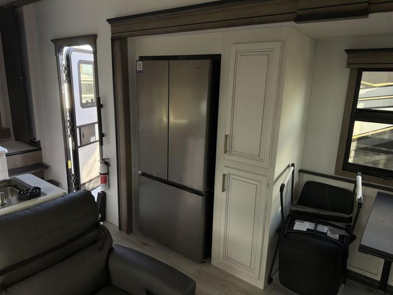 Traveling with friends and family is easier than ever with this fifth wheel in tow! There are two master suites; one for you and one for guests! The front master suite includes a king bed slide out, two closets plus additional storage, plus stackable washer/dryer prep if you want the option to make wash day easier. There is also convenient underbed storage, a dresser with a Smart HD TV, plus a private entrance into the dual entry bath. Head to the rear master suite to find just as much comfort with a queen bed slide out, dual closets and a dresser, plus a full rear bath where the second entry door is located. There is also a loft area above this room with three bunk mats for more campers! The middle kitchen and living area includes many comforts, like the power theater seating across from the 50" Smart TV and hide-a-bed sofa, plus the U-shaped kitchen with ample counter space and a 24" range. You'll also find food storage in the pantry and 18 cu. ft. residential refrigerator with an ice maker, or you can choose the slightly larger optional 20 cu. ft. refrigerator!