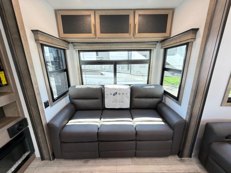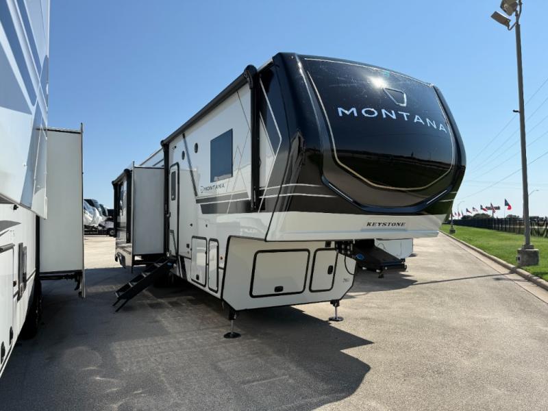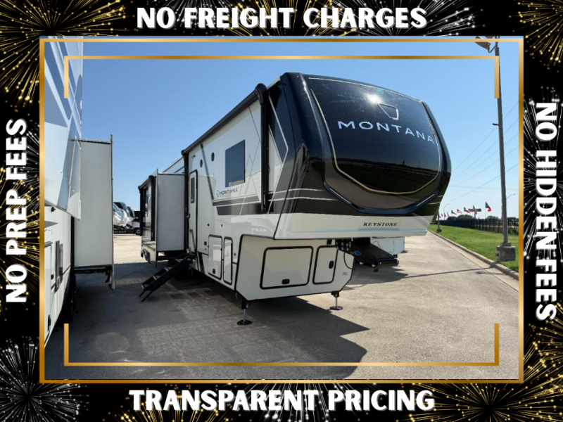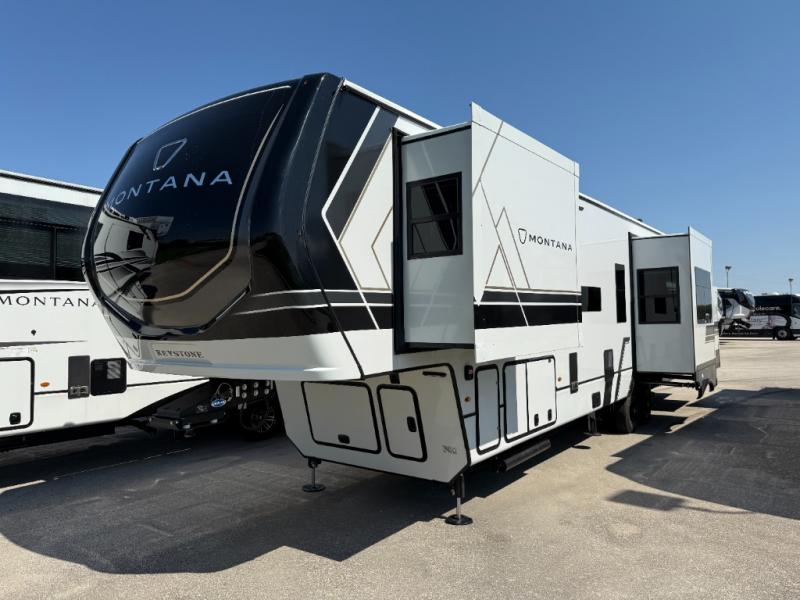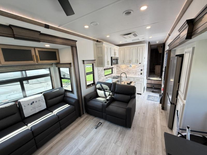 Enjoy luxury, innovation, and the outdoors in any one of Montana's finest fifth wheels. Each set the standard with exceptional features, and exciting factory installed options to provide you a great home on the road. Keystone's 12" I-beam chassis with z-frame technology provides a strong and durable foundation to your fifth wheel, and the four season living package will help extend your camping season. A few other construction features you will appreciate include a MORryde CRE3000 suspension, a fully walkable roof with an alpha seamless TPO membrane system, and 4k square frameless tinted safety glass windows. Each feature stylish interiors with two decor choices paired with beautiful hardwood cabinetry, Beauflor vinyl flooring throughout, central vacuum, plus a La-Z-Boy furniture package for all-around comfort!