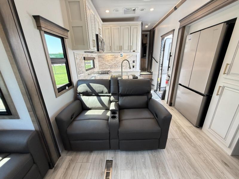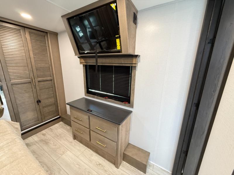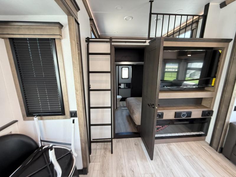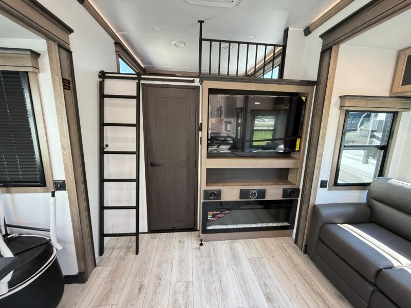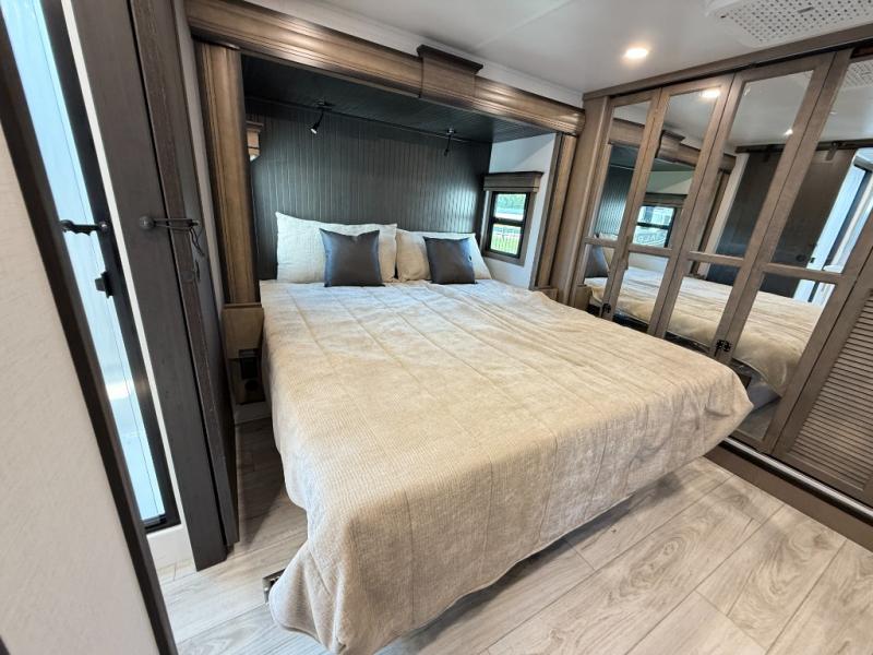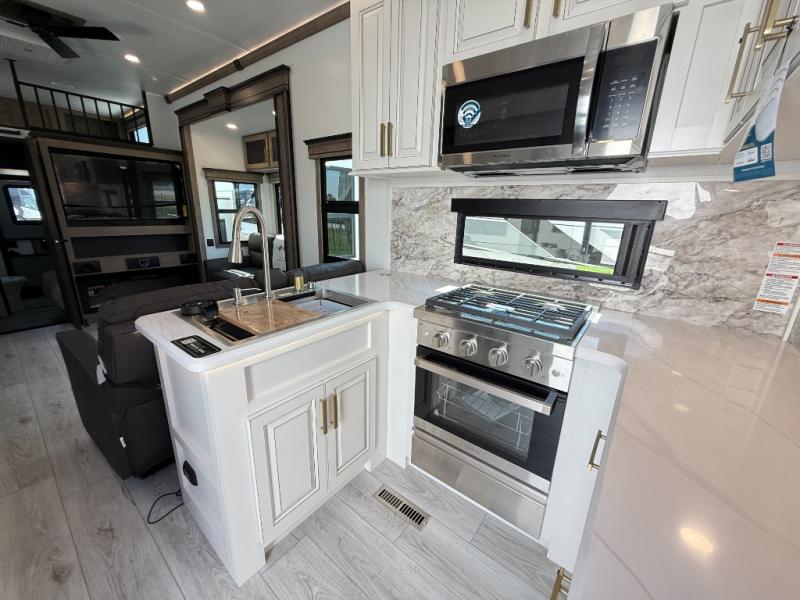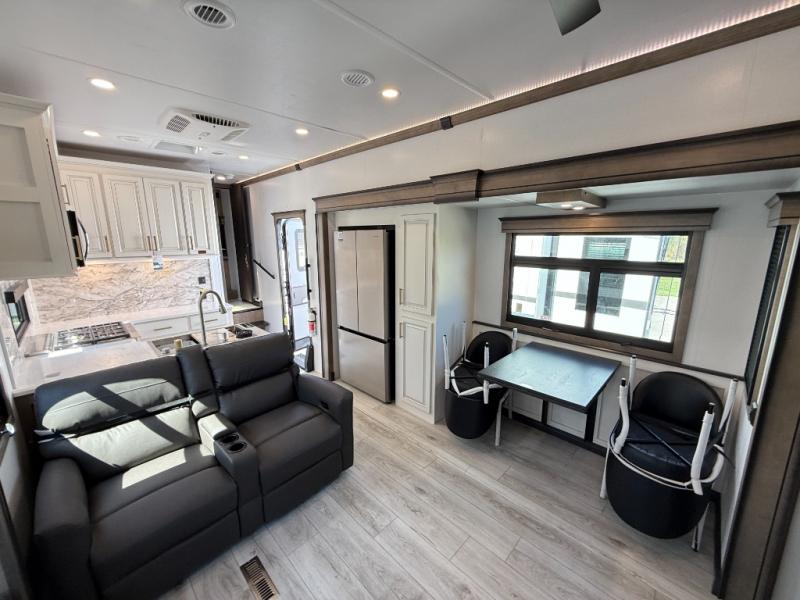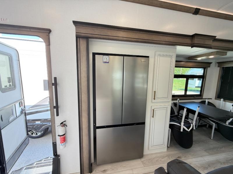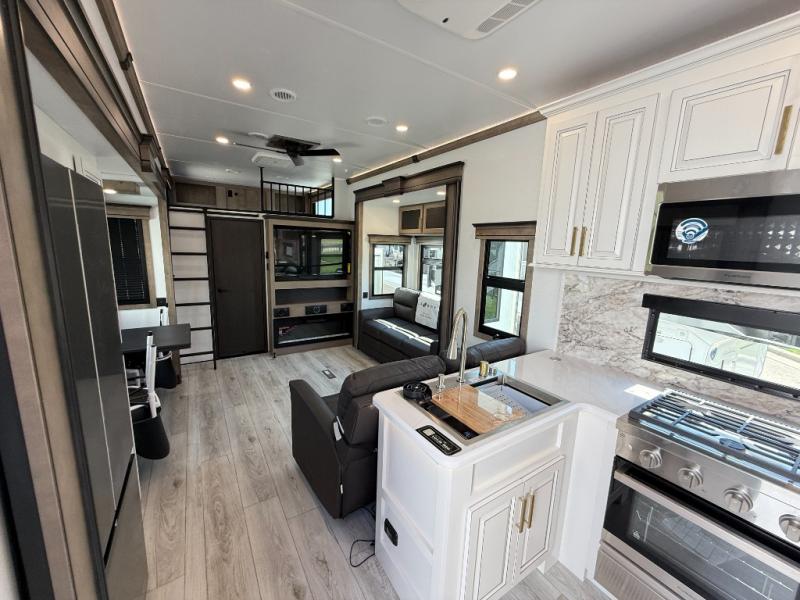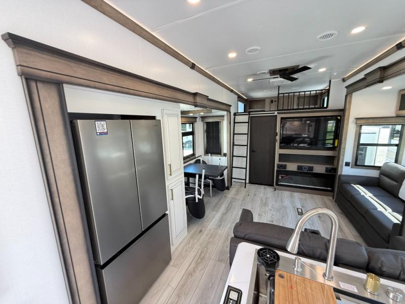 Traveling with friends and family is easier than ever with this fifth wheel in tow! There are two master suites; one for you and one for guests! The front master suite includes a king bed slide out, two closets plus additional storage, plus stackable washer/dryer prep if you want the option to make wash day easier. There is also convenient underbed storage, a dresser with a Smart HD TV, plus a private entrance into the dual entry bath. Head to the rear master suite to find just as much comfort with a queen bed slide out, dual closets and a dresser, plus a full rear bath where the second entry door is located. There is also a loft area above this room with three bunk mats for more campers! The middle kitchen and living area includes many comforts, like the power theater seating across from the 50" Smart TV and hide-a-bed sofa, plus the U-shaped kitchen with ample counter space and a 24" range. You'll also find food storage in the pantry and 18 cu. ft. residential refrigerator with an ice maker, or you can choose the slightly larger optional 20 cu. ft. refrigerator!