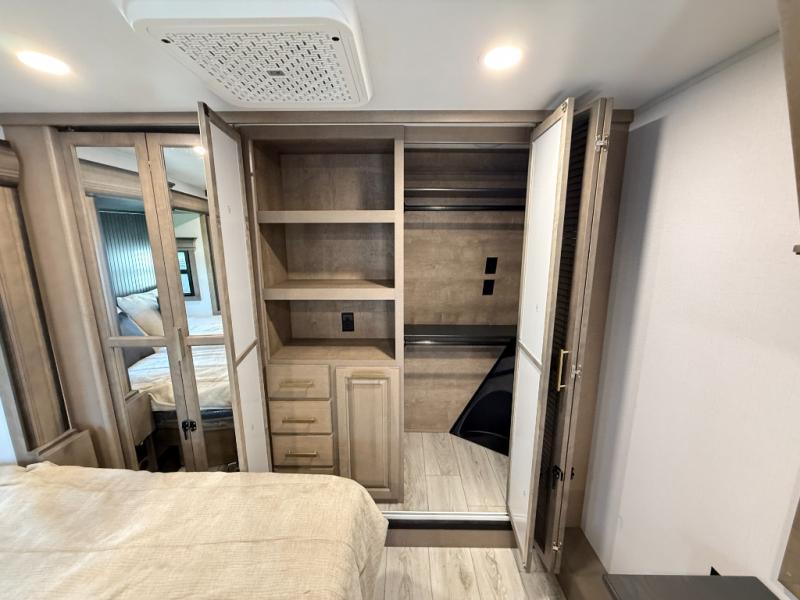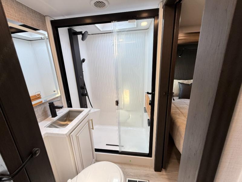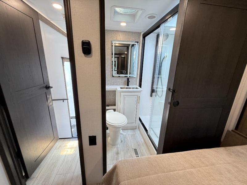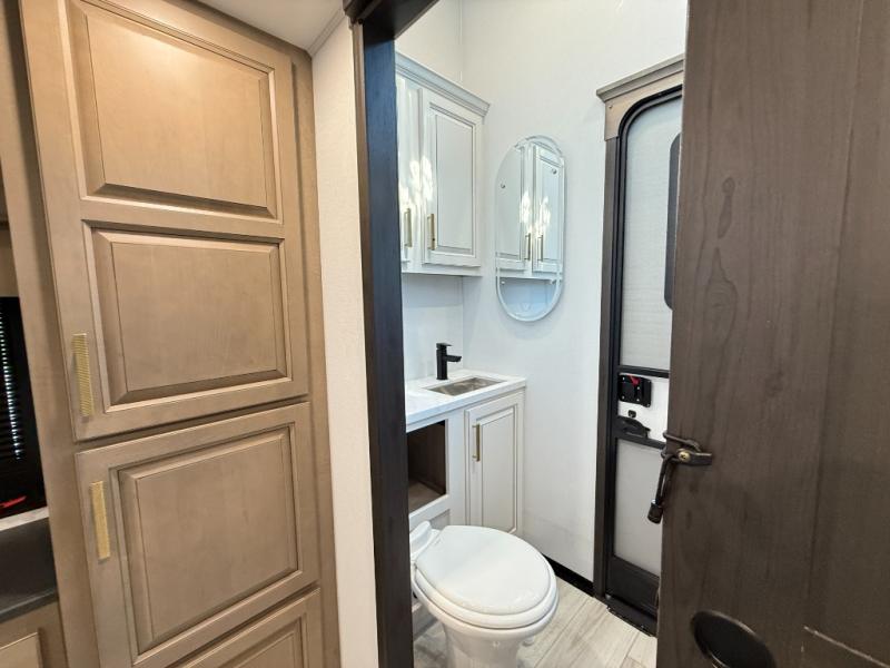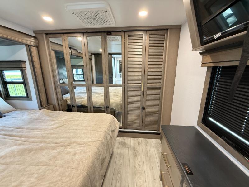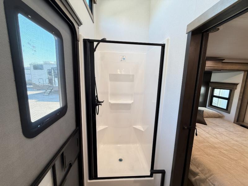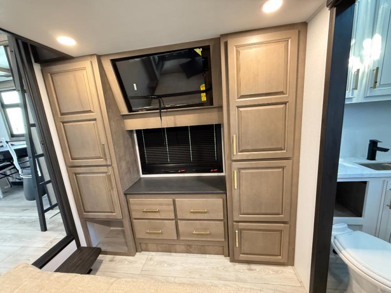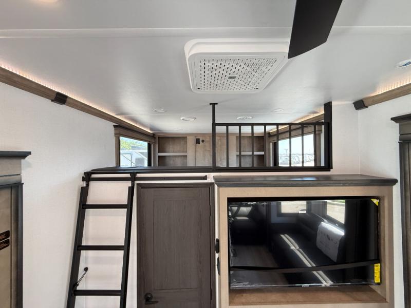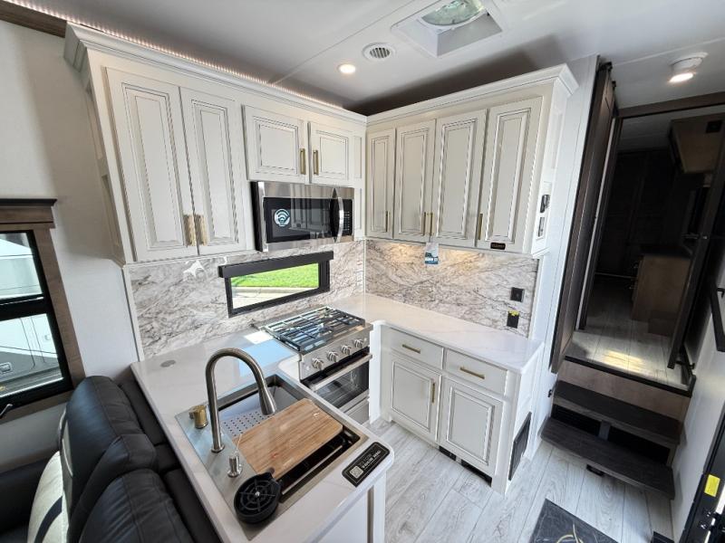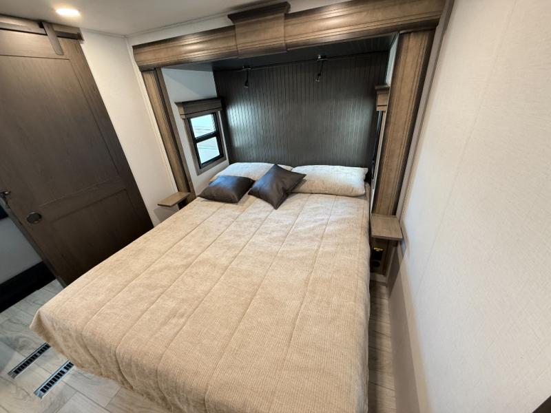 Traveling with friends and family is easier than ever with this fifth wheel in tow! There are two master suites; one for you and one for guests! The front master suite includes a king bed slide out, two closets plus additional storage, plus stackable washer/dryer prep if you want the option to make wash day easier. There is also convenient underbed storage, a dresser with a Smart HD TV, plus a private entrance into the dual entry bath. Head to the rear master suite to find just as much comfort with a queen bed slide out, dual closets and a dresser, plus a full rear bath where the second entry door is located. There is also a loft area above this room with three bunk mats for more campers! The middle kitchen and living area includes many comforts, like the power theater seating across from the 50" Smart TV and hide-a-bed sofa, plus the U-shaped kitchen with ample counter space and a 24" range. You'll also find food storage in the pantry and 18 cu. ft. residential refrigerator with an ice maker, or you can choose the slightly larger optional 20 cu. ft. refrigerator!