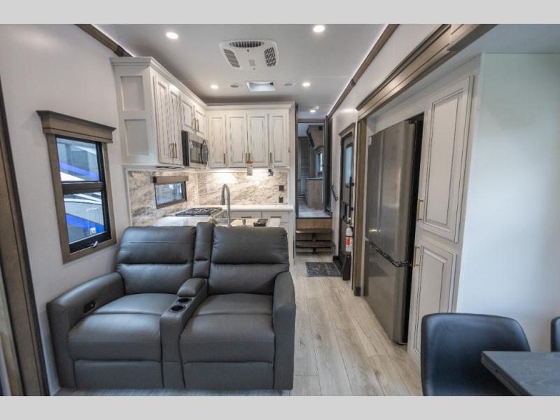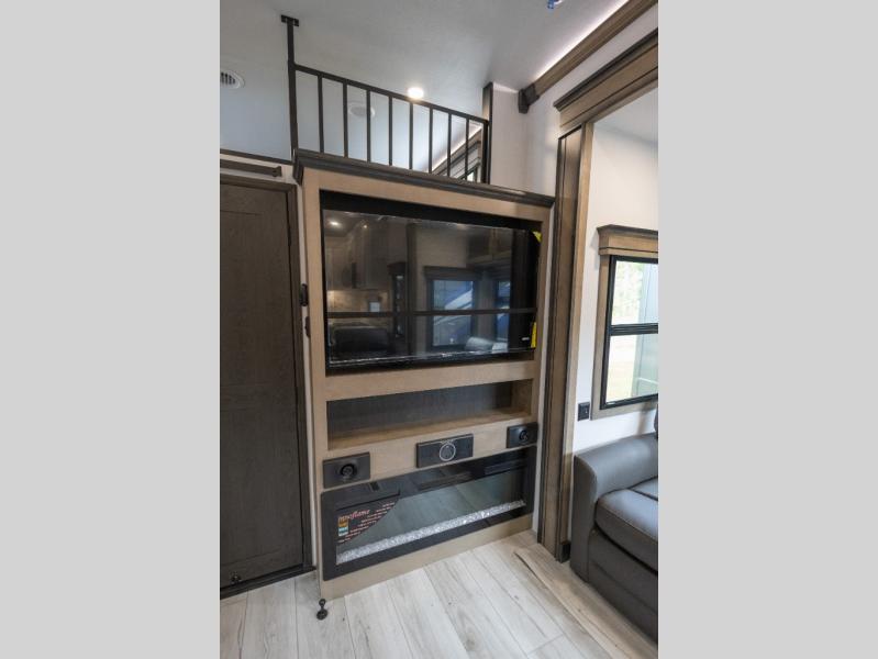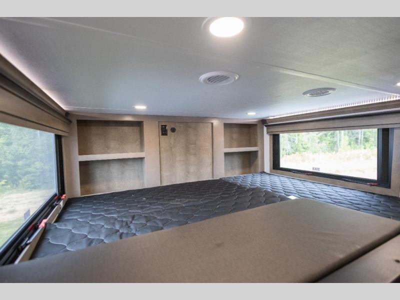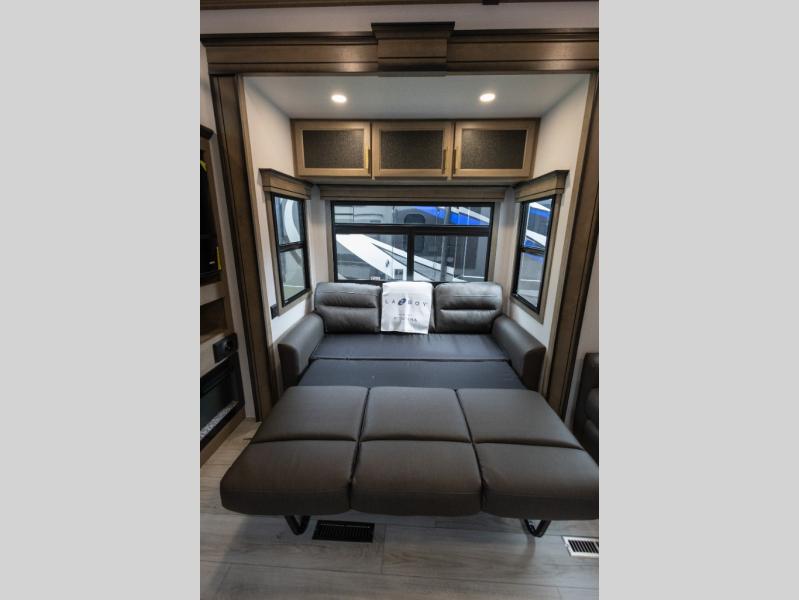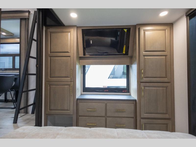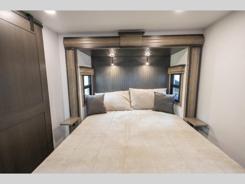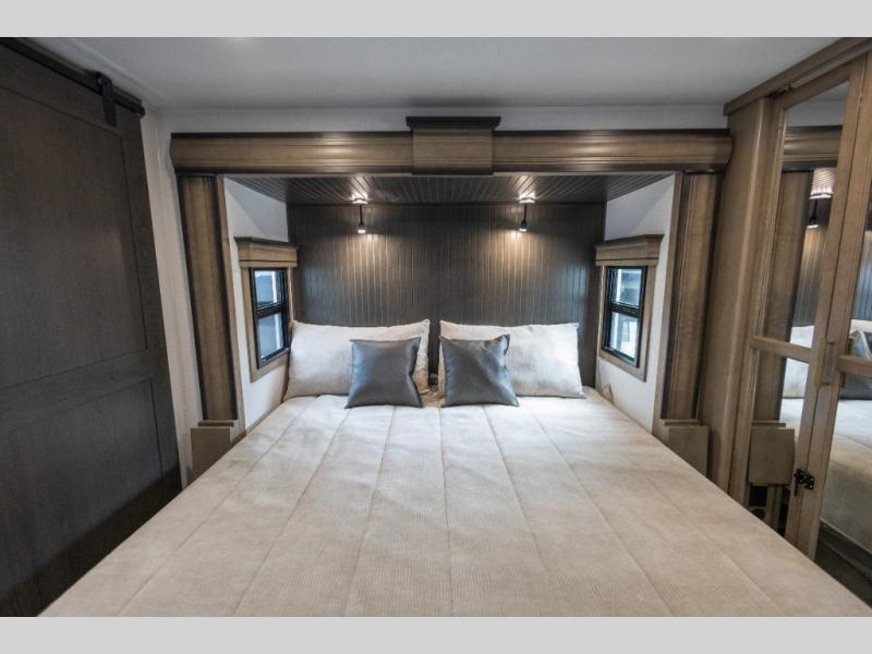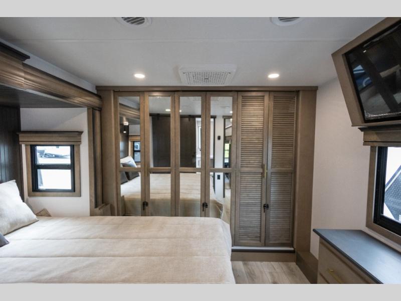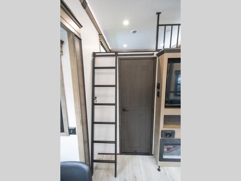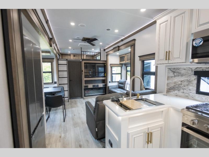 Traveling with friends and family is easier than ever with this fifth wheel in tow! There are two master suites; one for you and one for guests! The front master suite includes a king bed slide out, two closets plus additional storage, plus stackable washer/dryer prep if you want the option to make wash day easier. There is also convenient underbed storage, a dresser with a Smart HD TV, plus a private entrance into the dual entry bath. Head to the rear master suite to find just as much comfort with a queen bed slide out, dual closets and a dresser, plus a full rear bath where the second entry door is located. There is also a loft area above this room with three bunk mats for more campers! The middle kitchen and living area includes many comforts, like the power theater seating across from the 50" Smart TV and hide-a-bed sofa, plus the U-shaped kitchen with ample counter space and a 24" range. You'll also find food storage in the pantry and 18 cu. ft. residential refrigerator with an ice maker, or you can choose the slightly larger optional 20 cu. ft. refrigerator!