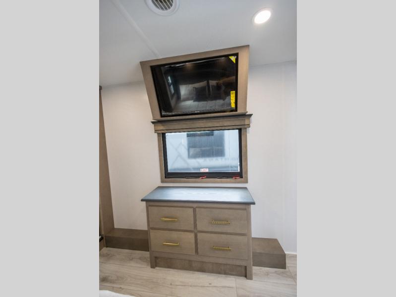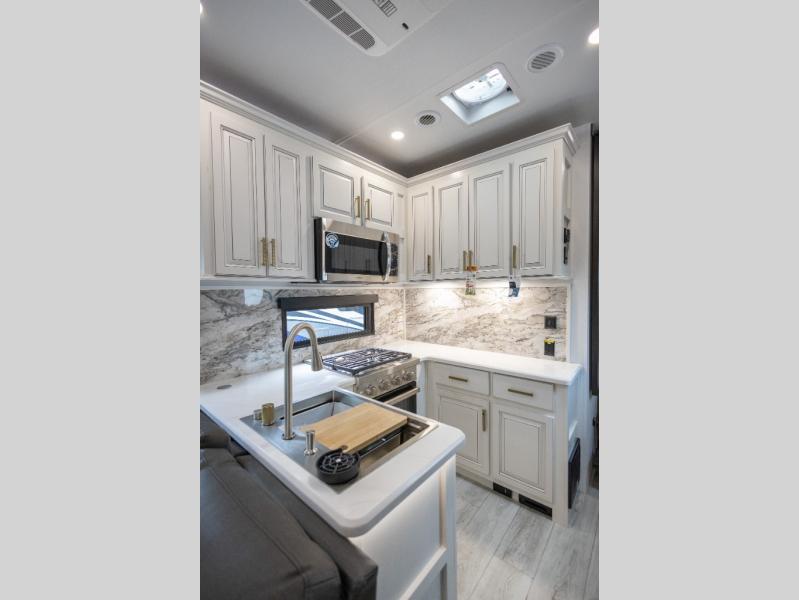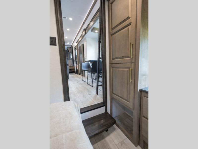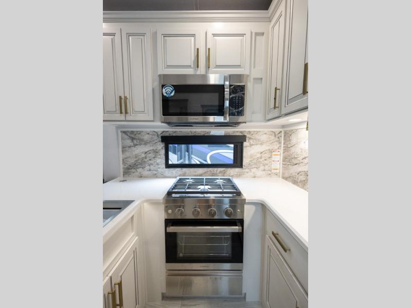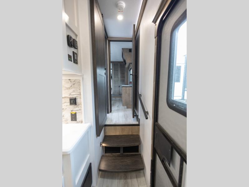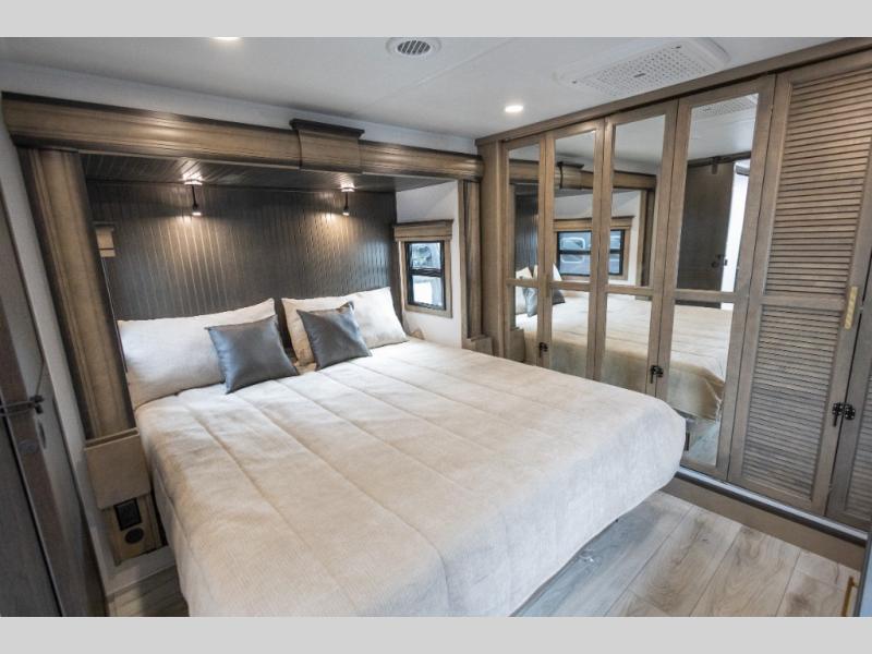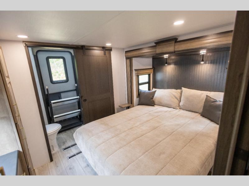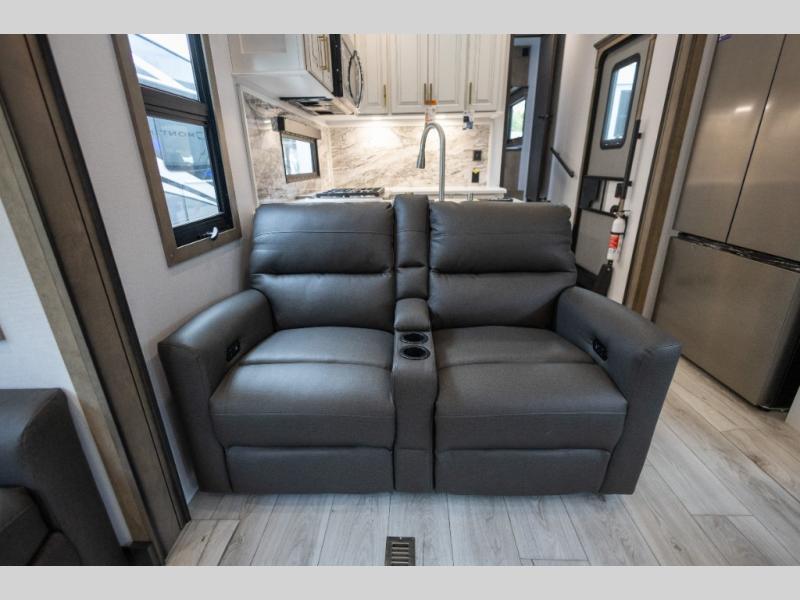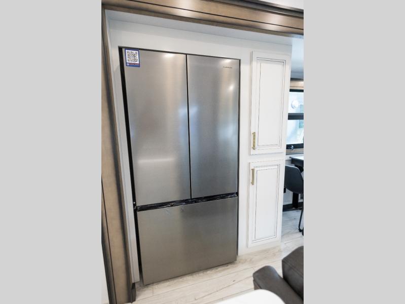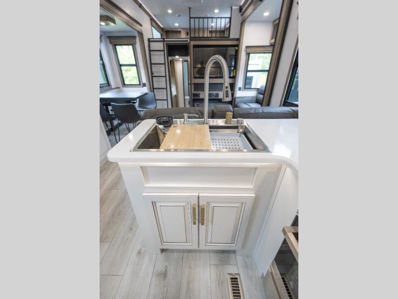 Traveling with friends and family is easier than ever with this fifth wheel in tow! There are two master suites; one for you and one for guests! The front master suite includes a king bed slide out, two closets plus additional storage, plus stackable washer/dryer prep if you want the option to make wash day easier. There is also convenient underbed storage, a dresser with a Smart HD TV, plus a private entrance into the dual entry bath. Head to the rear master suite to find just as much comfort with a queen bed slide out, dual closets and a dresser, plus a full rear bath where the second entry door is located. There is also a loft area above this room with three bunk mats for more campers! The middle kitchen and living area includes many comforts, like the power theater seating across from the 50" Smart TV and hide-a-bed sofa, plus the U-shaped kitchen with ample counter space and a 24" range. You'll also find food storage in the pantry and 18 cu. ft. residential refrigerator with an ice maker, or you can choose the slightly larger optional 20 cu. ft. refrigerator!