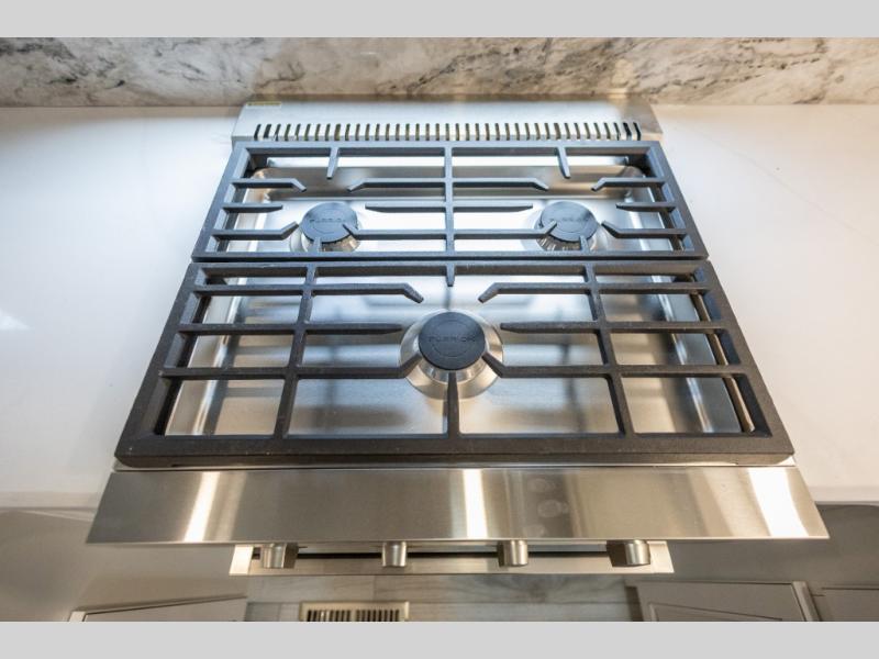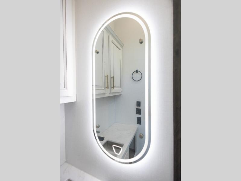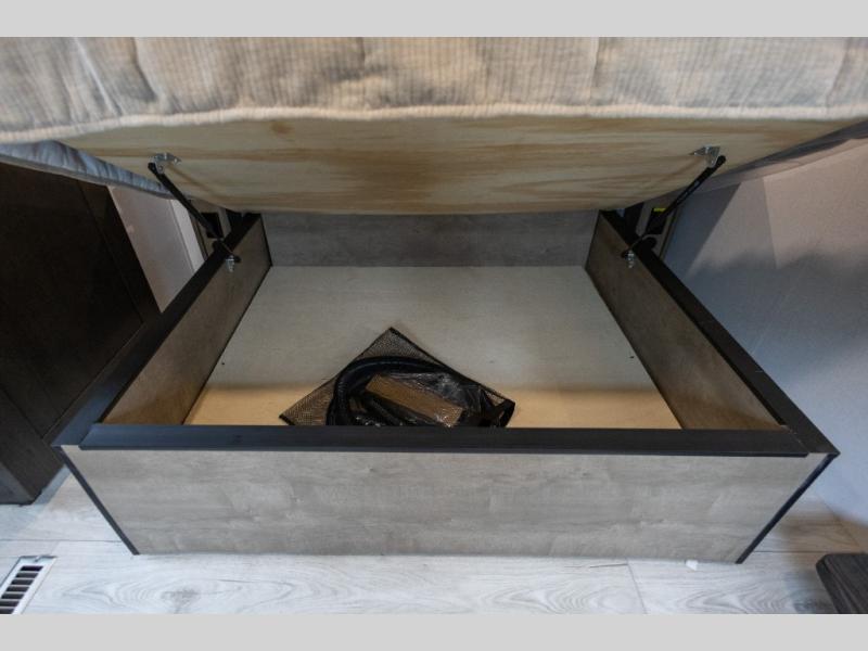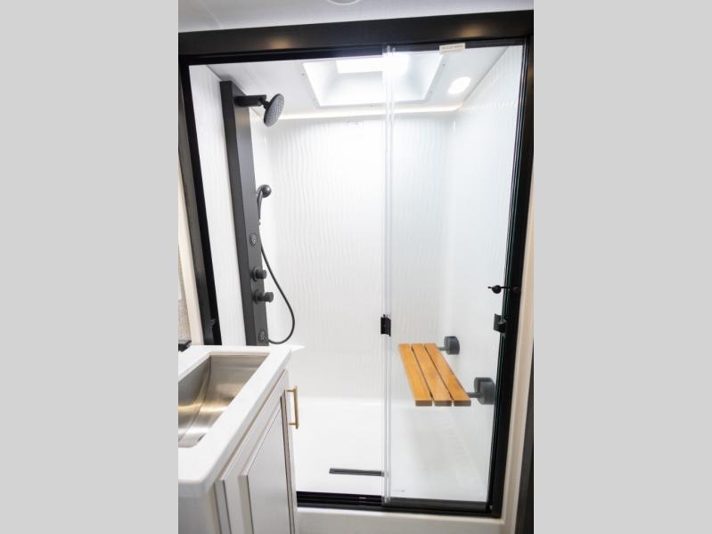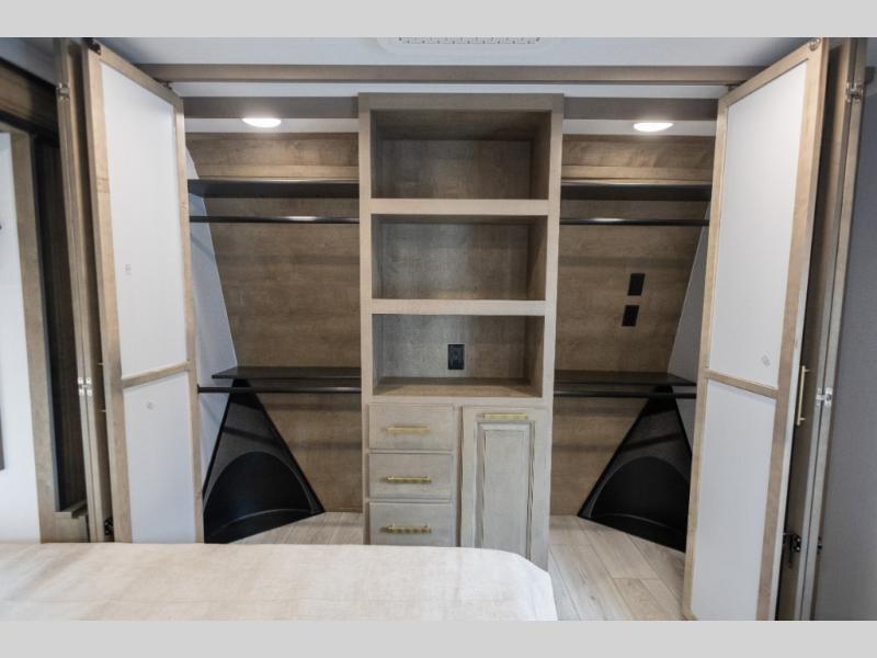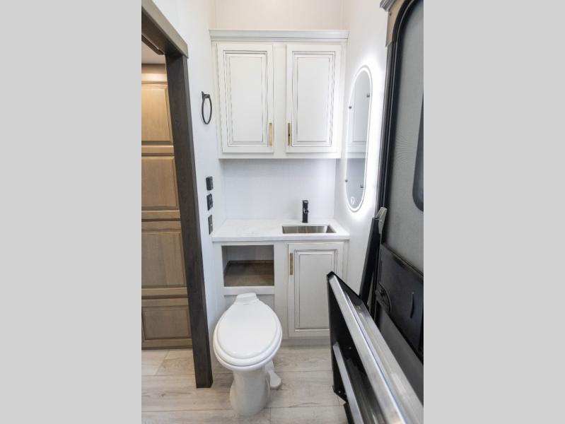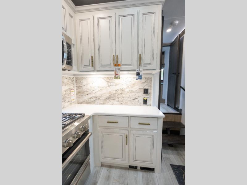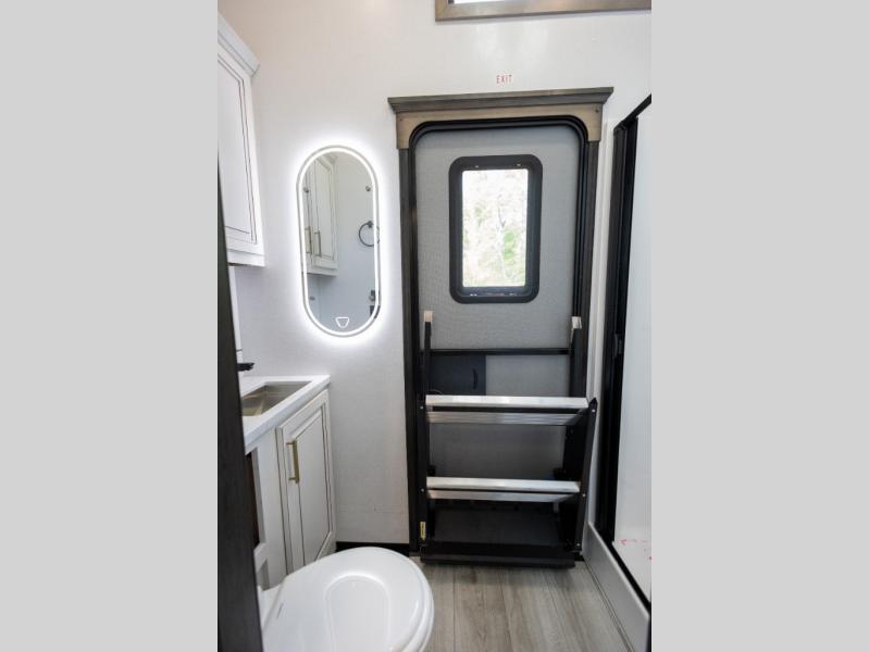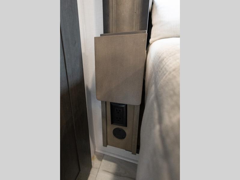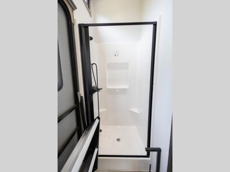 Traveling with friends and family is easier than ever with this fifth wheel in tow! There are two master suites; one for you and one for guests! The front master suite includes a king bed slide out, two closets plus additional storage, plus stackable washer/dryer prep if you want the option to make wash day easier. There is also convenient underbed storage, a dresser with a Smart HD TV, plus a private entrance into the dual entry bath. Head to the rear master suite to find just as much comfort with a queen bed slide out, dual closets and a dresser, plus a full rear bath where the second entry door is located. There is also a loft area above this room with three bunk mats for more campers! The middle kitchen and living area includes many comforts, like the power theater seating across from the 50" Smart TV and hide-a-bed sofa, plus the U-shaped kitchen with ample counter space and a 24" range. You'll also find food storage in the pantry and 18 cu. ft. residential refrigerator with an ice maker, or you can choose the slightly larger optional 20 cu. ft. refrigerator!