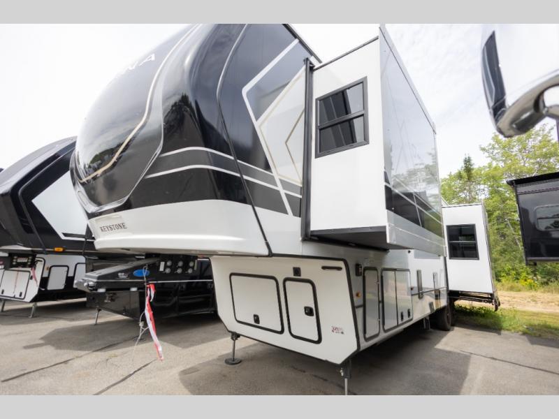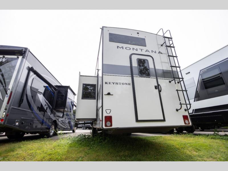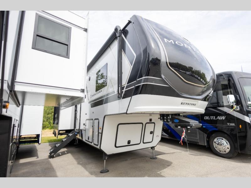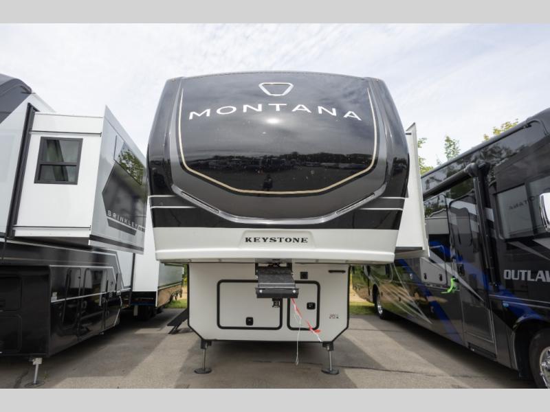 Enjoy luxury, innovation, and the outdoors in any one of Montana's finest fifth wheels. Each set the standard with exceptional features, and exciting factory installed options to provide you a great home on the road. Keystone's 12" I-beam chassis with z-frame technology provides a strong and durable foundation to your fifth wheel, and the four season living package will help extend your camping season. A few other construction features you will appreciate include a MORryde CRE3000 suspension, a fully walkable roof with an alpha seamless TPO membrane system, and 4k square frameless tinted safety glass windows. Each feature stylish interiors with two decor choices paired with beautiful hardwood cabinetry, Beauflor vinyl flooring throughout, central vacuum, plus a La-Z-Boy furniture package for all-around comfort!