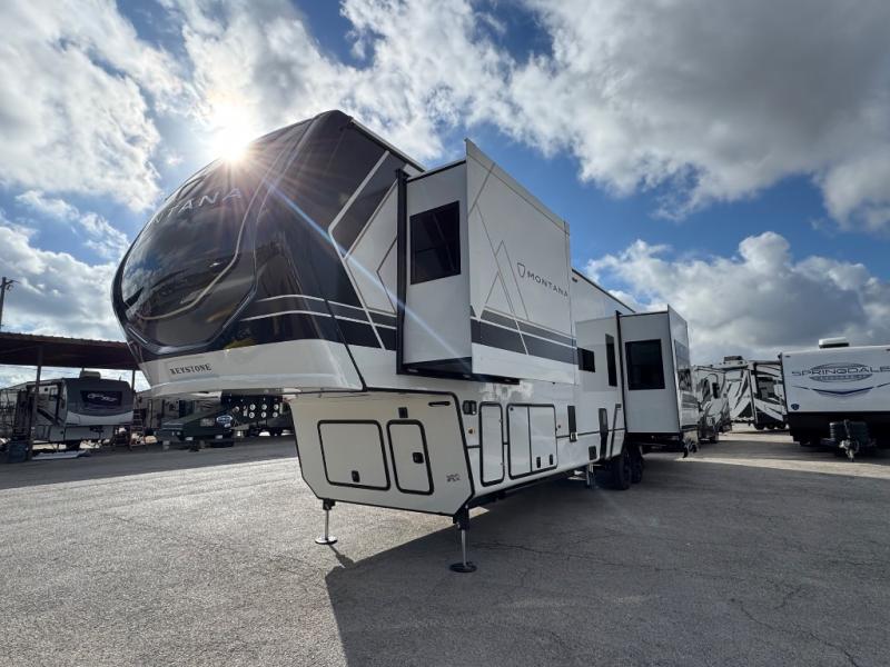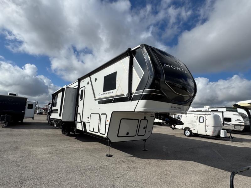 Enjoy luxury, innovation, and the outdoors in any one of Montana's finest fifth wheels. Each set the standard with exceptional features, and exciting factory installed options to provide you a great home on the road. Keystone's 12" I-beam chassis with z-frame technology provides a strong and durable foundation to your fifth wheel, and the four season living package will help extend your camping season. A few other construction features you will appreciate include a MORryde CRE3000 suspension, a fully walkable roof with an alpha seamless TPO membrane system, and 4k square frameless tinted safety glass windows. Each feature stylish interiors with two decor choices paired with beautiful hardwood cabinetry, Beauflor vinyl flooring throughout, central vacuum, plus a La-Z-Boy furniture package for all-around comfort!