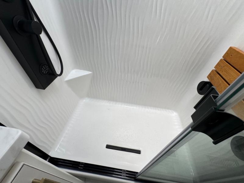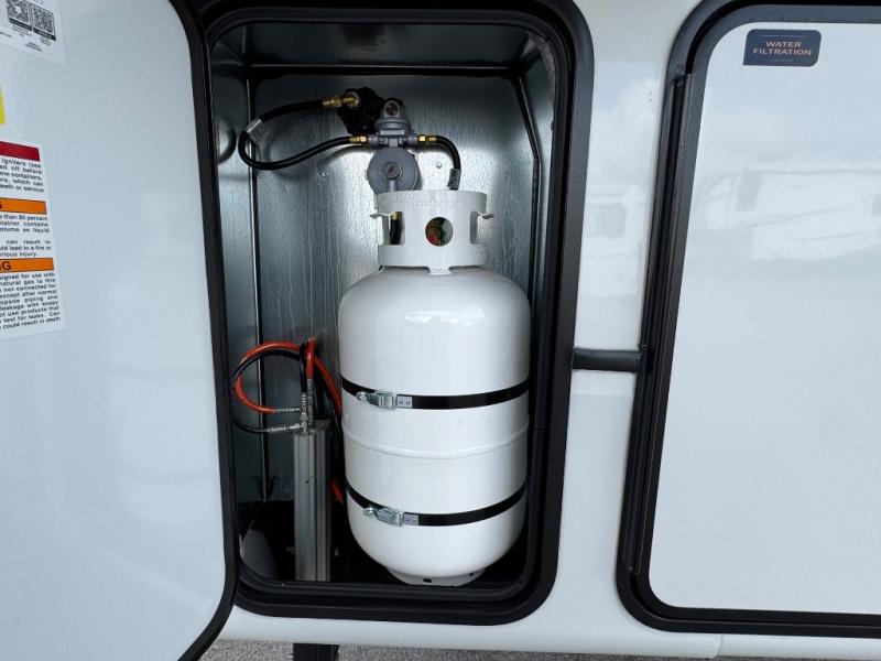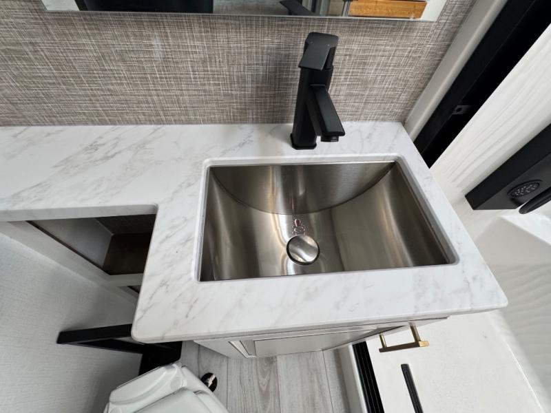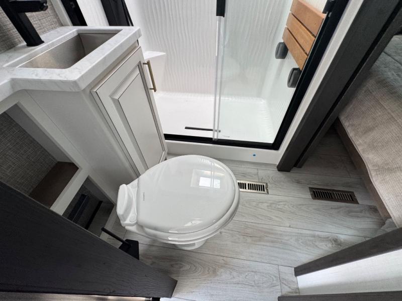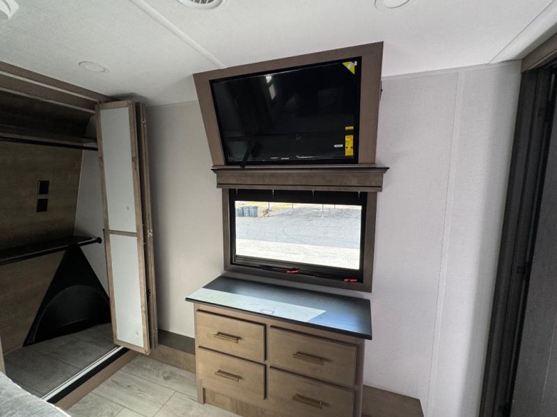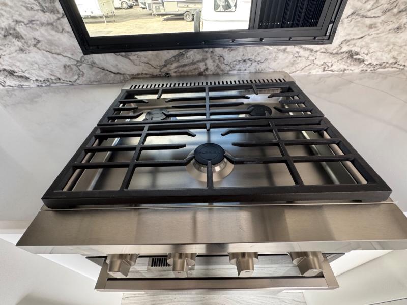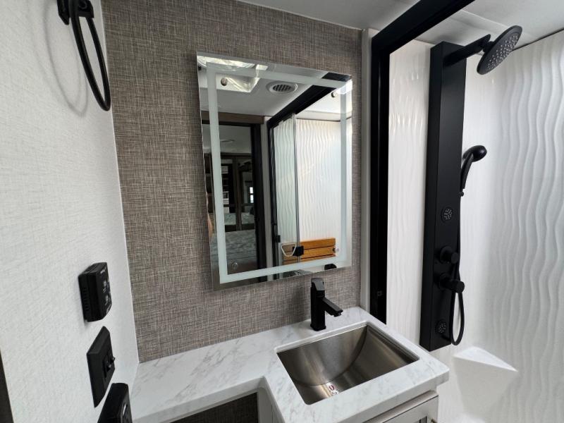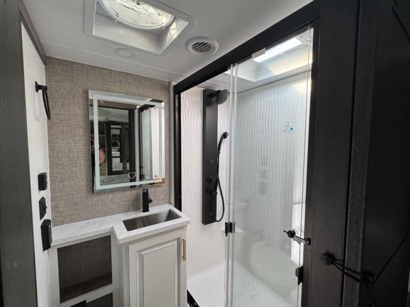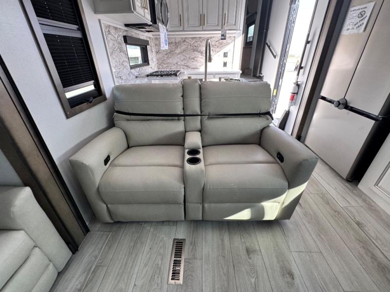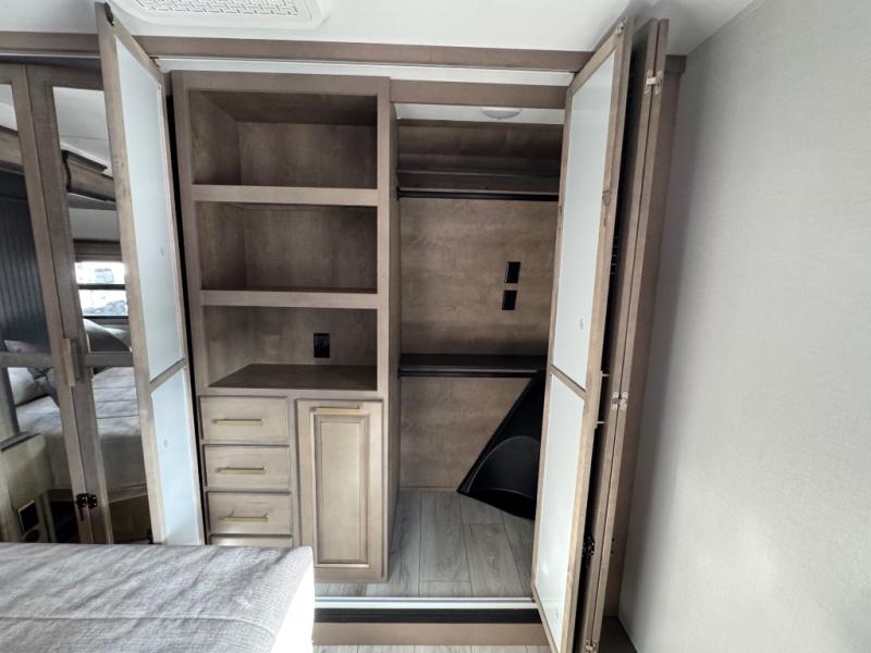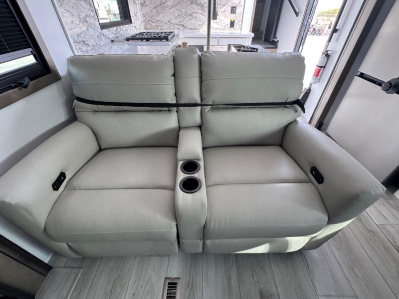 Traveling with friends and family is easier than ever with this fifth wheel in tow! There are two master suites; one for you and one for guests! The front master suite includes a king bed slide out, two closets plus additional storage, plus stackable washer/dryer prep if you want the option to make wash day easier. There is also convenient underbed storage, a dresser with a Smart HD TV, plus a private entrance into the dual entry bath. Head to the rear master suite to find just as much comfort with a queen bed slide out, dual closets and a dresser, plus a full rear bath where the second entry door is located. There is also a loft area above this room with three bunk mats for more campers! The middle kitchen and living area includes many comforts, like the power theater seating across from the 50" Smart TV and hide-a-bed sofa, plus the U-shaped kitchen with ample counter space and a 24" range. You'll also find food storage in the pantry and 18 cu. ft. residential refrigerator with an ice maker, or you can choose the slightly larger optional 20 cu. ft. refrigerator!