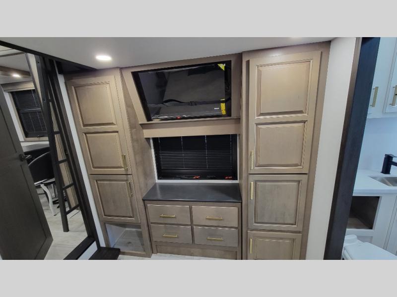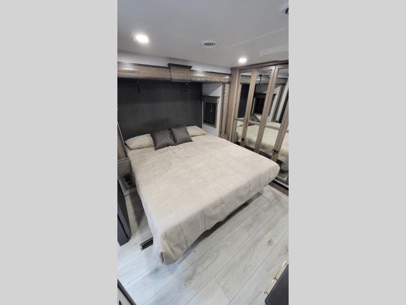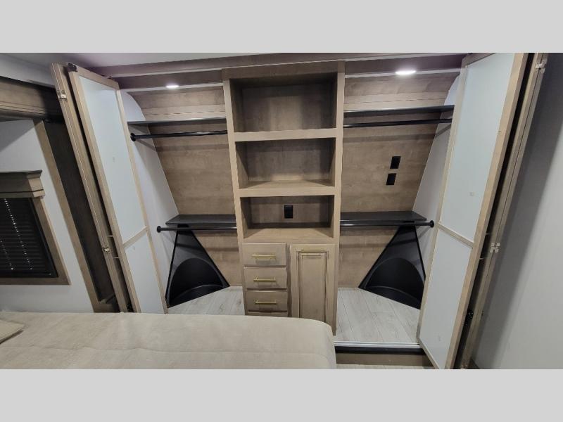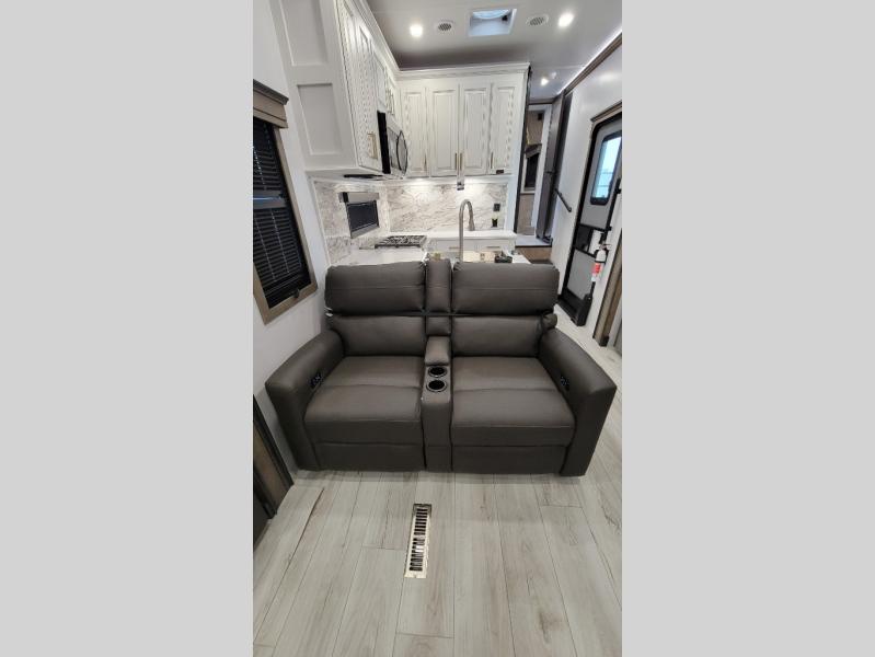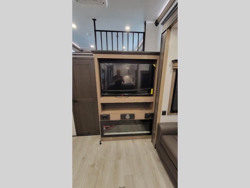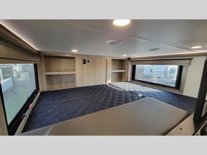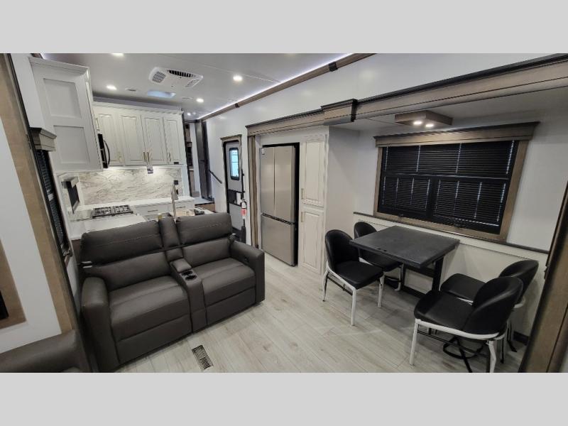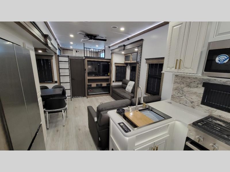 Traveling with friends and family is easier than ever with this fifth wheel in tow! There are two master suites; one for you and one for guests! The front master suite includes a king bed slide out, two closets plus additional storage, plus stackable washer/dryer prep if you want the option to make wash day easier. There is also convenient underbed storage, a dresser with a Smart HD TV, plus a private entrance into the dual entry bath. Head to the rear master suite to find just as much comfort with a queen bed slide out, dual closets and a dresser, plus a full rear bath where the second entry door is located. There is also a loft area above this room with three bunk mats for more campers! The middle kitchen and living area includes many comforts, like the power theater seating across from the 50" Smart TV and hide-a-bed sofa, plus the U-shaped kitchen with ample counter space and a 24" range. You'll also find food storage in the pantry and 18 cu. ft. residential refrigerator with an ice maker, or you can choose the slightly larger optional 20 cu. ft. refrigerator!