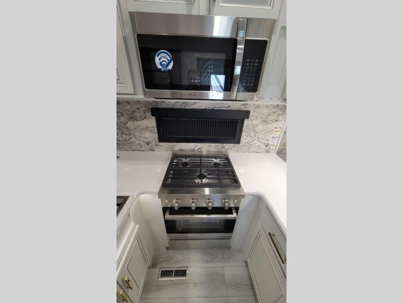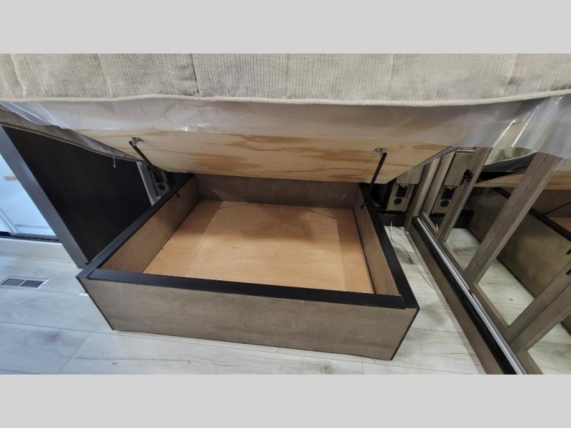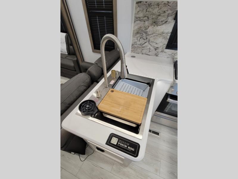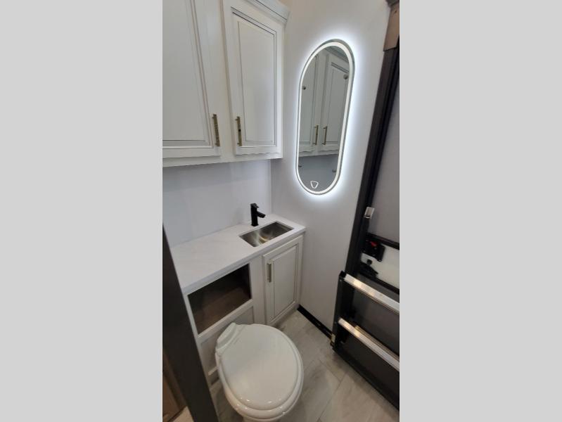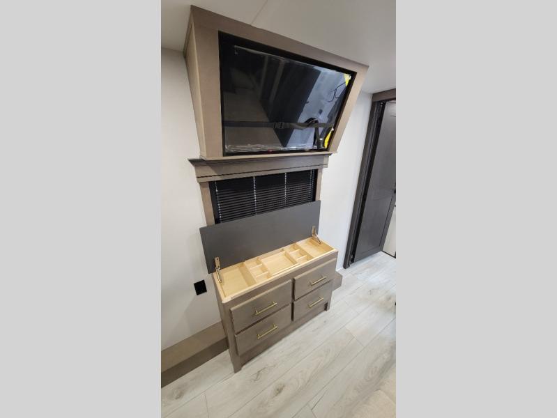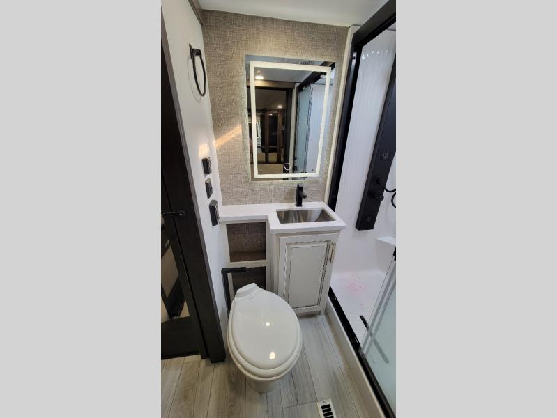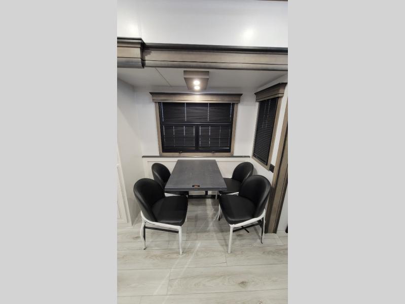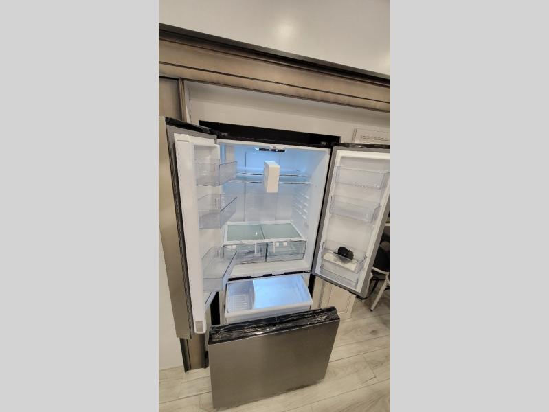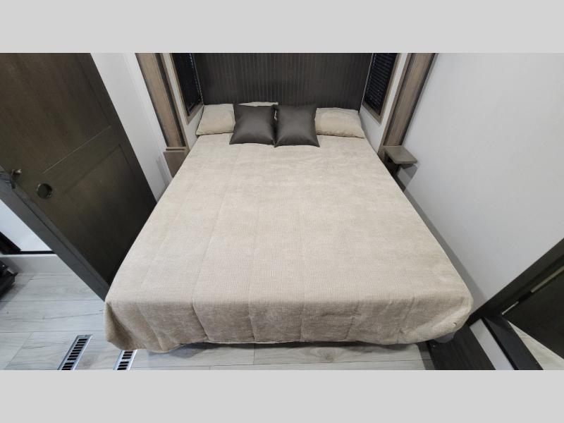 Traveling with friends and family is easier than ever with this fifth wheel in tow! There are two master suites; one for you and one for guests! The front master suite includes a king bed slide out, two closets plus additional storage, plus stackable washer/dryer prep if you want the option to make wash day easier. There is also convenient underbed storage, a dresser with a Smart HD TV, plus a private entrance into the dual entry bath. Head to the rear master suite to find just as much comfort with a queen bed slide out, dual closets and a dresser, plus a full rear bath where the second entry door is located. There is also a loft area above this room with three bunk mats for more campers! The middle kitchen and living area includes many comforts, like the power theater seating across from the 50" Smart TV and hide-a-bed sofa, plus the U-shaped kitchen with ample counter space and a 24" range. You'll also find food storage in the pantry and 18 cu. ft. residential refrigerator with an ice maker, or you can choose the slightly larger optional 20 cu. ft. refrigerator!