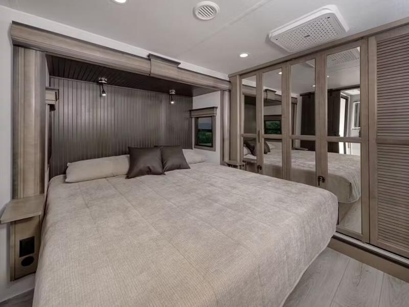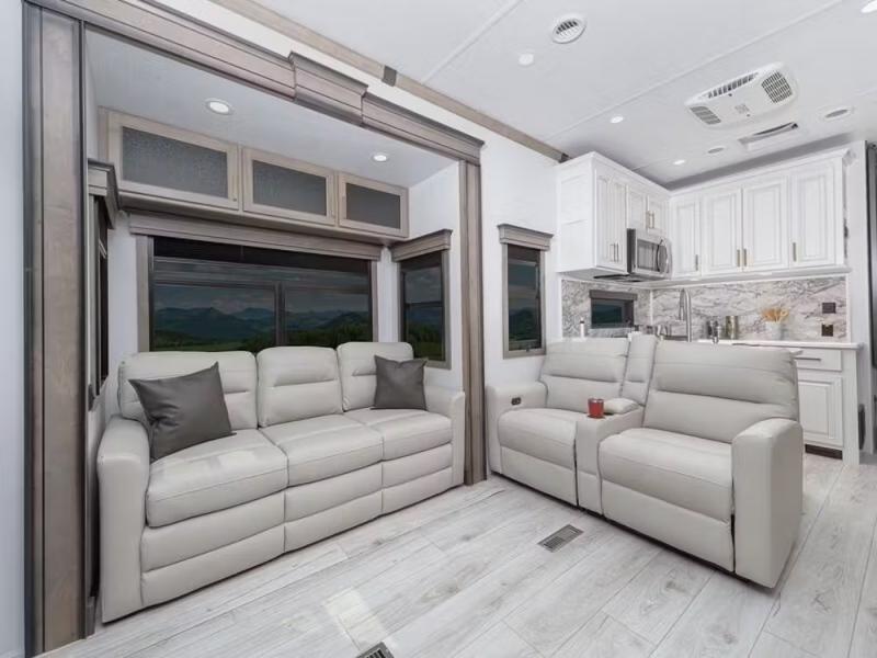 Traveling with friends and family is easier than ever with this fifth wheel in tow! There are two master suites; one for you and one for guests! The front master suite includes a king bed slide out, two closets plus additional storage, plus stackable washer/dryer prep if you want the option to make wash day easier. There is also convenient underbed storage, a dresser with a Smart HD TV, plus a private entrance into the dual entry bath. Head to the rear master suite to find just as much comfort with a queen bed slide out, dual closets and a dresser, plus a full rear bath where the second entry door is located. There is also a loft area above this room with three bunk mats for more campers! The middle kitchen and living area includes many comforts, like the power theater seating across from the 50" Smart TV and hide-a-bed sofa, plus the U-shaped kitchen with ample counter space and a 24" range. You'll also find food storage in the pantry and 18 cu. ft. residential refrigerator with an ice maker, or you can choose the slightly larger optional 20 cu. ft. refrigerator!