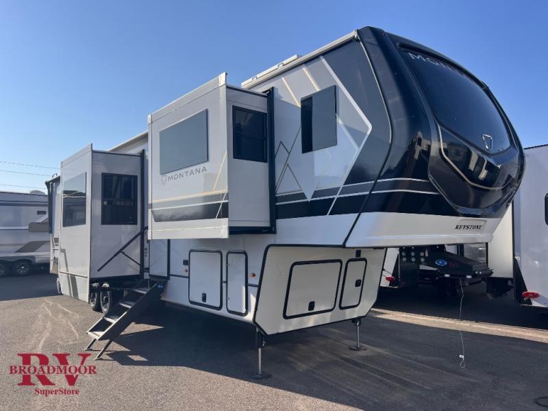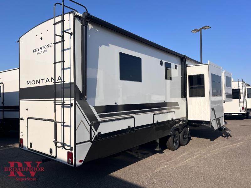 Enjoy luxury, innovation, and the outdoors in any one of Montana's finest fifth wheels. Each set the standard with exceptional features, and exciting factory installed options to provide you a great home on the road. Keystone's 12" I-beam chassis with z-frame technology provides a strong and durable foundation to your fifth wheel, and the four season living package will help extend your camping season. A few other construction features you will appreciate include a MORryde CRE3000 suspension, a fully walkable roof with an alpha seamless TPO membrane system, and 4k square frameless tinted safety glass windows. Each feature stylish interiors with two decor choices paired with beautiful hardwood cabinetry, Beauflor vinyl flooring throughout, central vacuum, plus a La-Z-Boy furniture package for all-around comfort!