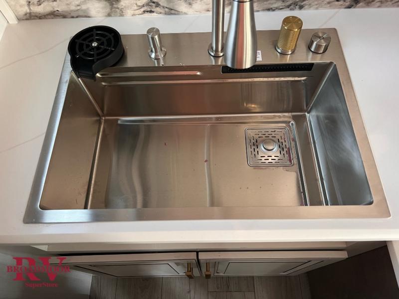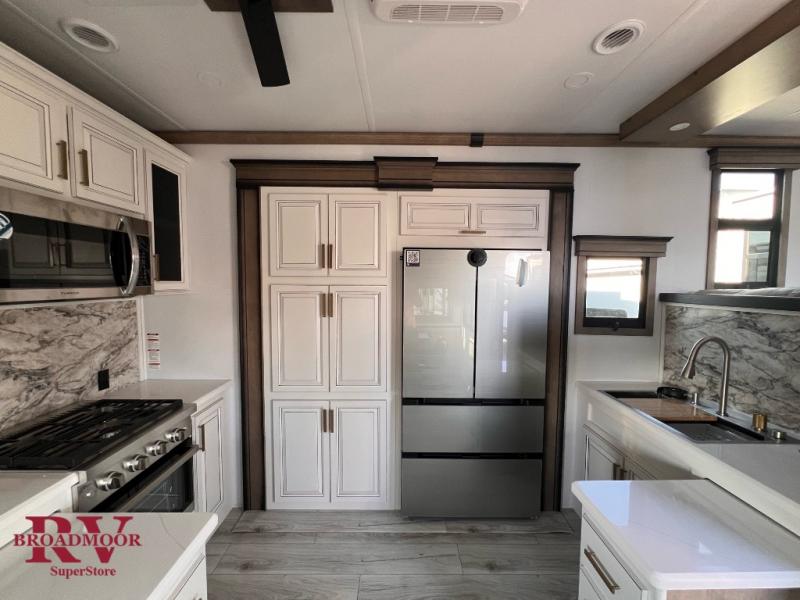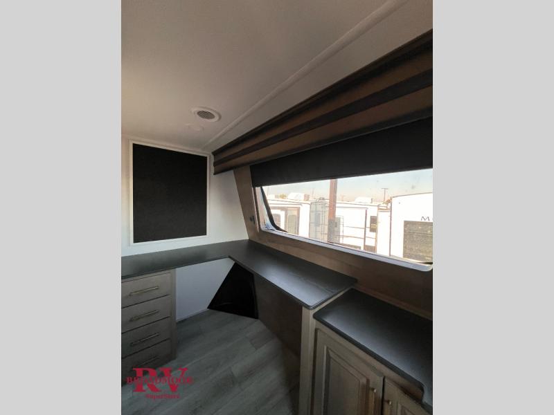 Life will be easier at the campground in this fifth wheel with five slides and an outdoor kitchen! The spacious full bathroom has a 48" x 30" fiberglass shower with a seat and skylight above, a linen closet to keep your towels close, and a stylish sliding door. The bedroom has a king bed slide with storage underneath across from a dresser with a 32" HDTV, as well as a large closet and an additional closet with stackable washer and dryer prep. The chef can prepare their best meals with extra counter space provided by the roll-out counters and the glass top range with a convection microwave, plus there is a pantry and a pivot dinette to enjoy your meals at. The front of this fifth wheel is where it stands out above the rest; there is a spacious living area with two hide-a-bed sofas, power theater seating, and a private front office, complete with a desk, storage, and counter space!