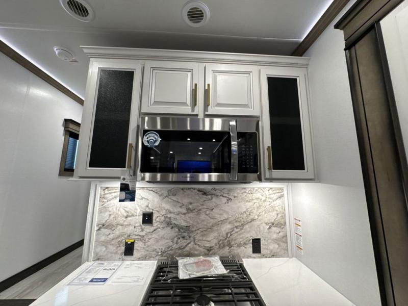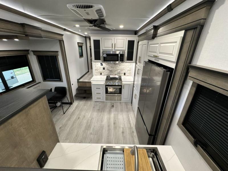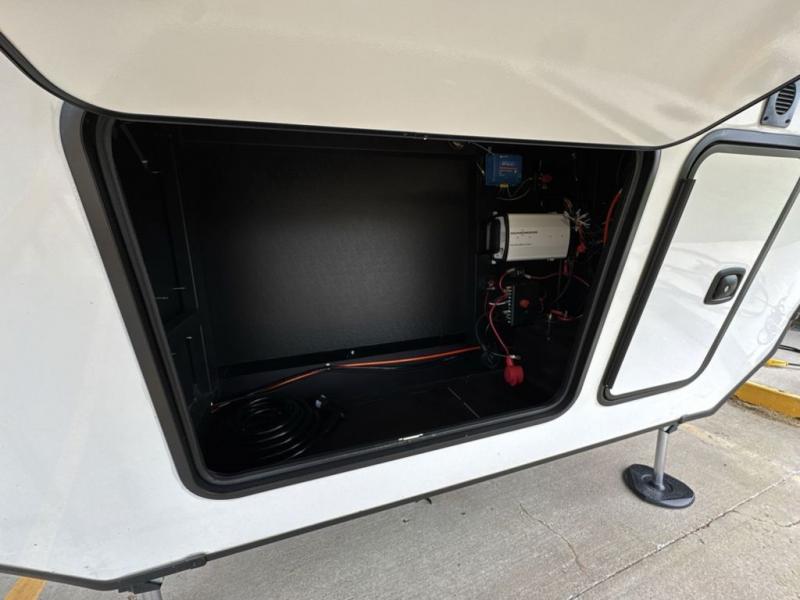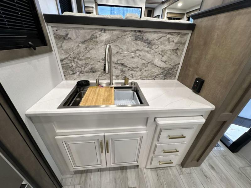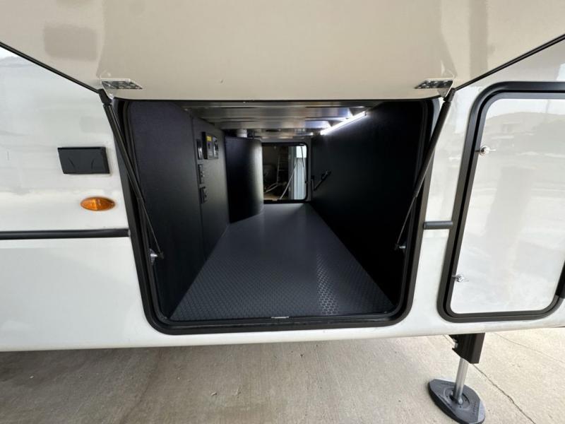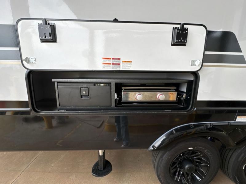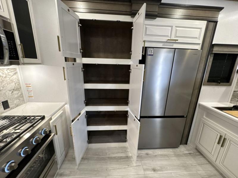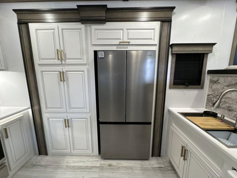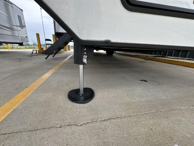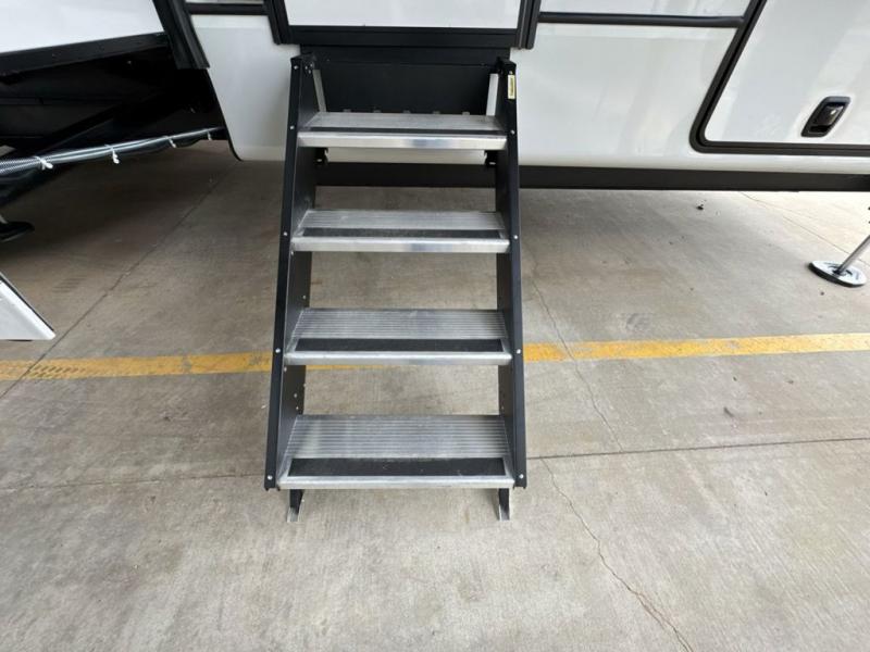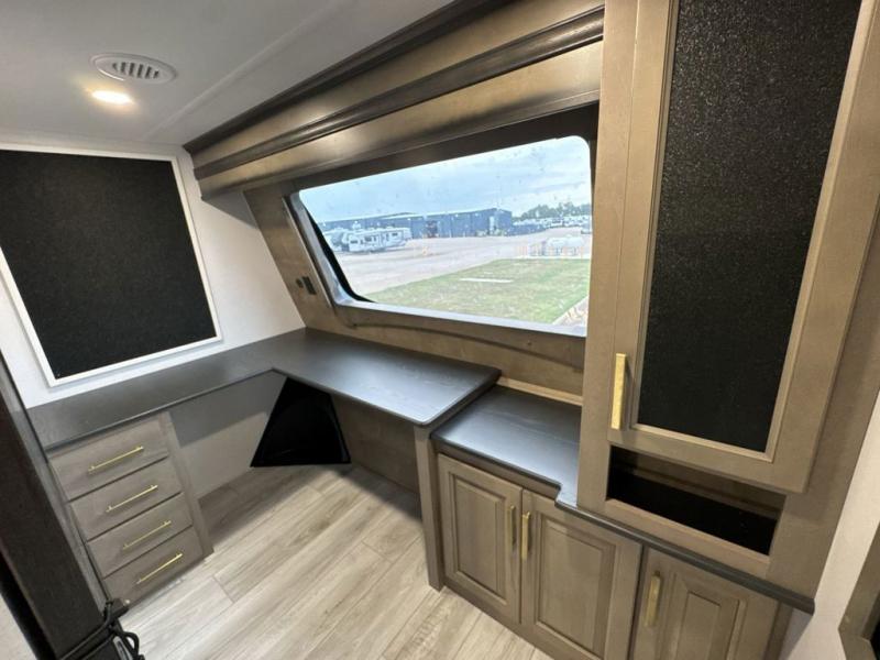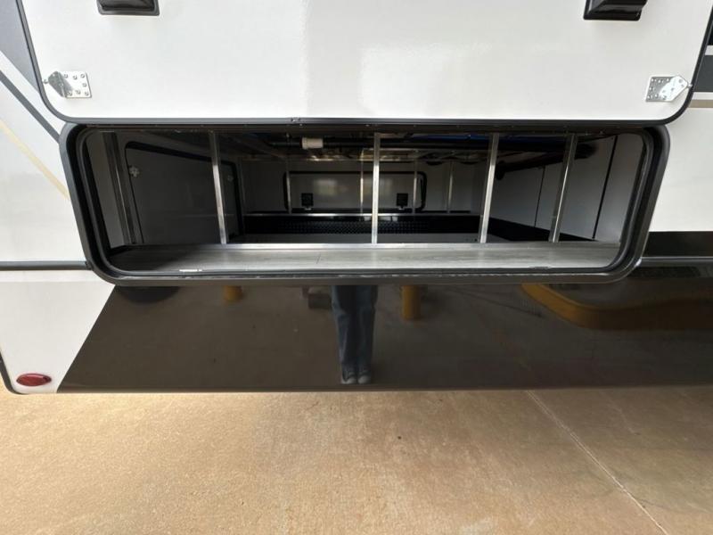 Life will be easier at the campground in this fifth wheel with five slides and an outdoor kitchen! The spacious full bathroom has a 48" x 30" fiberglass shower with a seat and skylight above, a linen closet to keep your towels close, and a stylish sliding door. The bedroom has a king bed slide with storage underneath across from a dresser with a 32" HDTV, as well as a large closet and an additional closet with stackable washer and dryer prep. The chef can prepare their best meals with extra counter space provided by the roll-out counters and the glass top range with a convection microwave, plus there is a pantry and a pivot dinette to enjoy your meals at. The front of this fifth wheel is where it stands out above the rest; there is a spacious living area with two hide-a-bed sofas, power theater seating, and a private front office, complete with a desk, storage, and counter space!