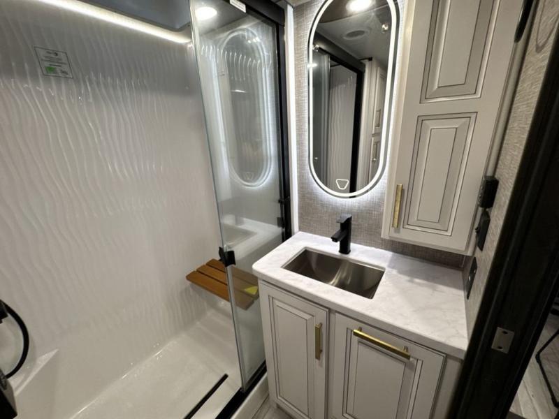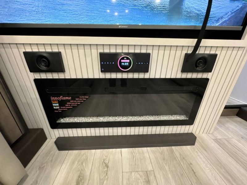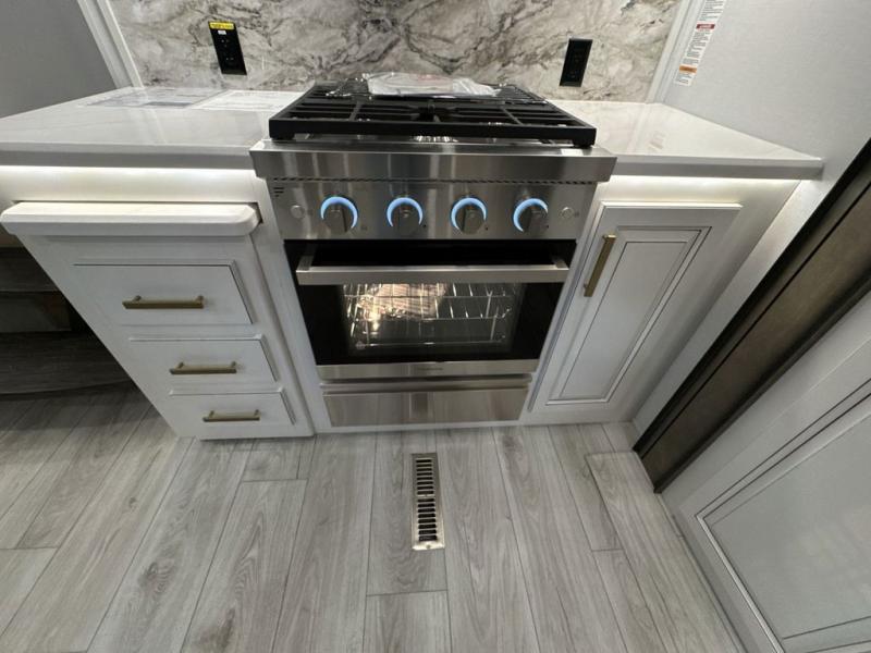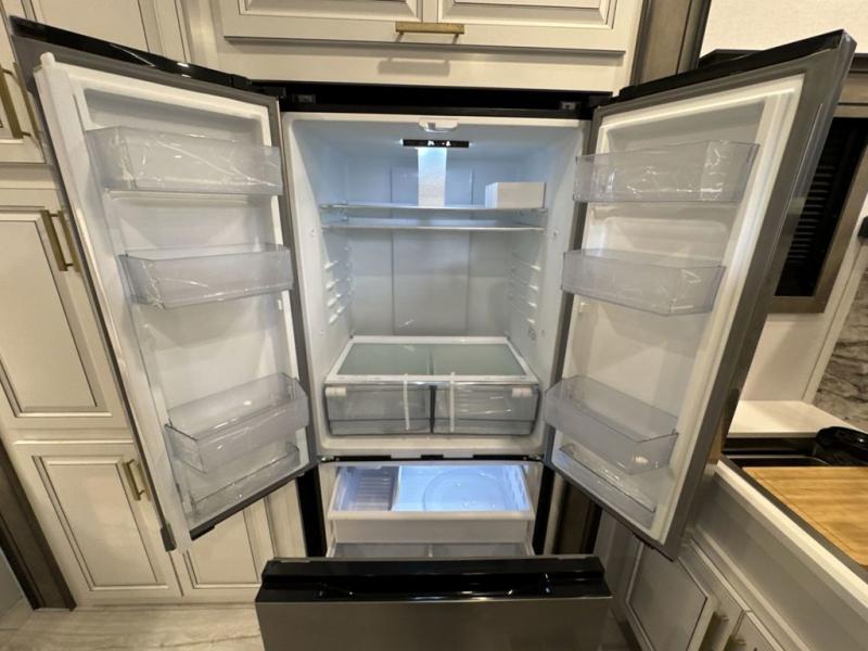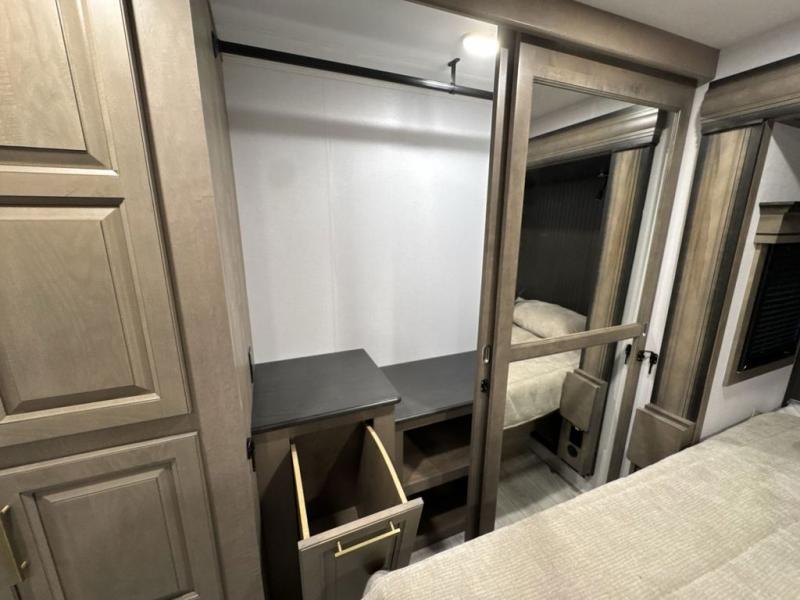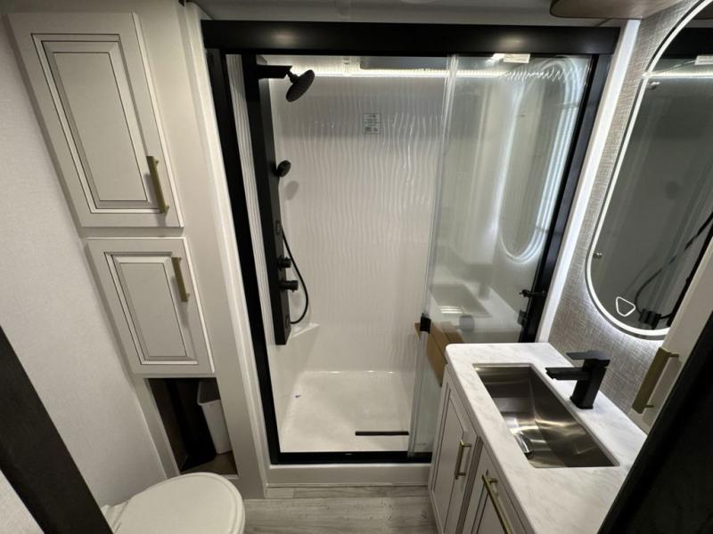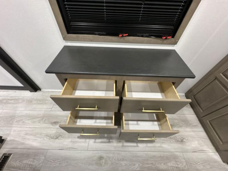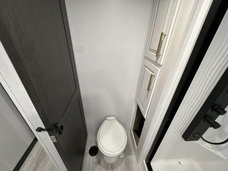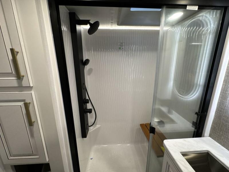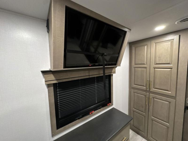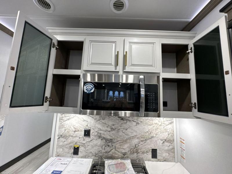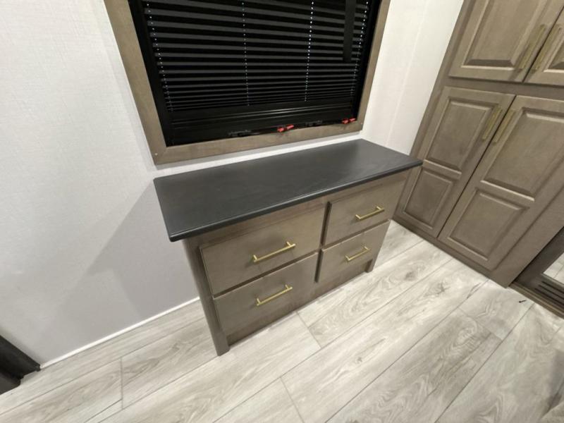 Life will be easier at the campground in this fifth wheel with five slides and an outdoor kitchen! The spacious full bathroom has a 48" x 30" fiberglass shower with a seat and skylight above, a linen closet to keep your towels close, and a stylish sliding door. The bedroom has a king bed slide with storage underneath across from a dresser with a 32" HDTV, as well as a large closet and an additional closet with stackable washer and dryer prep. The chef can prepare their best meals with extra counter space provided by the roll-out counters and the glass top range with a convection microwave, plus there is a pantry and a pivot dinette to enjoy your meals at. The front of this fifth wheel is where it stands out above the rest; there is a spacious living area with two hide-a-bed sofas, power theater seating, and a private front office, complete with a desk, storage, and counter space!