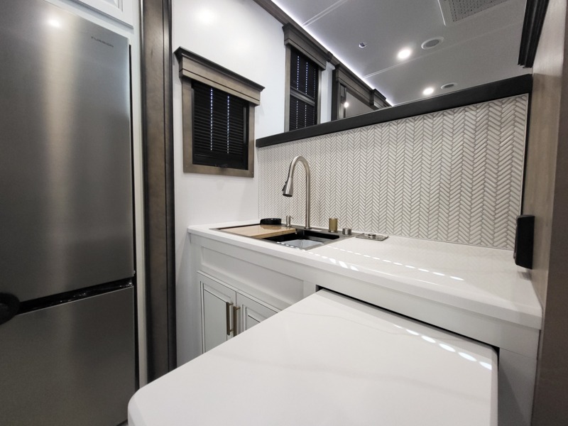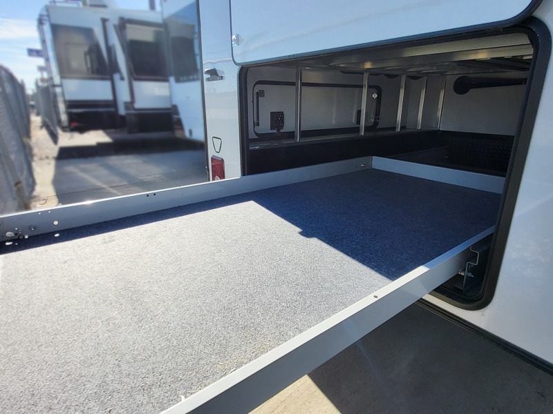 Life will be easier at the campground in this fifth wheel with five slides and an outdoor kitchen! The spacious full bathroom has a 48" x 30" fiberglass shower with a seat and skylight above, a linen closet to keep your towels close, and a stylish sliding door. The bedroom has a king bed slide with storage underneath across from a dresser with a 32" HDTV, as well as a large closet and an additional closet with stackable washer and dryer prep. The chef can prepare their best meals with extra counter space provided by the roll-out counters and the glass top range with a convection microwave, plus there is a pantry and a pivot dinette to enjoy your meals at. The front of this fifth wheel is where it stands out above the rest; there is a spacious living area with two hide-a-bed sofas, power theater seating, and a private front office, complete with a desk, storage, and counter space!