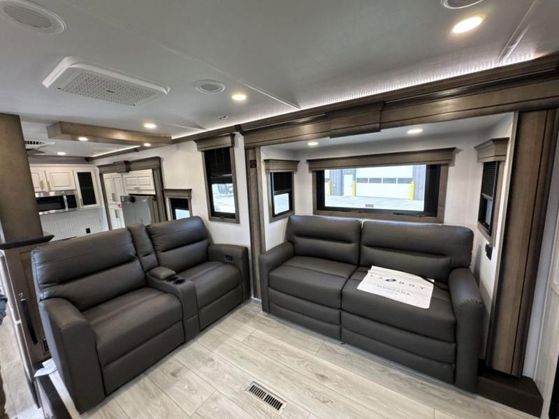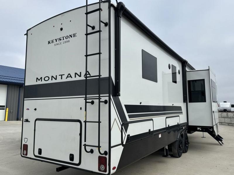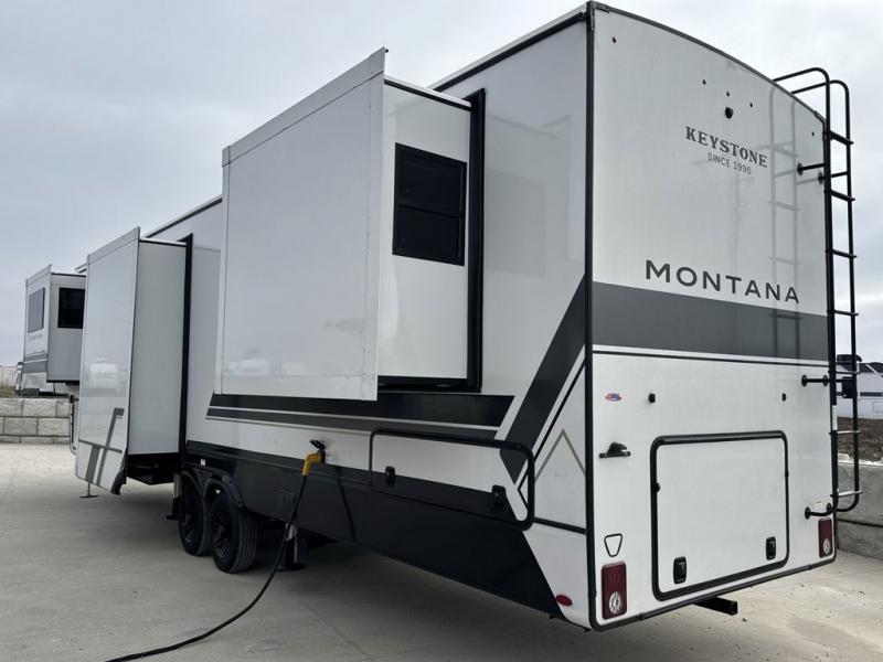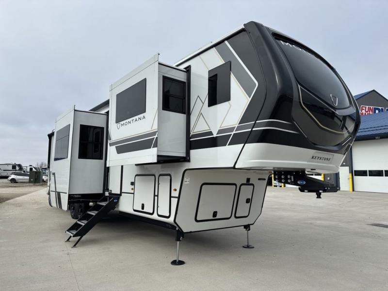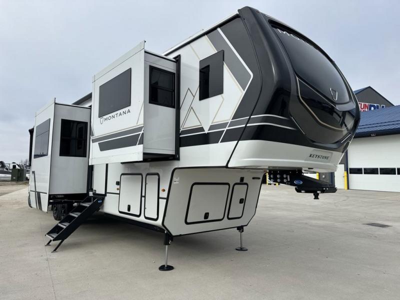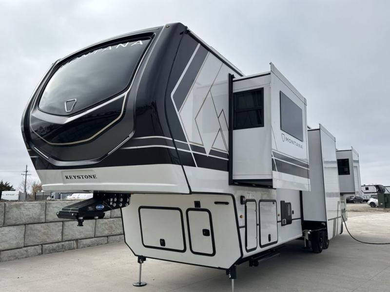 Enjoy luxury, innovation, and the outdoors in any one of Montana's finest fifth wheels. Each set the standard with exceptional features, and exciting factory installed options to provide you a great home on the road. Keystone's 12" I-beam chassis with z-frame technology provides a strong and durable foundation to your fifth wheel, and the four season living package will help extend your camping season. A few other construction features you will appreciate include a MORryde CRE3000 suspension, a fully walkable roof with an alpha seamless TPO membrane system, and 4k square frameless tinted safety glass windows. Each feature stylish interiors with two decor choices paired with beautiful hardwood cabinetry, Beauflor vinyl flooring throughout, central vacuum, plus a La-Z-Boy furniture package for all-around comfort!