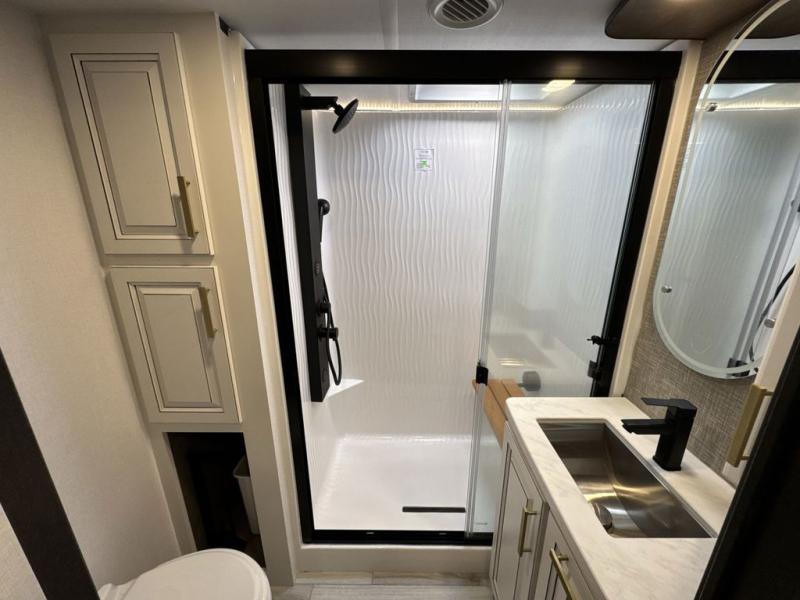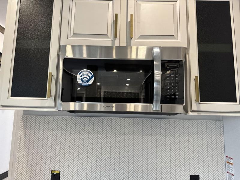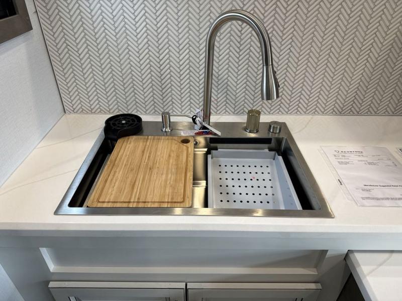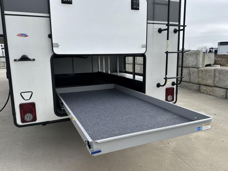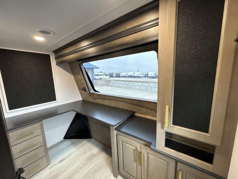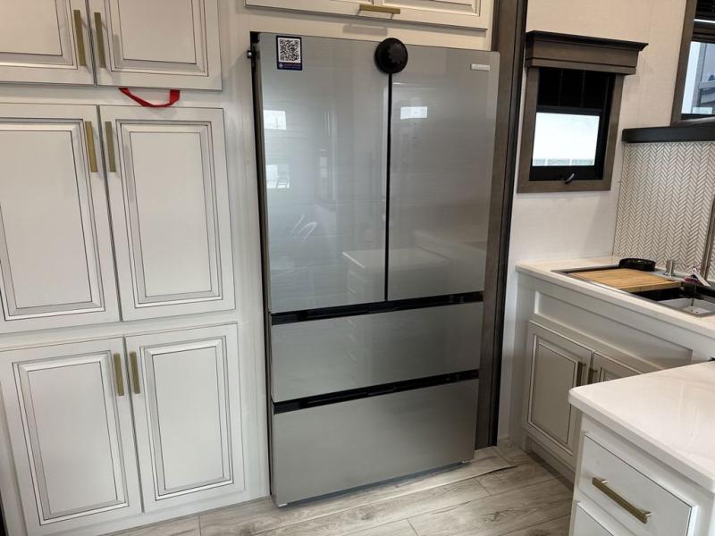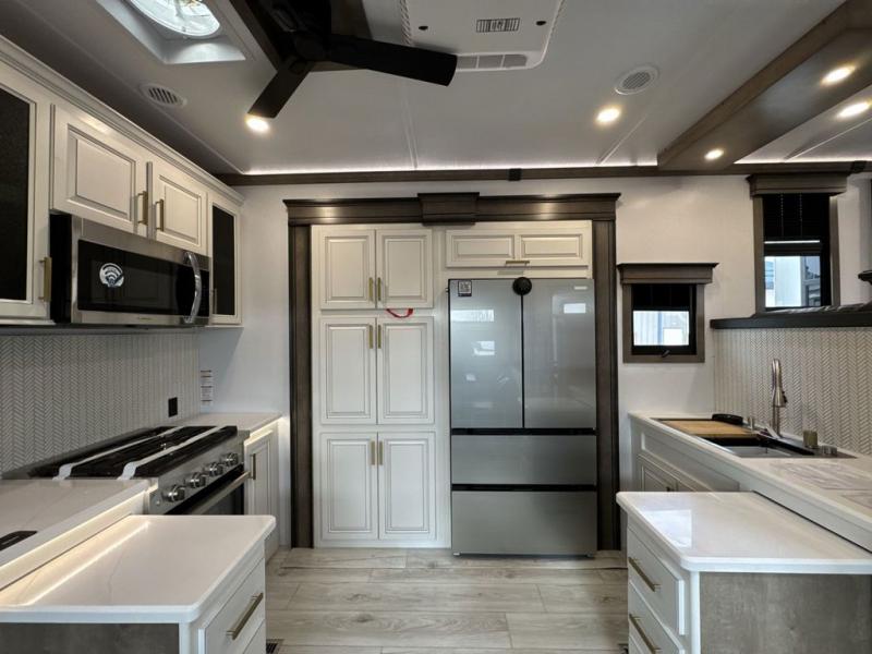 Life will be easier at the campground in this fifth wheel with five slides and an outdoor kitchen! The spacious full bathroom has a 48" x 30" fiberglass shower with a seat and skylight above, a linen closet to keep your towels close, and a stylish sliding door. The bedroom has a king bed slide with storage underneath across from a dresser with a 32" HDTV, as well as a large closet and an additional closet with stackable washer and dryer prep. The chef can prepare their best meals with extra counter space provided by the roll-out counters and the glass top range with a convection microwave, plus there is a pantry and a pivot dinette to enjoy your meals at. The front of this fifth wheel is where it stands out above the rest; there is a spacious living area with two hide-a-bed sofas, power theater seating, and a private front office, complete with a desk, storage, and counter space!