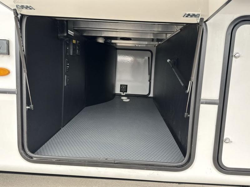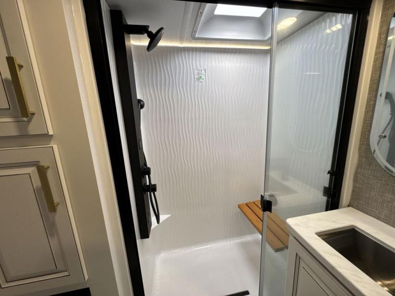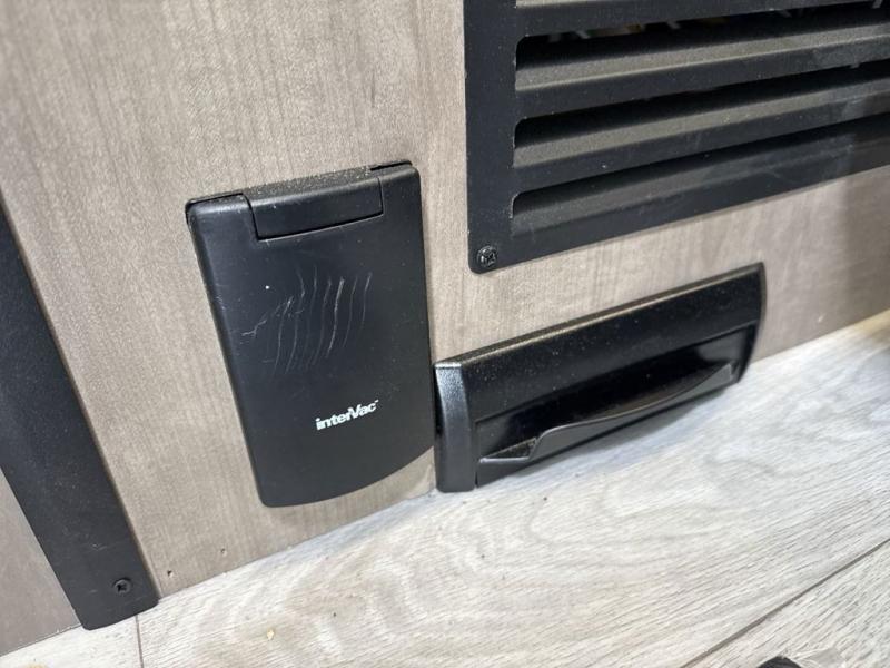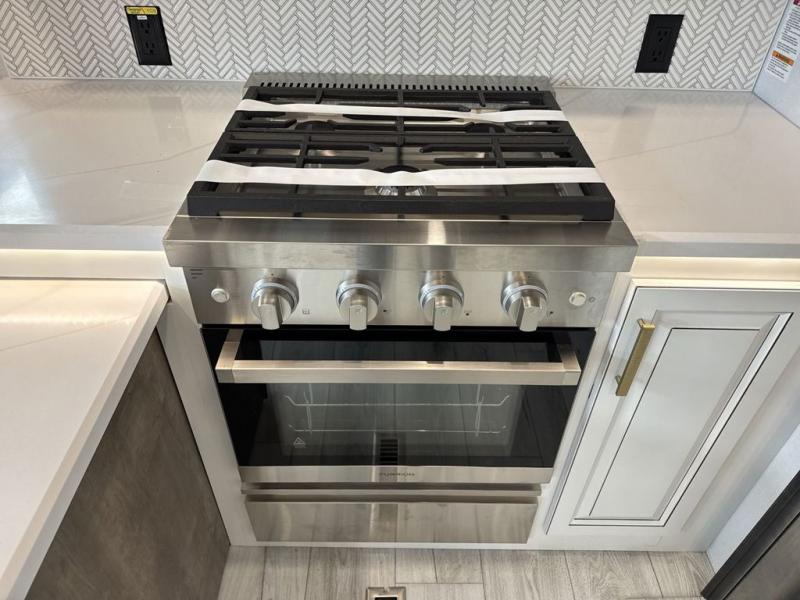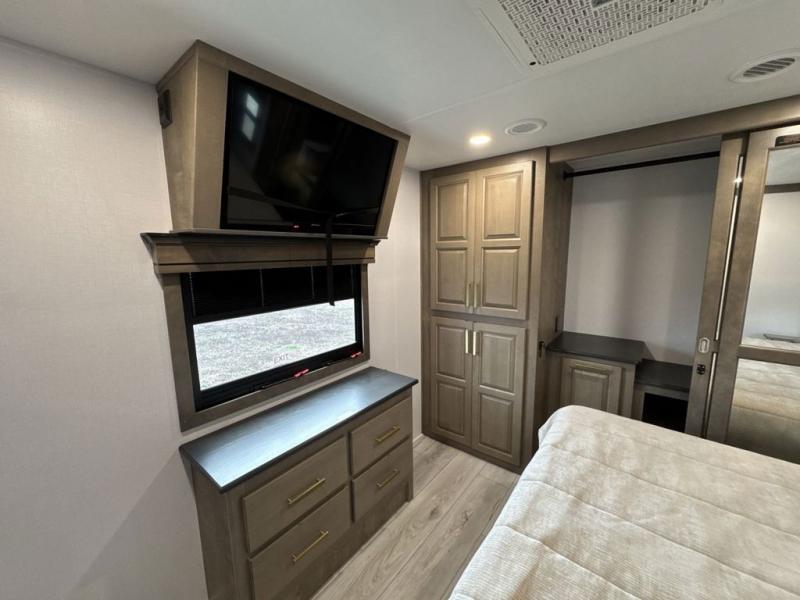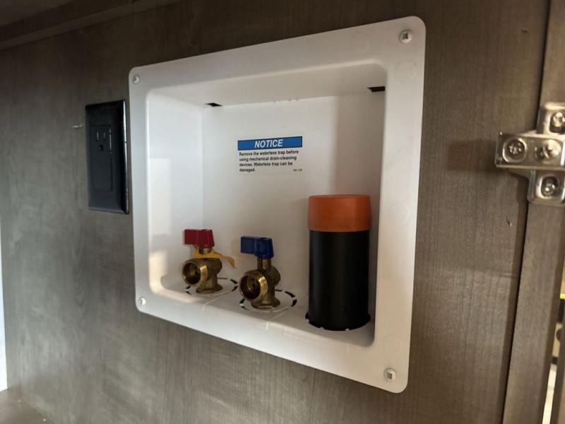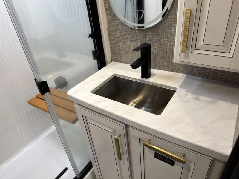 Life will be easier at the campground in this fifth wheel with five slides and an outdoor kitchen! The spacious full bathroom has a 48" x 30" fiberglass shower with a seat and skylight above, a linen closet to keep your towels close, and a stylish sliding door. The bedroom has a king bed slide with storage underneath across from a dresser with a 32" HDTV, as well as a large closet and an additional closet with stackable washer and dryer prep. The chef can prepare their best meals with extra counter space provided by the roll-out counters and the glass top range with a convection microwave, plus there is a pantry and a pivot dinette to enjoy your meals at. The front of this fifth wheel is where it stands out above the rest; there is a spacious living area with two hide-a-bed sofas, power theater seating, and a private front office, complete with a desk, storage, and counter space!