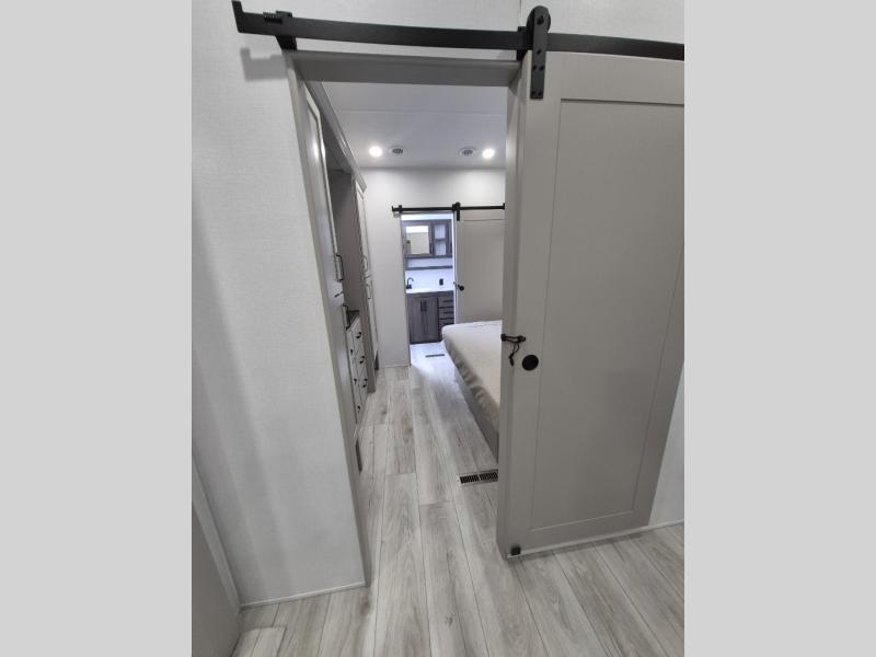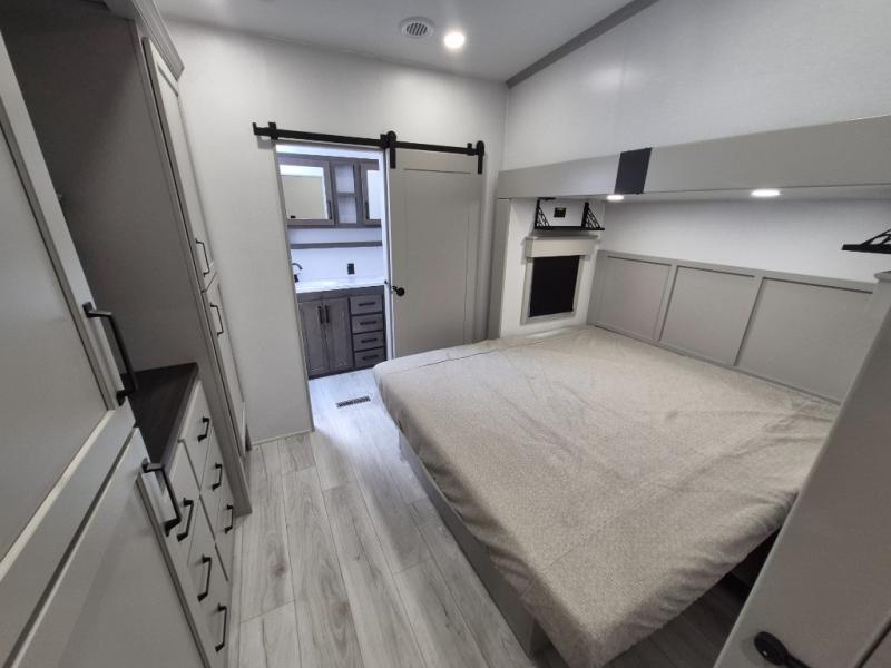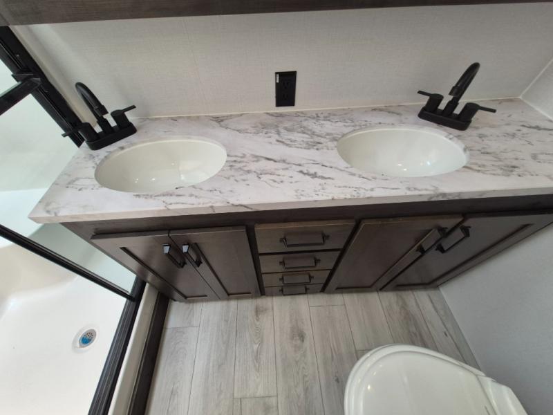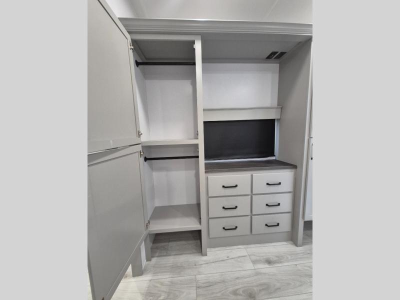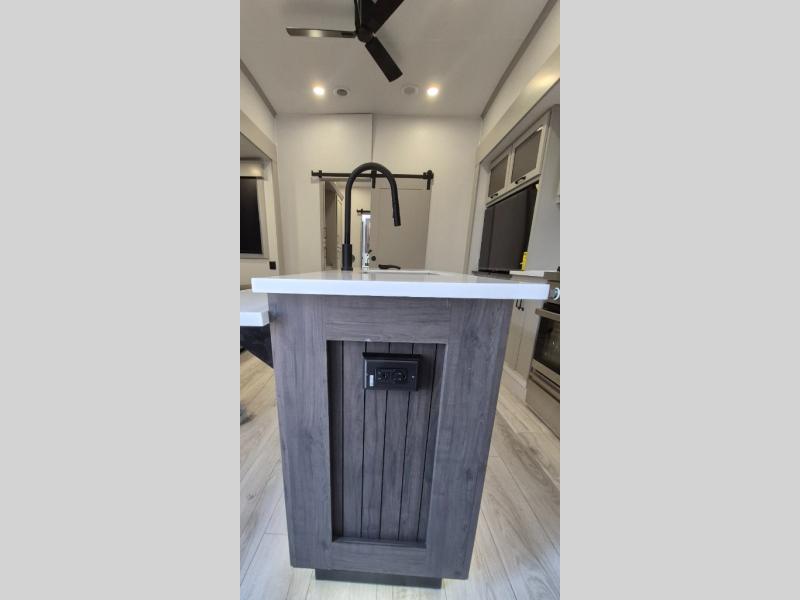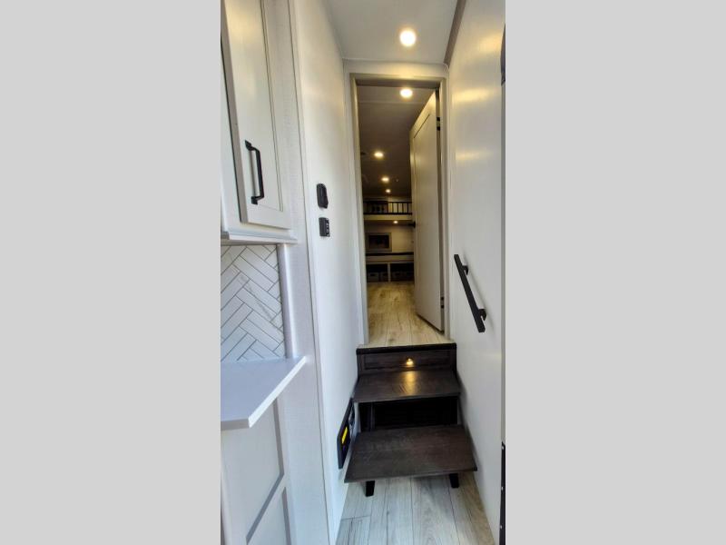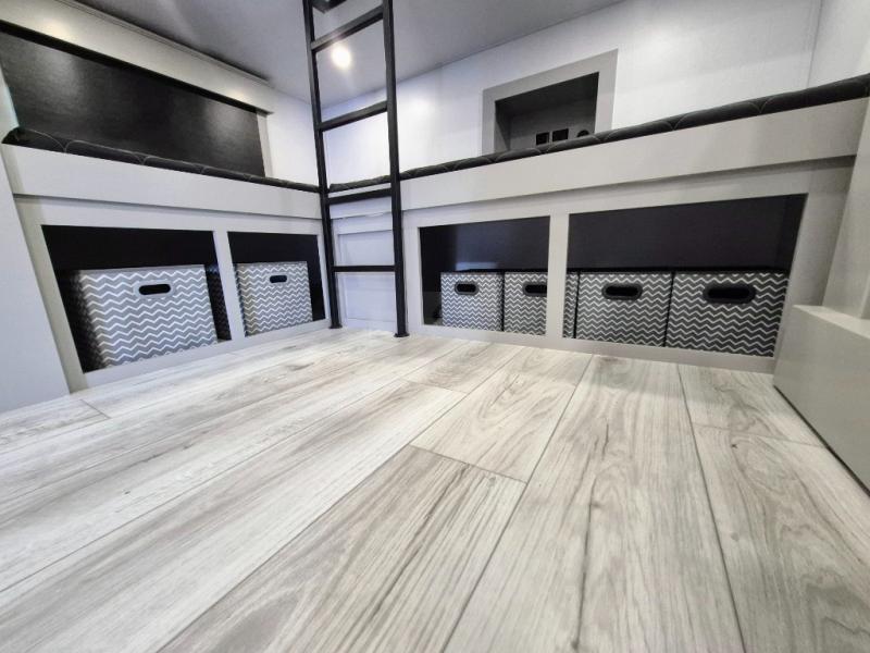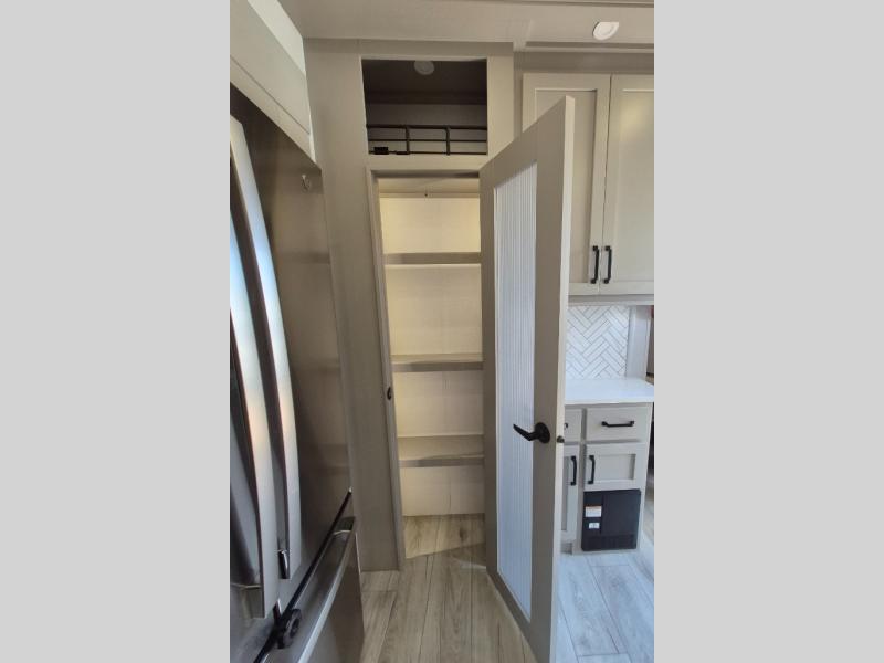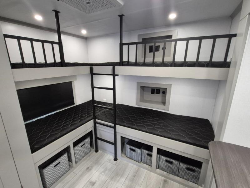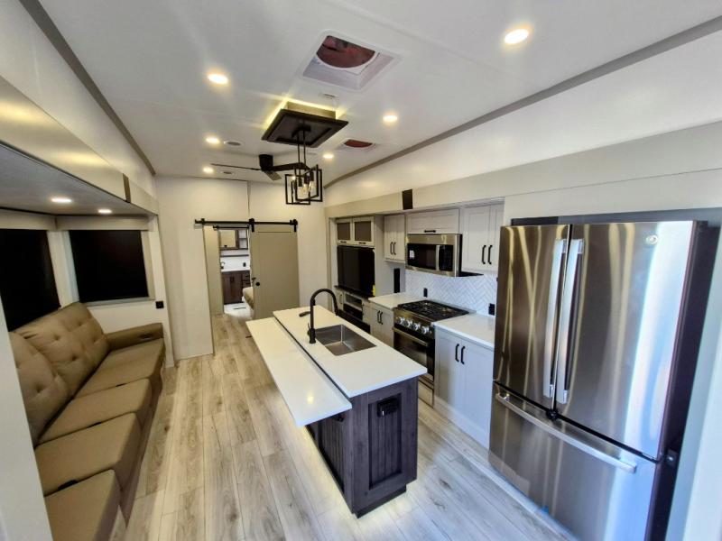 You'll love every minute spent in this spacious fifth wheel! It's perfect to camp with a larger group since there are bunk beds in the front bunkhouse suite plus a second suite in the back. The bunkhouse also includes two desks with chairs and storage drawers, a full bath, plus washer and dryer prep if you plan to go full-time. The rear suite features a king bed slide, two closets, a bedroom countertop plus a full rear bath with dual bath sinks; how convenient! Everyone will love to meet in the combined kitchen and living area in the morning. Here, you'll find two large opposing slides for tons of space, a large sofa and kitchen island, plus three pantries for all the snacks, canned goods, and paper products!