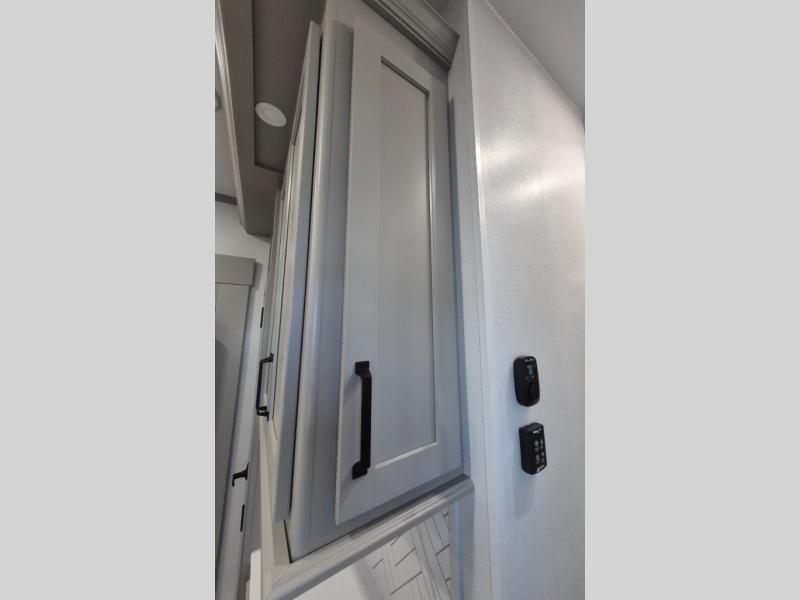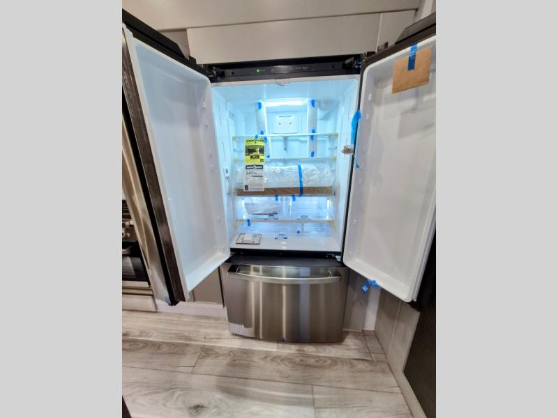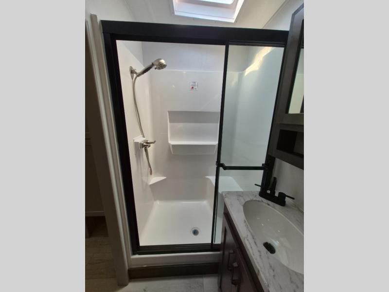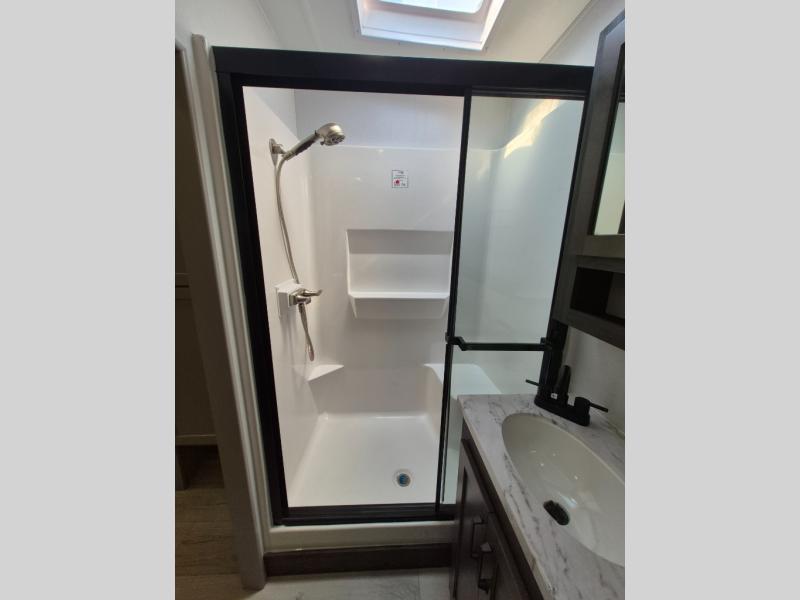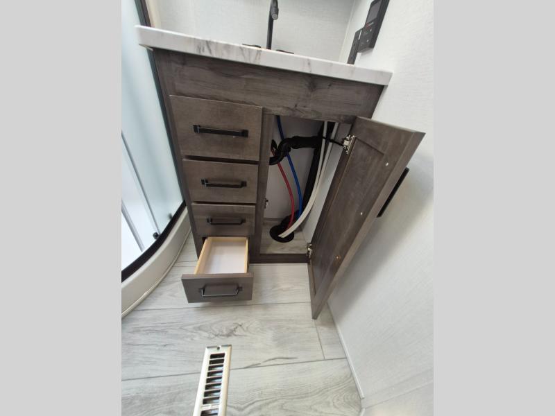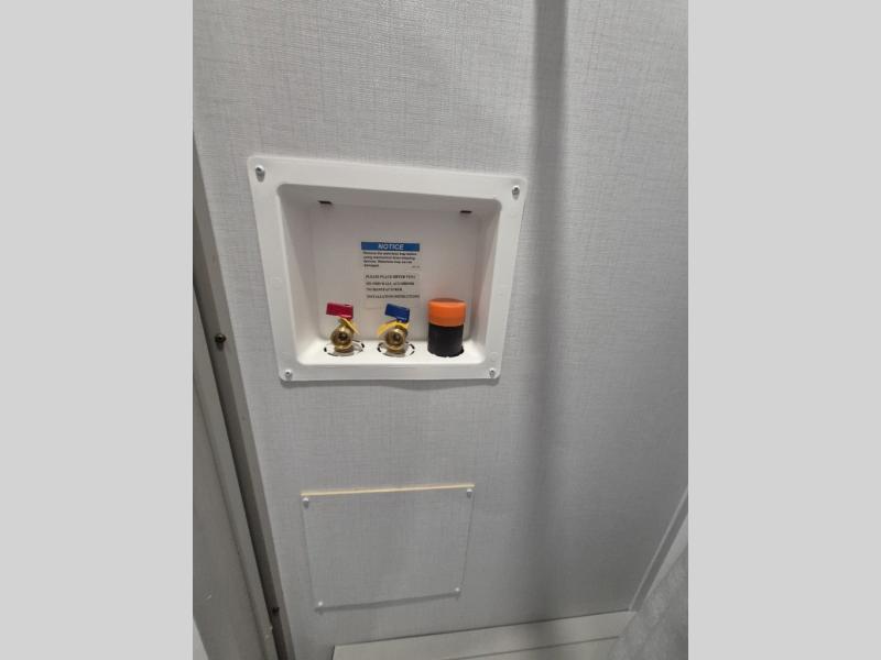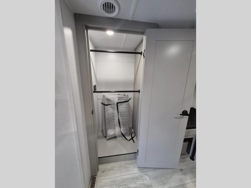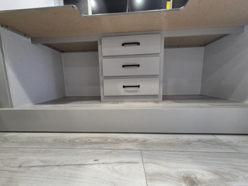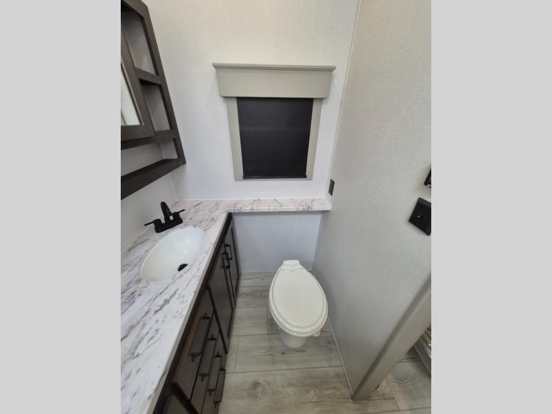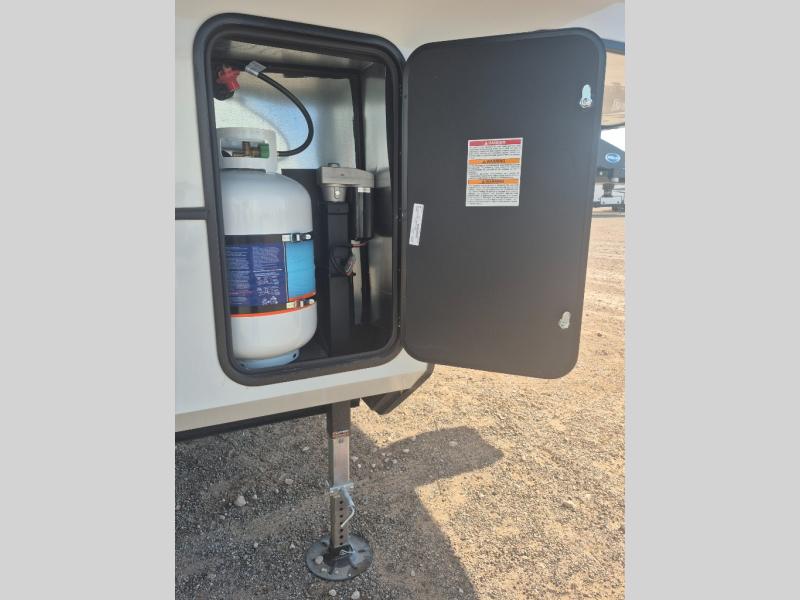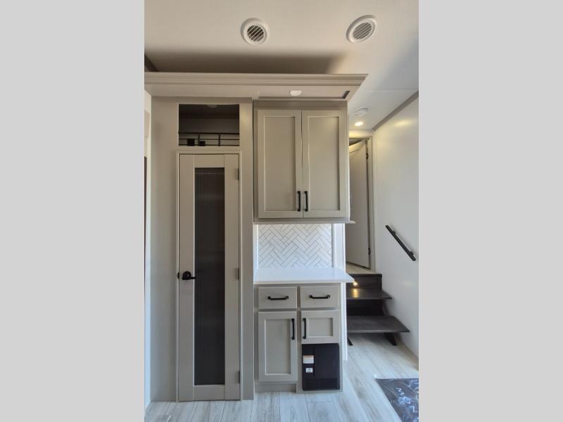 You'll love every minute spent in this spacious fifth wheel! It's perfect to camp with a larger group since there are bunk beds in the front bunkhouse suite plus a second suite in the back. The bunkhouse also includes two desks with chairs and storage drawers, a full bath, plus washer and dryer prep if you plan to go full-time. The rear suite features a king bed slide, two closets, a bedroom countertop plus a full rear bath with dual bath sinks; how convenient! Everyone will love to meet in the combined kitchen and living area in the morning. Here, you'll find two large opposing slides for tons of space, a large sofa and kitchen island, plus three pantries for all the snacks, canned goods, and paper products!