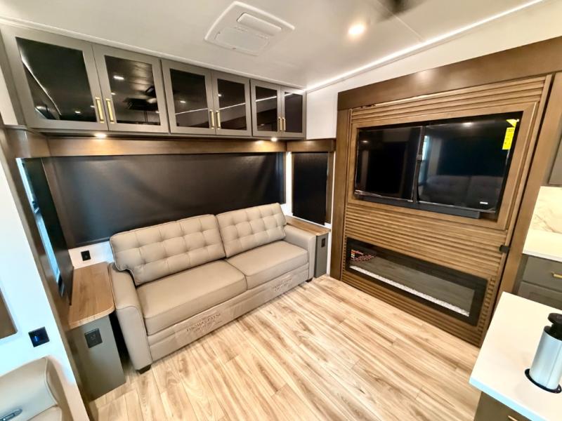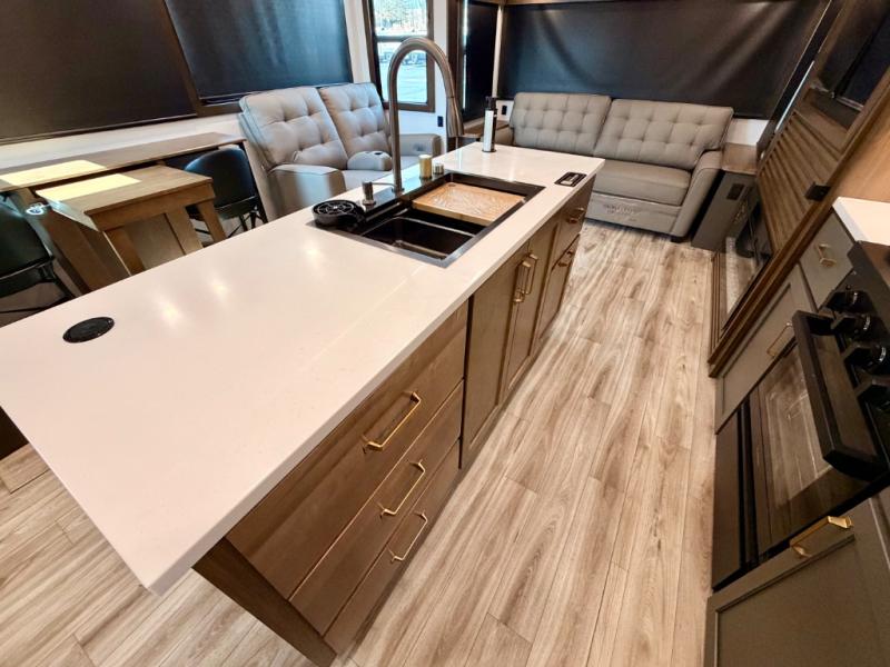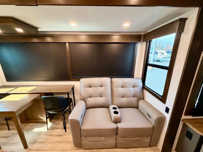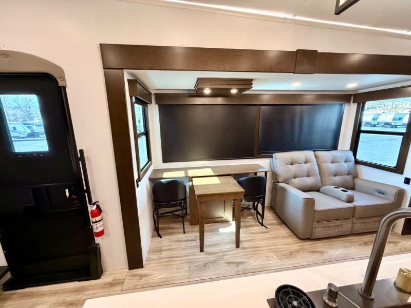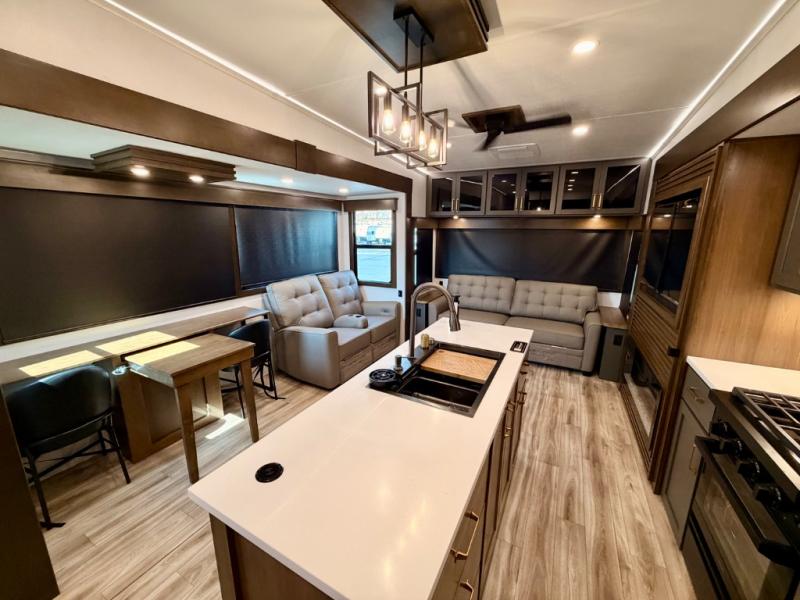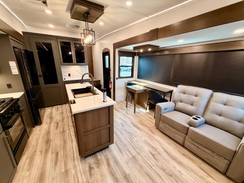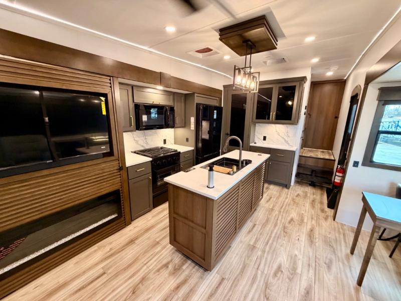 You'll love camping in this fifth wheel with a rear living room and triple slides for ample interior space! The sofa, theater seating, and adjustable sliding 'Deskette" with chairs will provide comfortable seating, dining, and working space, and the entertainment center with a fireplace will make it feel more like home. A large kitchen island gives you more counter space when making meals in the full kitchen, and the spacious full bath is a comfort you won't want to camp without. Up front, you'll find a private bedroom with a king bed slide, storage space and TV prep if you want the option to watch movies in bed.