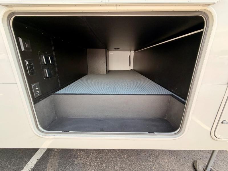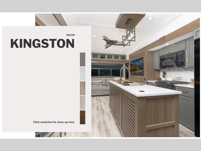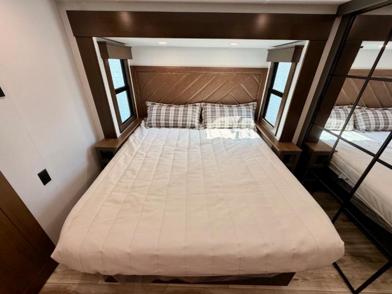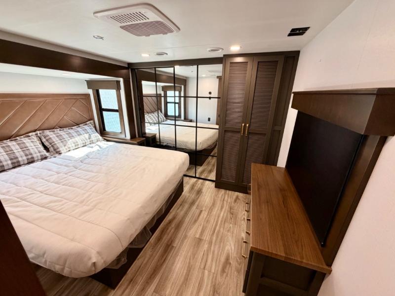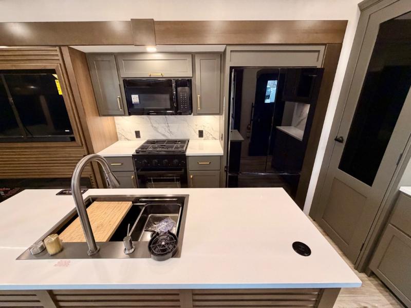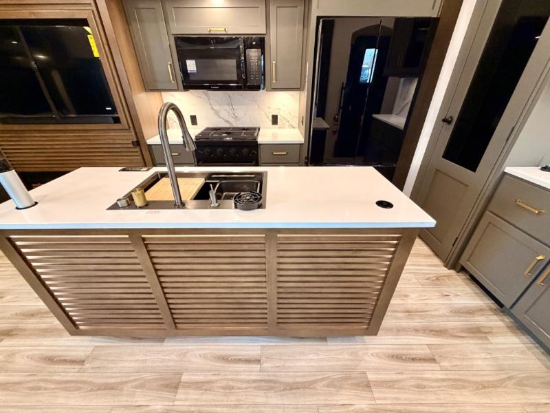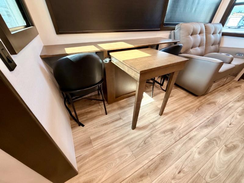 You'll love camping in this fifth wheel with a rear living room and triple slides for ample interior space! The sofa, theater seating, and adjustable sliding 'Deskette" with chairs will provide comfortable seating, dining, and working space, and the entertainment center with a fireplace will make it feel more like home. A large kitchen island gives you more counter space when making meals in the full kitchen, and the spacious full bath is a comfort you won't want to camp without. Up front, you'll find a private bedroom with a king bed slide, storage space and TV prep if you want the option to watch movies in bed.