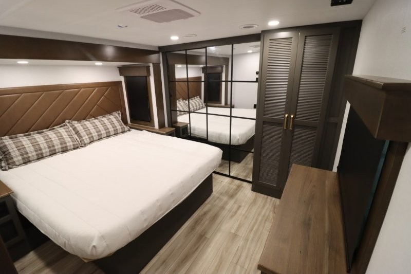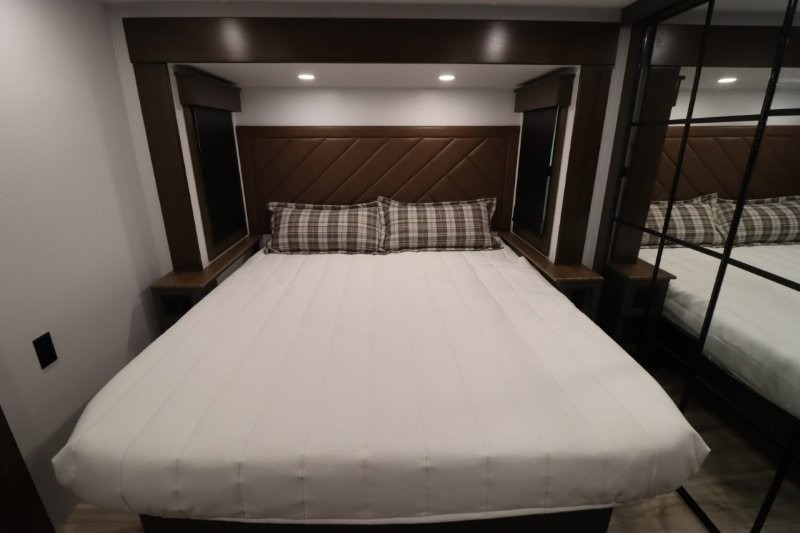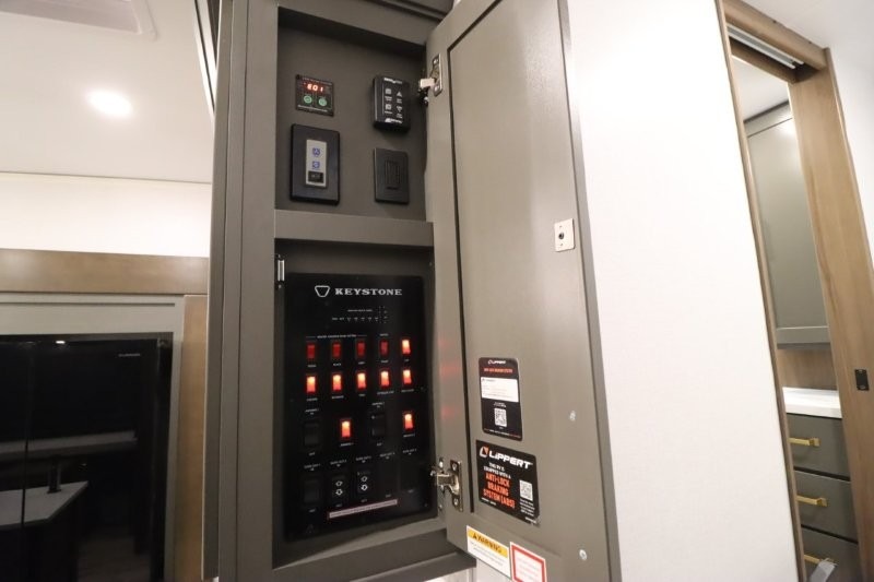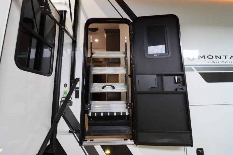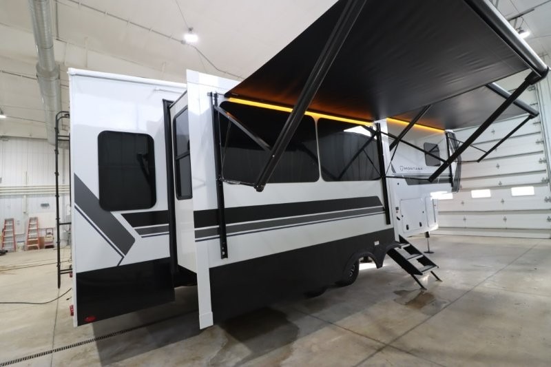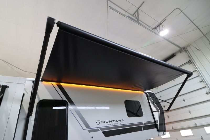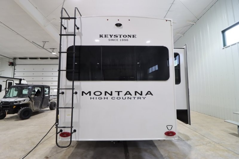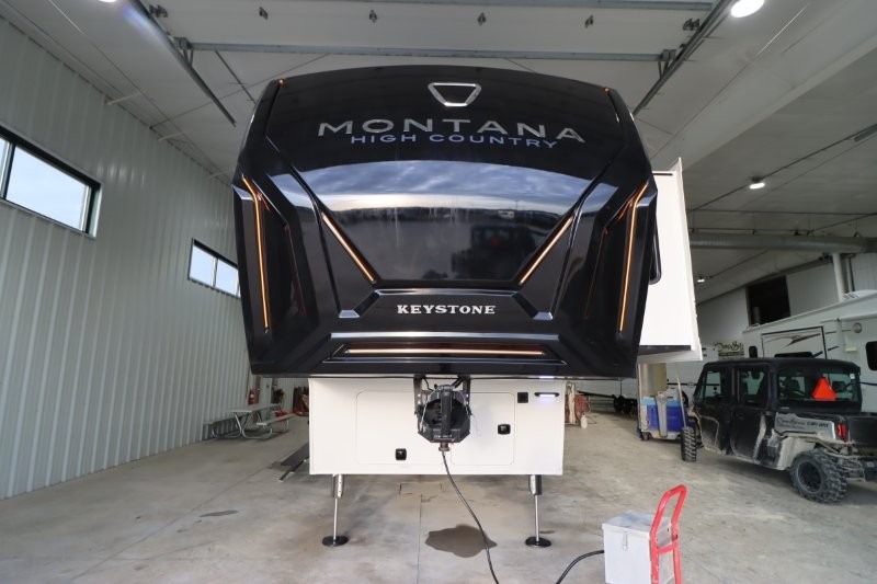 With any Montana High Country fifth wheel by Keystone, you'll find comfort and convenience at every turn! Each unit is built with a fully walkable roof with an Alpha seamless TPO membrane system, 2" thick composite backed high-gloss fiberglass sidewalls, plus an insulated underbelly with forced hot air and electric tank heaters for added protection against the elements. The Blade Pure airflow system provides efficient cooling, and the Tru-Fit slide construction is a durable slide design that minimizes functional motor structural stress and resists leaking. Inside, you'll find roller shades throughout, premium solid surface kitchen countertops, bedside USB and 110V outlets, plus a porcelain foot flush toilet in the bath to name a few comforts.