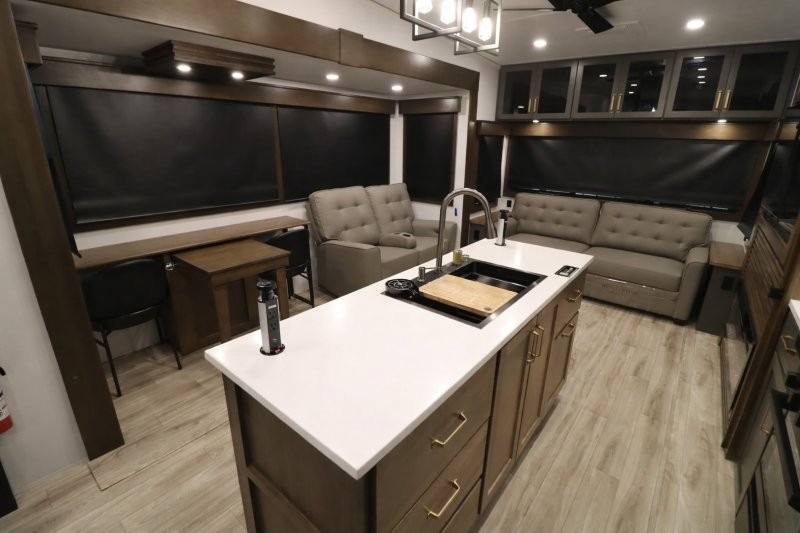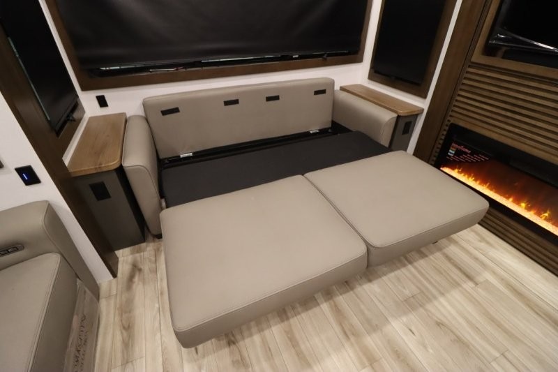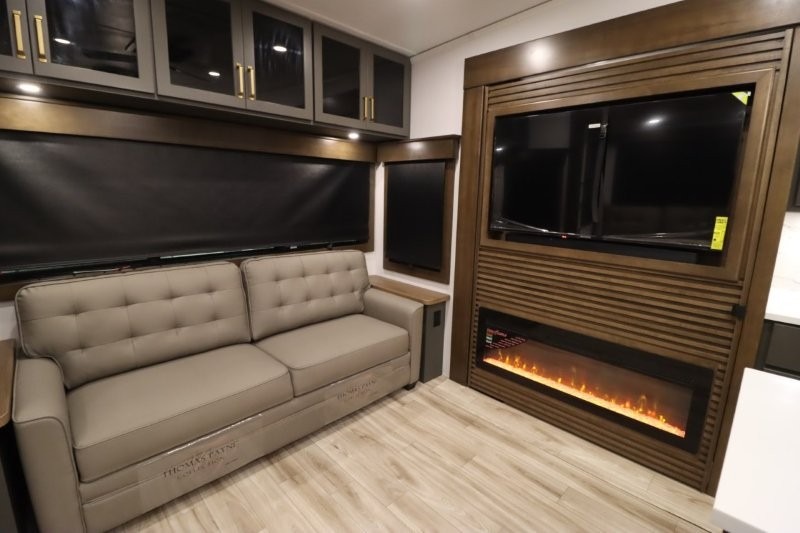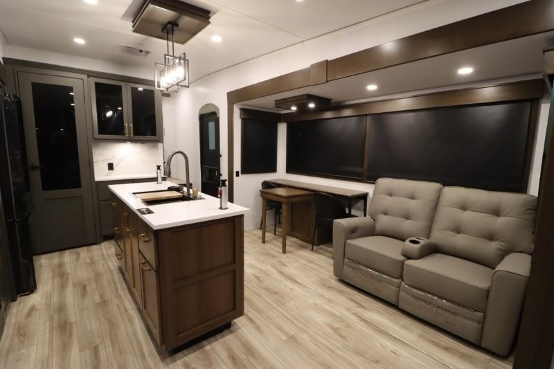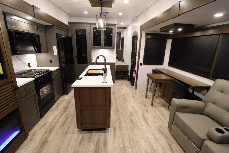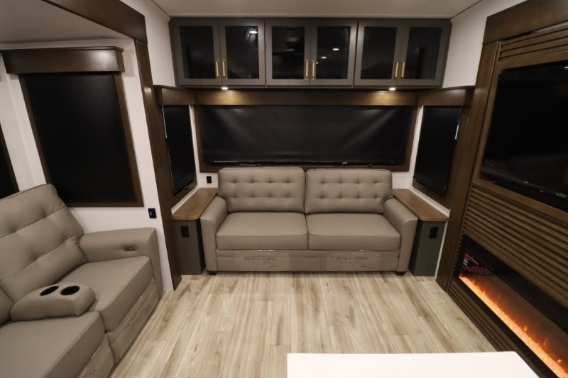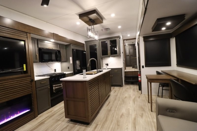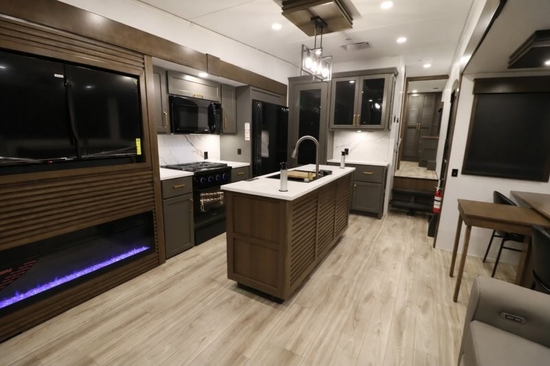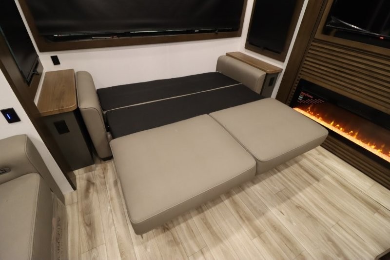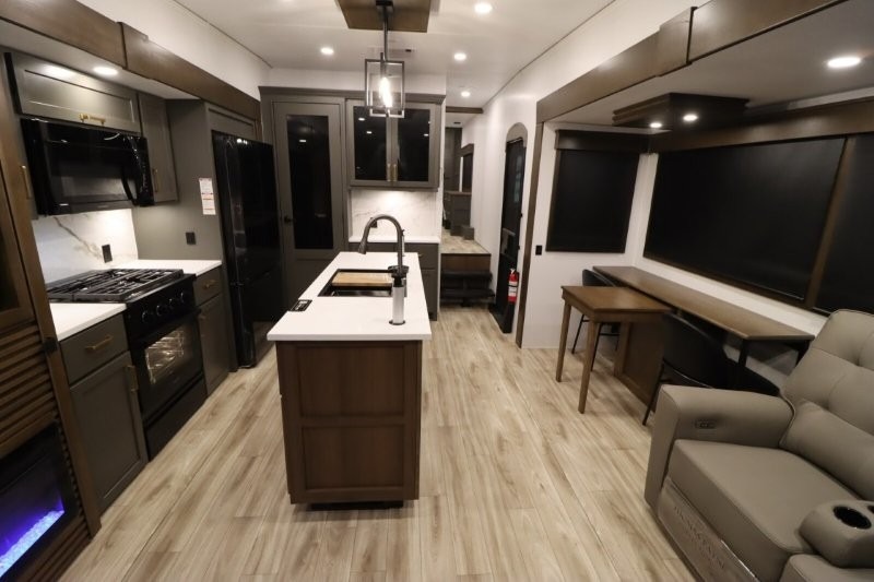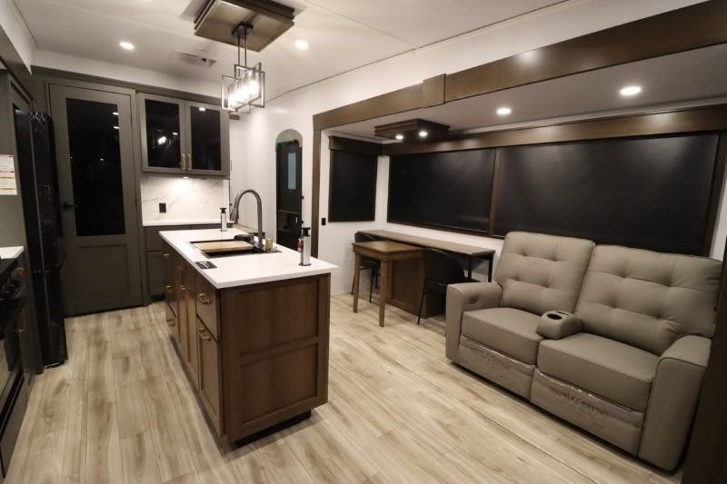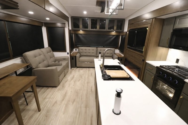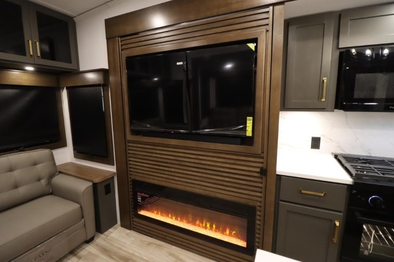 You'll love camping in this fifth wheel with a rear living room and triple slides for ample interior space! The sofa, theater seating, and adjustable sliding 'Deskette" with chairs will provide comfortable seating, dining, and working space, and the entertainment center with a fireplace will make it feel more like home. A large kitchen island gives you more counter space when making meals in the full kitchen, and the spacious full bath is a comfort you won't want to camp without. Up front, you'll find a private bedroom with a king bed slide, storage space and TV prep if you want the option to watch movies in bed.