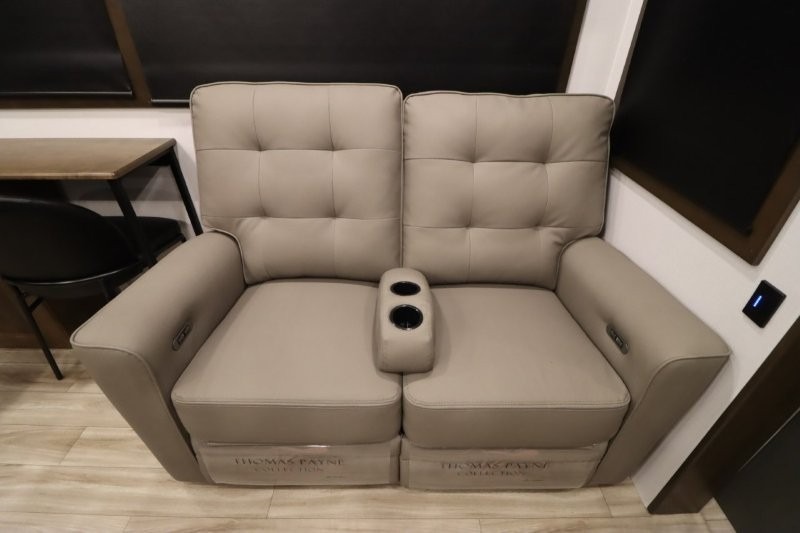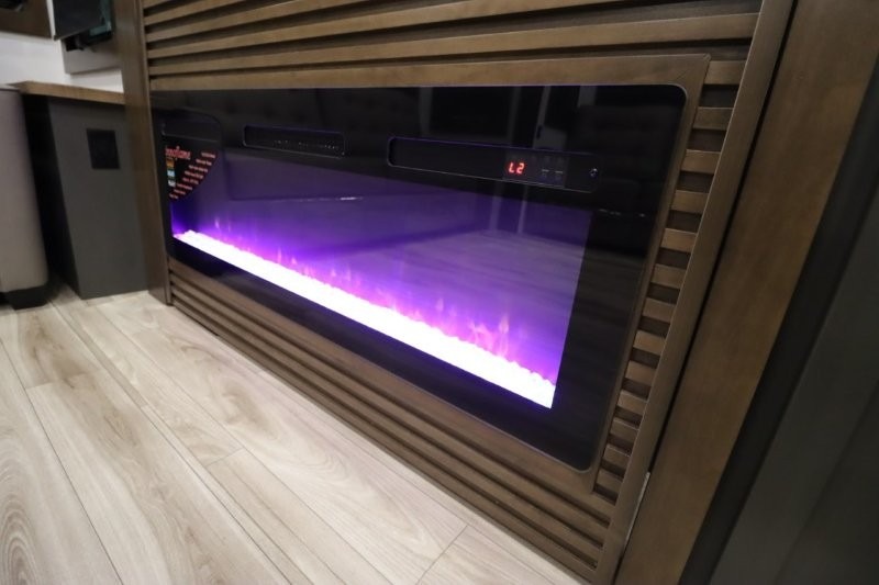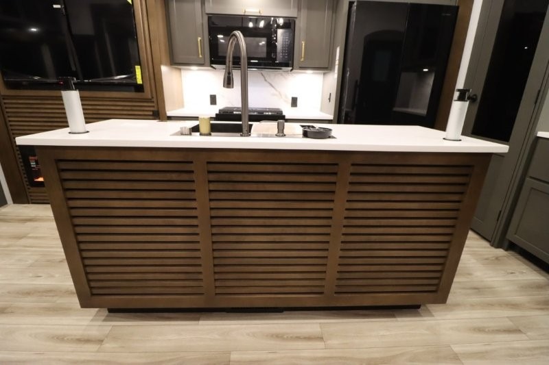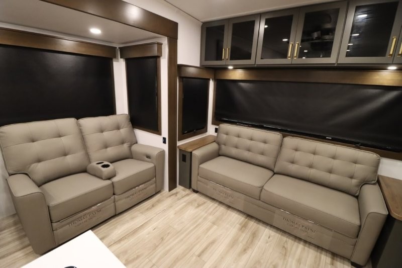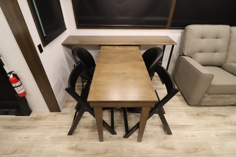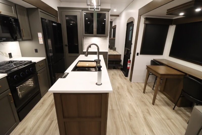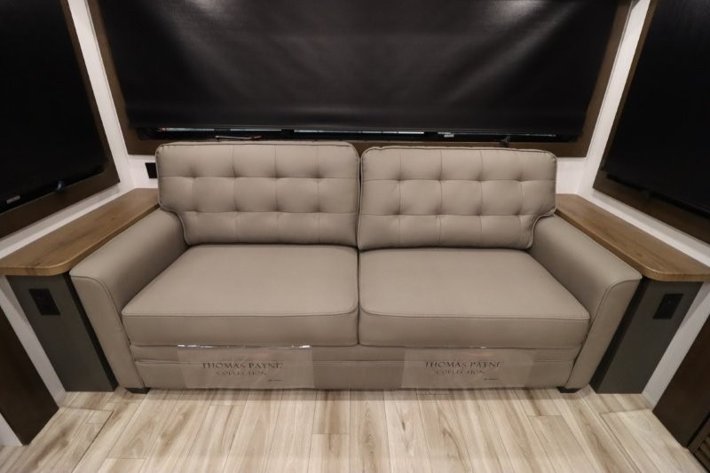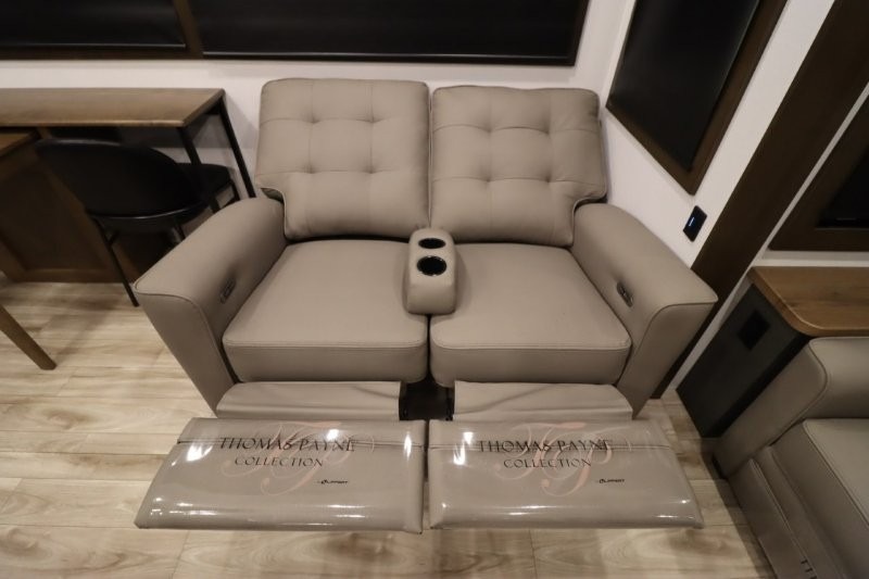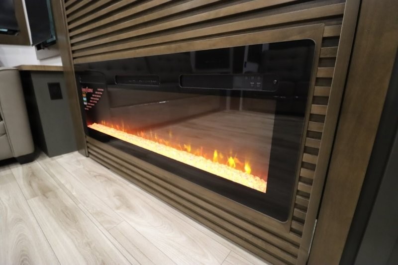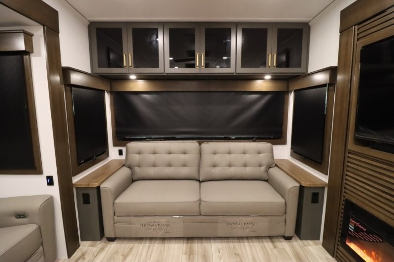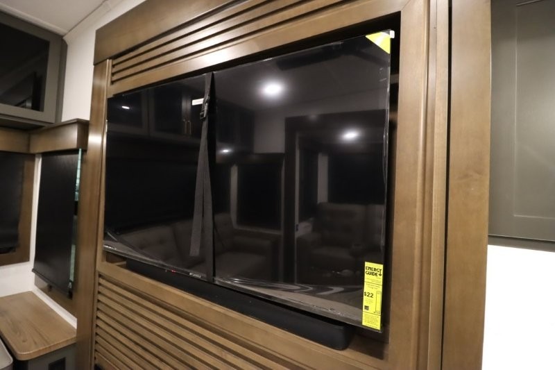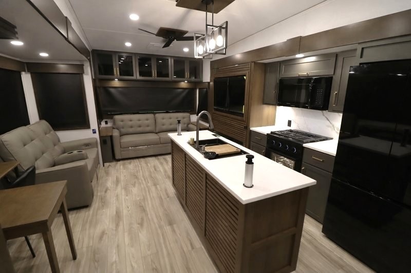 You'll love camping in this fifth wheel with a rear living room and triple slides for ample interior space! The sofa, theater seating, and adjustable sliding 'Deskette" with chairs will provide comfortable seating, dining, and working space, and the entertainment center with a fireplace will make it feel more like home. A large kitchen island gives you more counter space when making meals in the full kitchen, and the spacious full bath is a comfort you won't want to camp without. Up front, you'll find a private bedroom with a king bed slide, storage space and TV prep if you want the option to watch movies in bed.