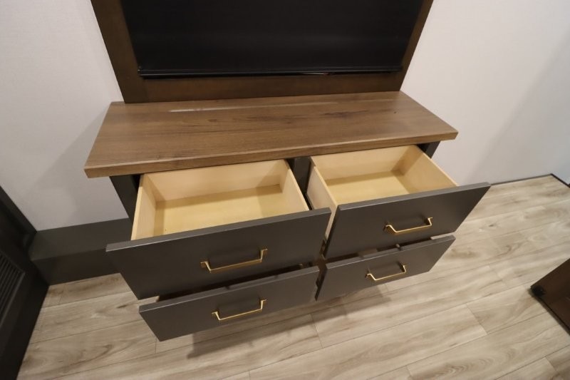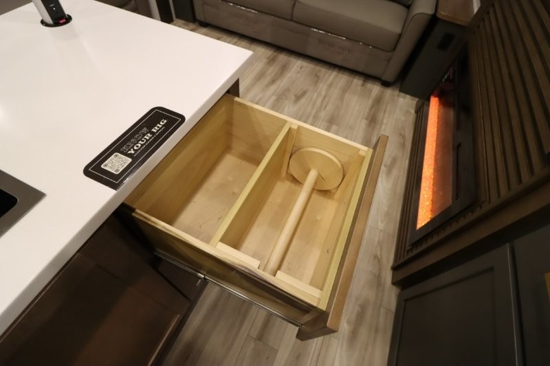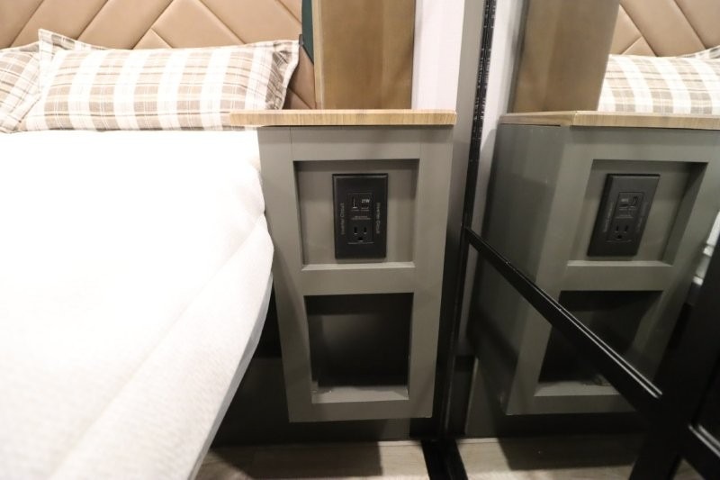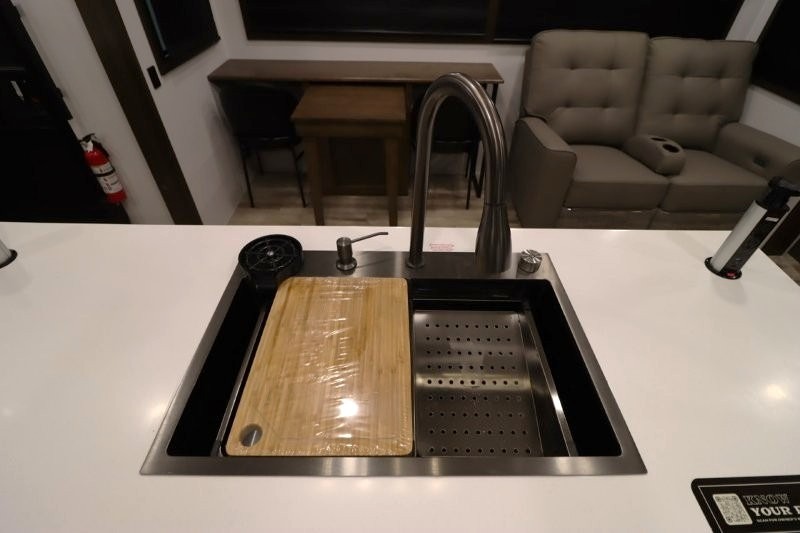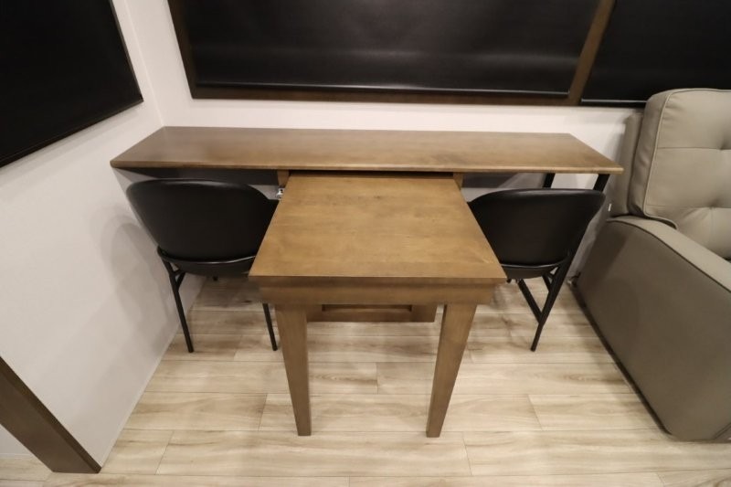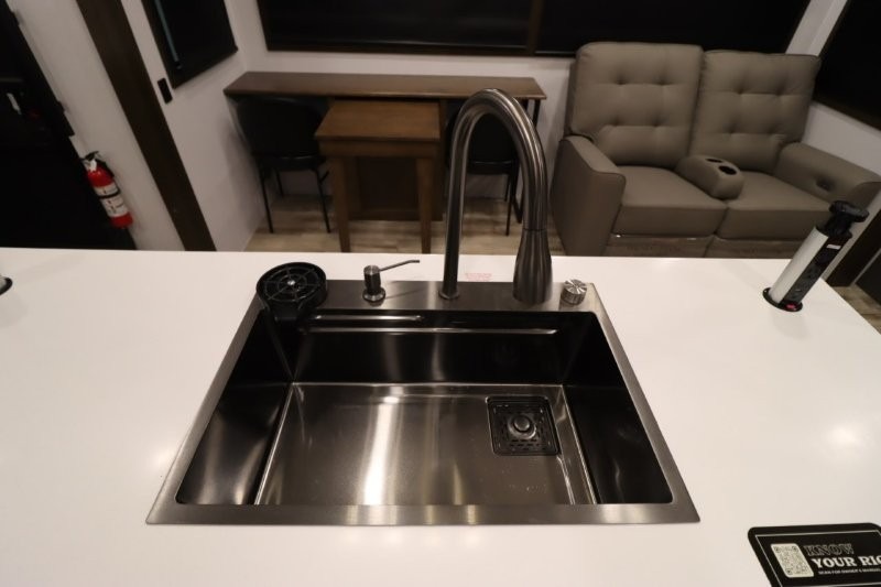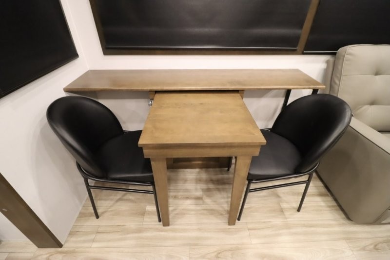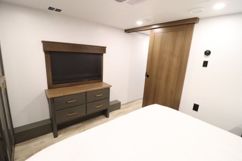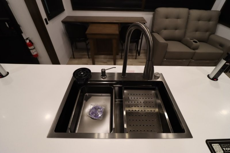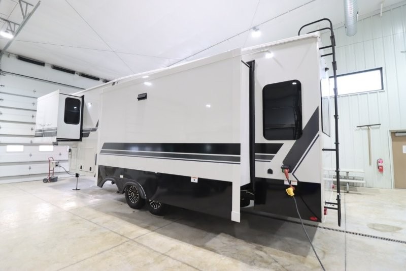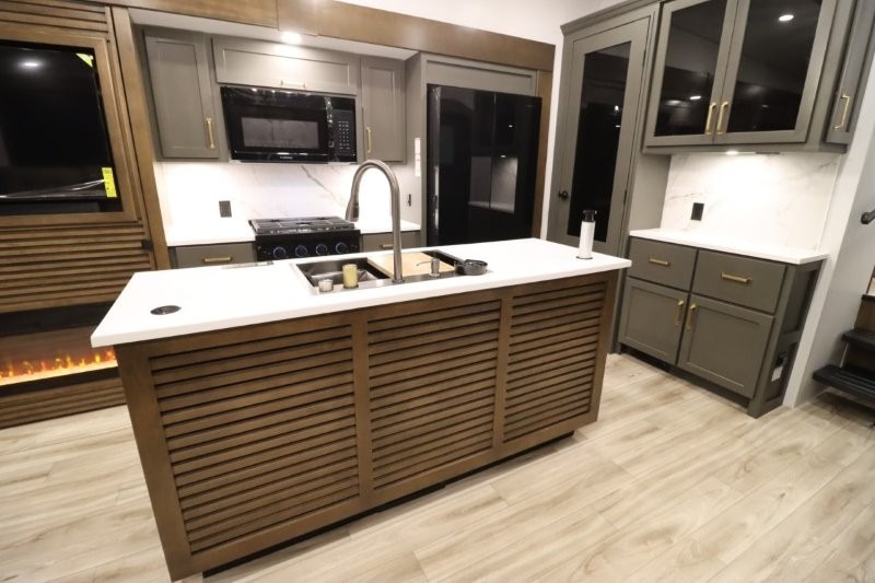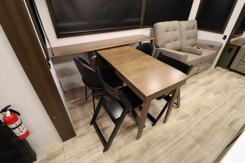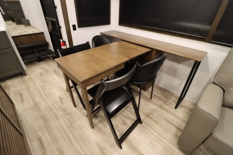 You'll love camping in this fifth wheel with a rear living room and triple slides for ample interior space! The sofa, theater seating, and adjustable sliding 'Deskette" with chairs will provide comfortable seating, dining, and working space, and the entertainment center with a fireplace will make it feel more like home. A large kitchen island gives you more counter space when making meals in the full kitchen, and the spacious full bath is a comfort you won't want to camp without. Up front, you'll find a private bedroom with a king bed slide, storage space and TV prep if you want the option to watch movies in bed.