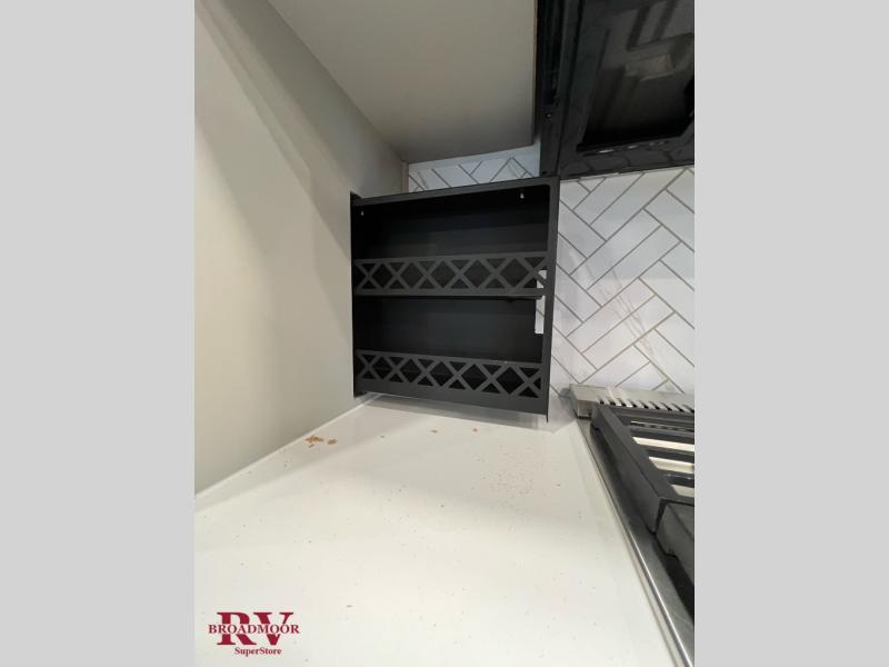 You can take this Montana High Country fifth wheel to the campsite of your choice! You'll have plenty of comfort with the king-size bed in the front master suite, and you can also let some friends or kids sleep on the hide-a-bed sofa in the rear living area. While you watch the 50" TV, you can sit back in the power theater seating, and you can switch on the fireplace for some added heat if it's cool outside. The opposing slides in the main living area are what give you extra space to work freely around the kitchen island, and the coffee station allows you to prepare your afternoon pick-me-up with all of your coffee essentials sitting in one place just like at home.