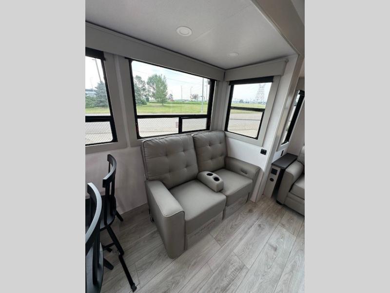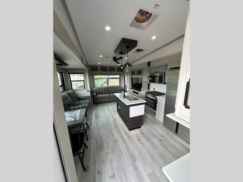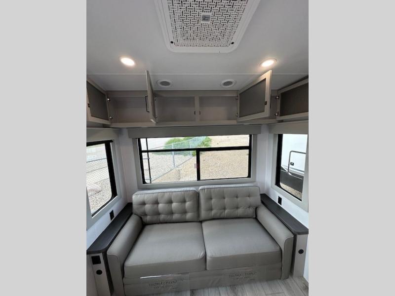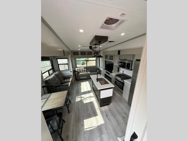 Live the high life with a Keystone Montana High Country fifth wheel! You'll have all the luxury you need with these units. They come with a MaxTurn™ front cap with KeyShield™ automotive-grade paint, a fully walkable roof with Alpha seamless TPO membrane system, and an insulated underbelly with forced hot air and electric tank heaters. The MORryde CRE3000 suspension with wet bolts helps provide a smooth tow, and the Ground Control® four-point electric auto-leveling with hitch memory will make set-up quite easy. The interior is elegantly appointed with the Thomas Payne Collection furniture, hardwood decorative slide-out fascia, Beauflor® vinyl throughout, accent crown molding, and premium solid surface kitchen countertops.