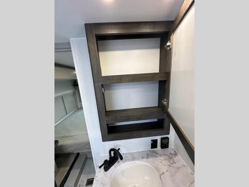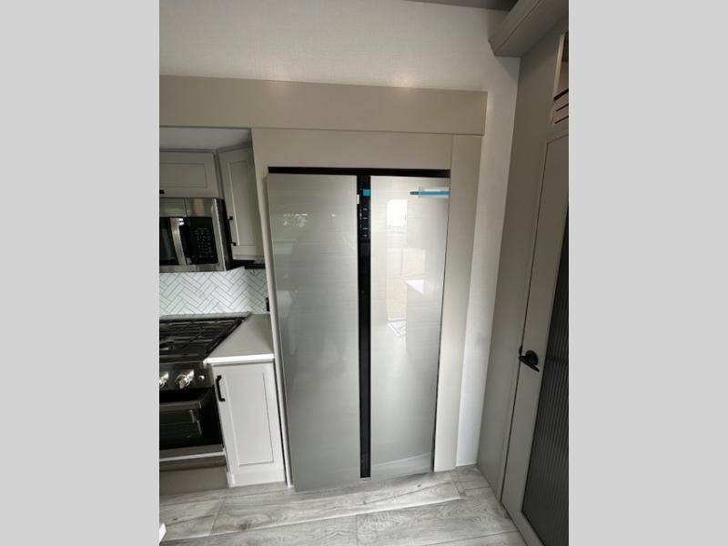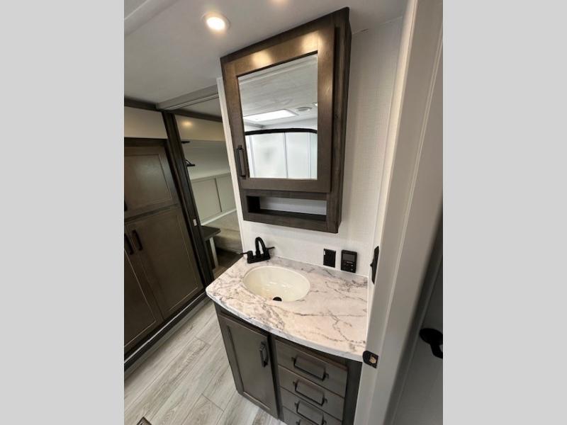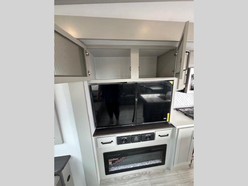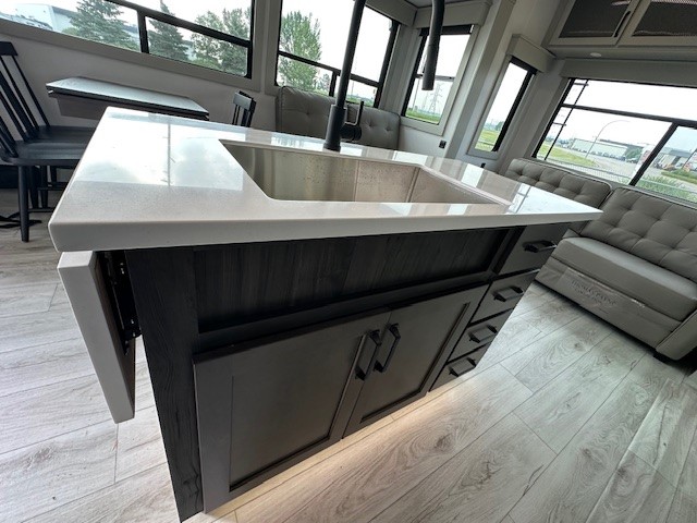 You can take this Montana High Country fifth wheel to the campsite of your choice! You'll have plenty of comfort with the king-size bed in the front master suite, and you can also let some friends or kids sleep on the hide-a-bed sofa in the rear living area. While you watch the 50" TV, you can sit back in the power theater seating, and you can switch on the fireplace for some added heat if it's cool outside. The opposing slides in the main living area are what give you extra space to work freely around the kitchen island, and the coffee station allows you to prepare your afternoon pick-me-up with all of your coffee essentials sitting in one place just like at home.